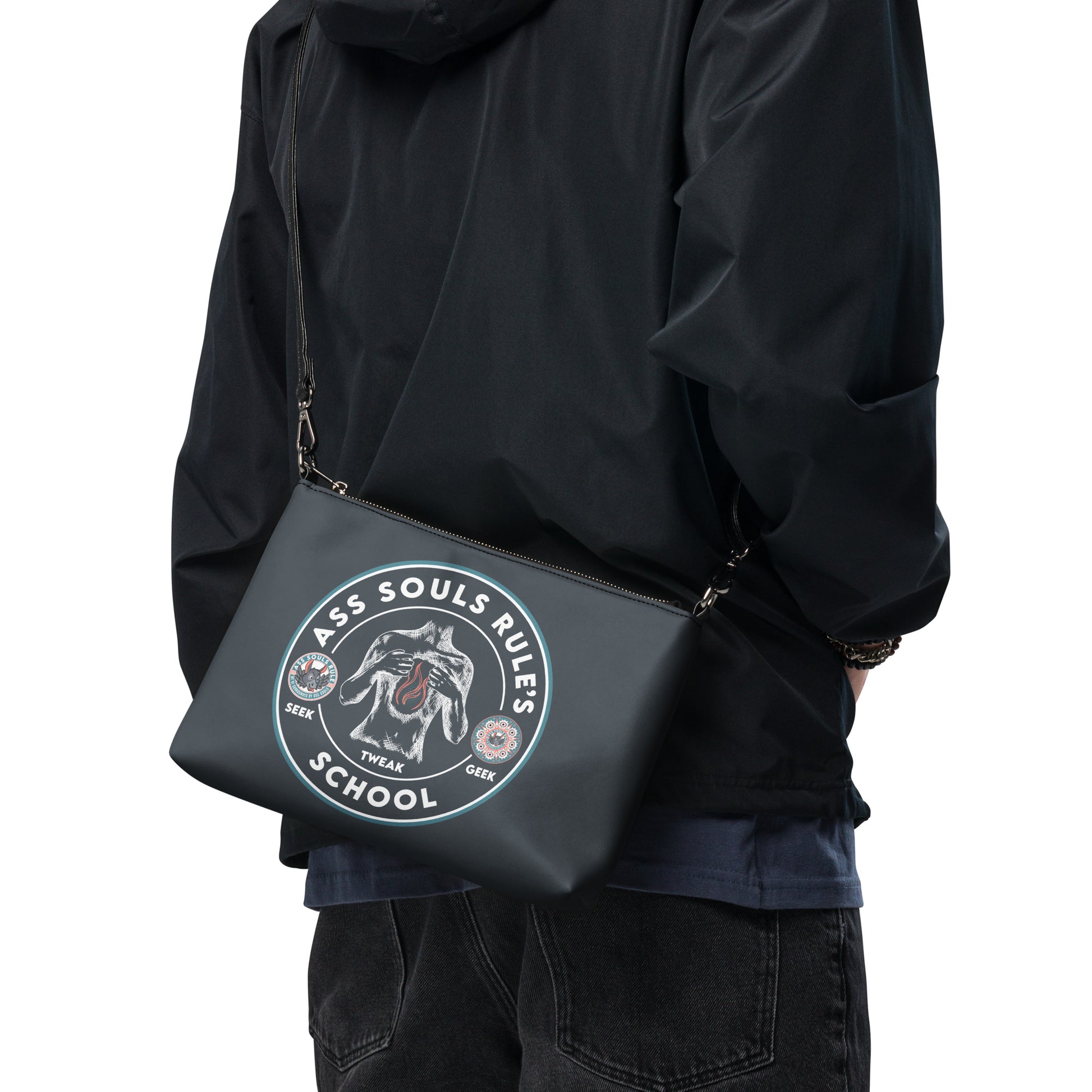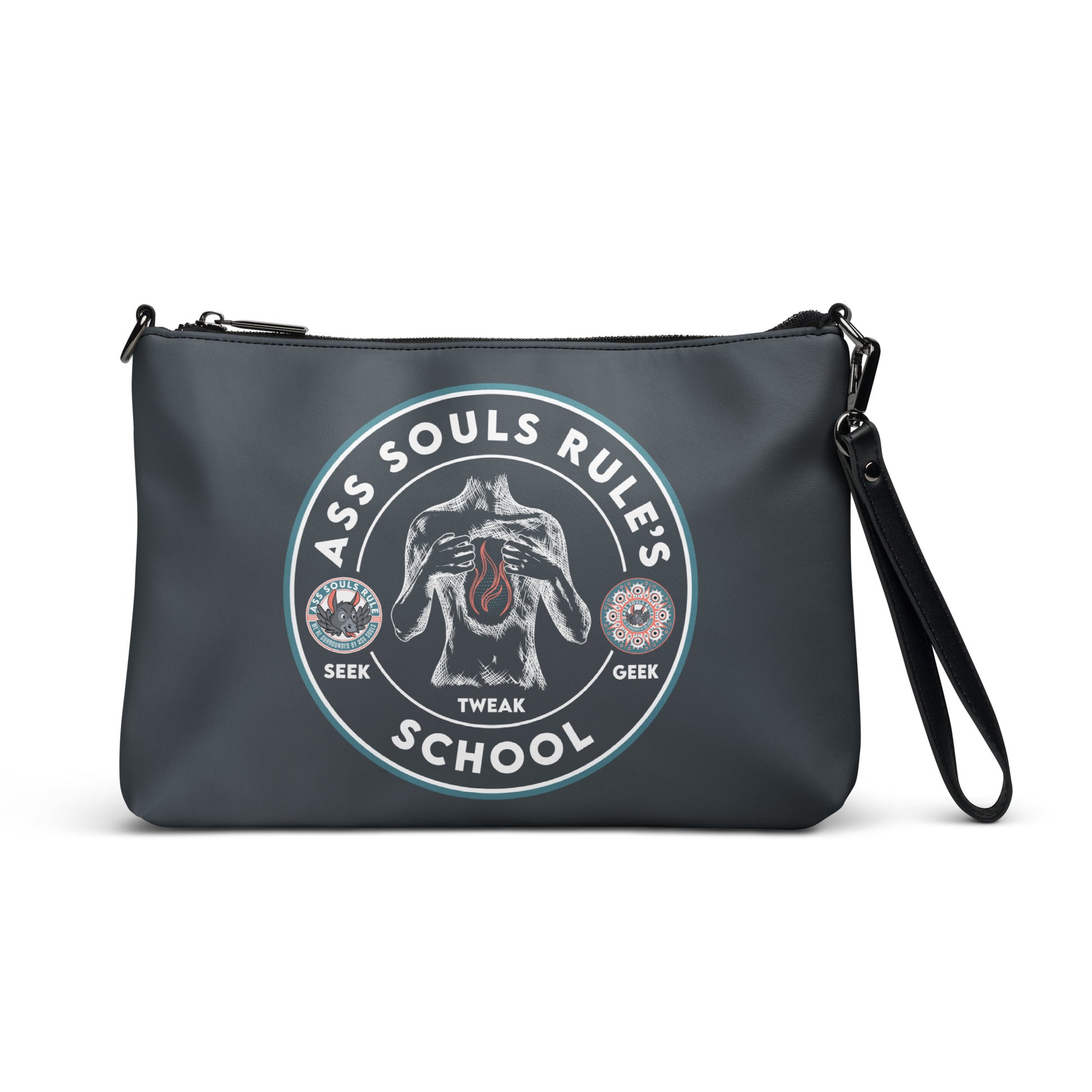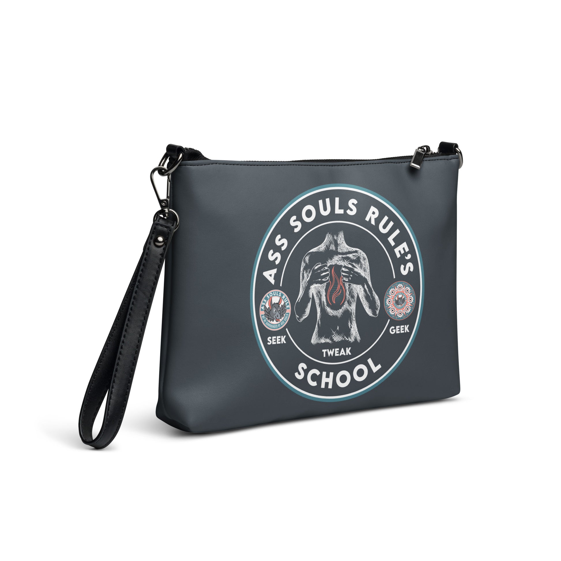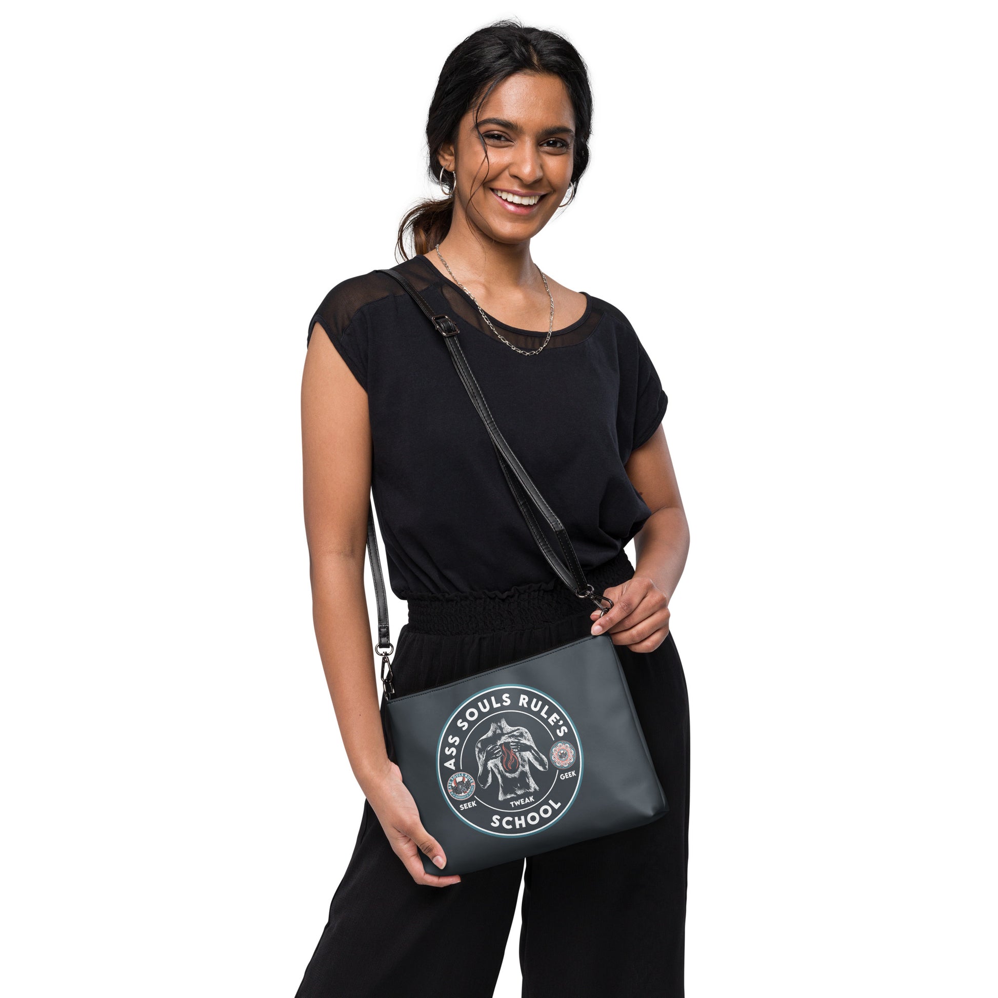 Keep your back to Ass Souls Rule's School style on point and your hands free with our versatile crossbody bag dark version. It’s made of premium faux leather and features dark gray hardware. Thanks to the zip-top closure and multiple inside pockets, you can keep your essentials secure and organized. Transform this crossbody bag with removable wrist and shoulder straps to style it for day-to-night looks.