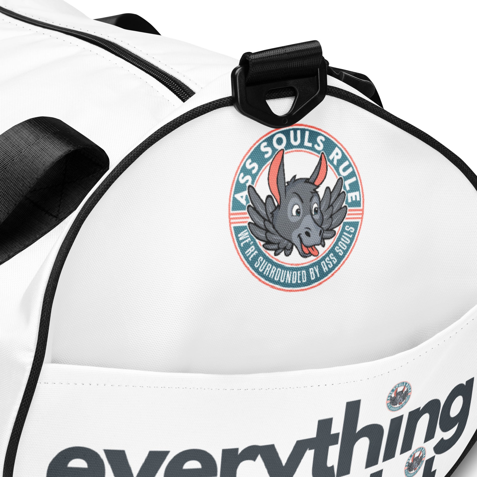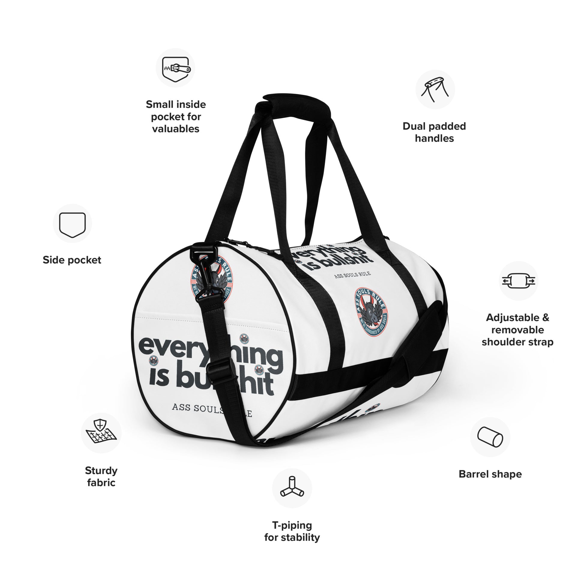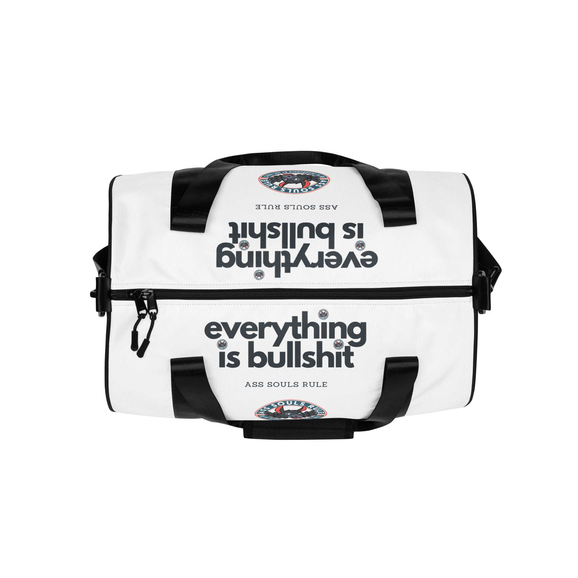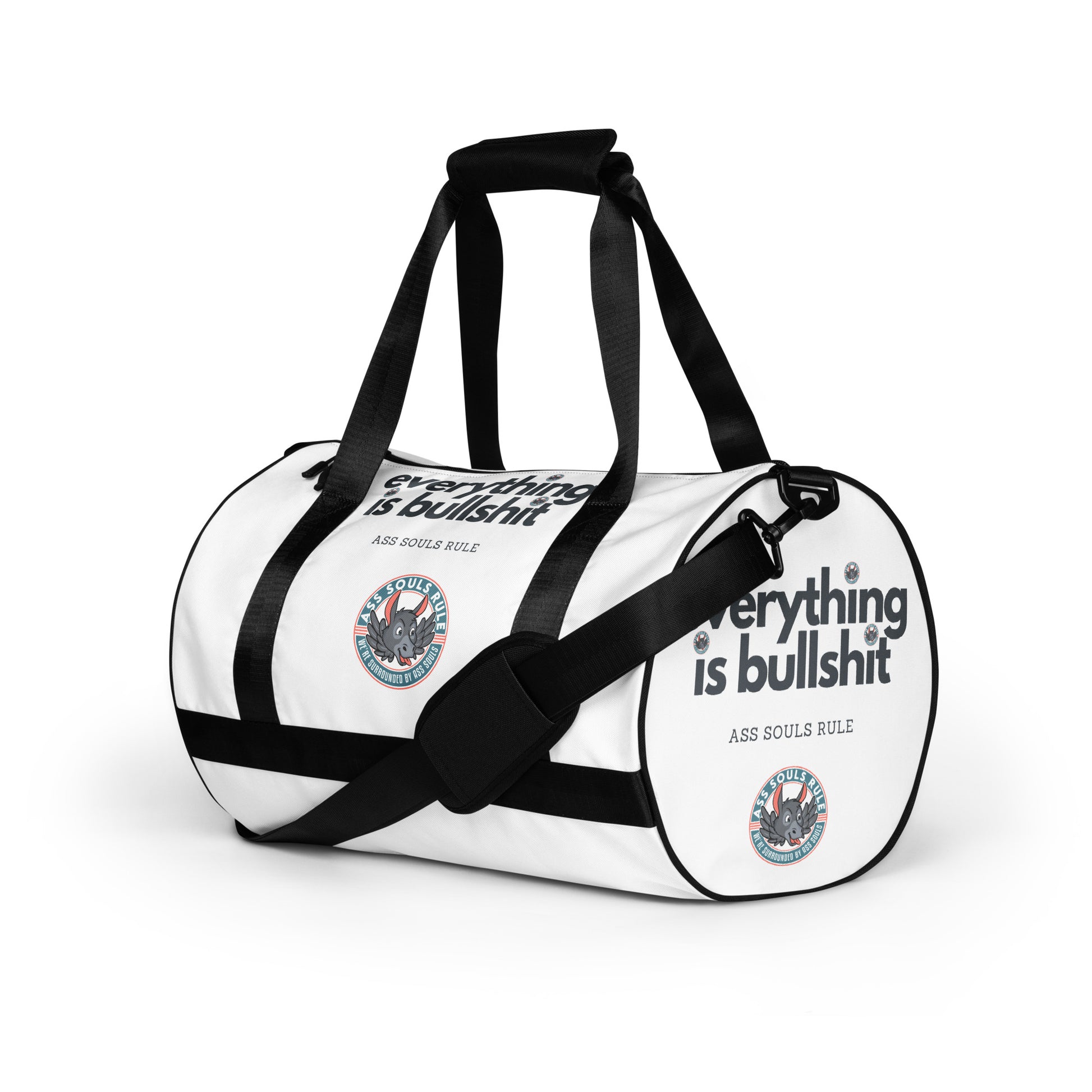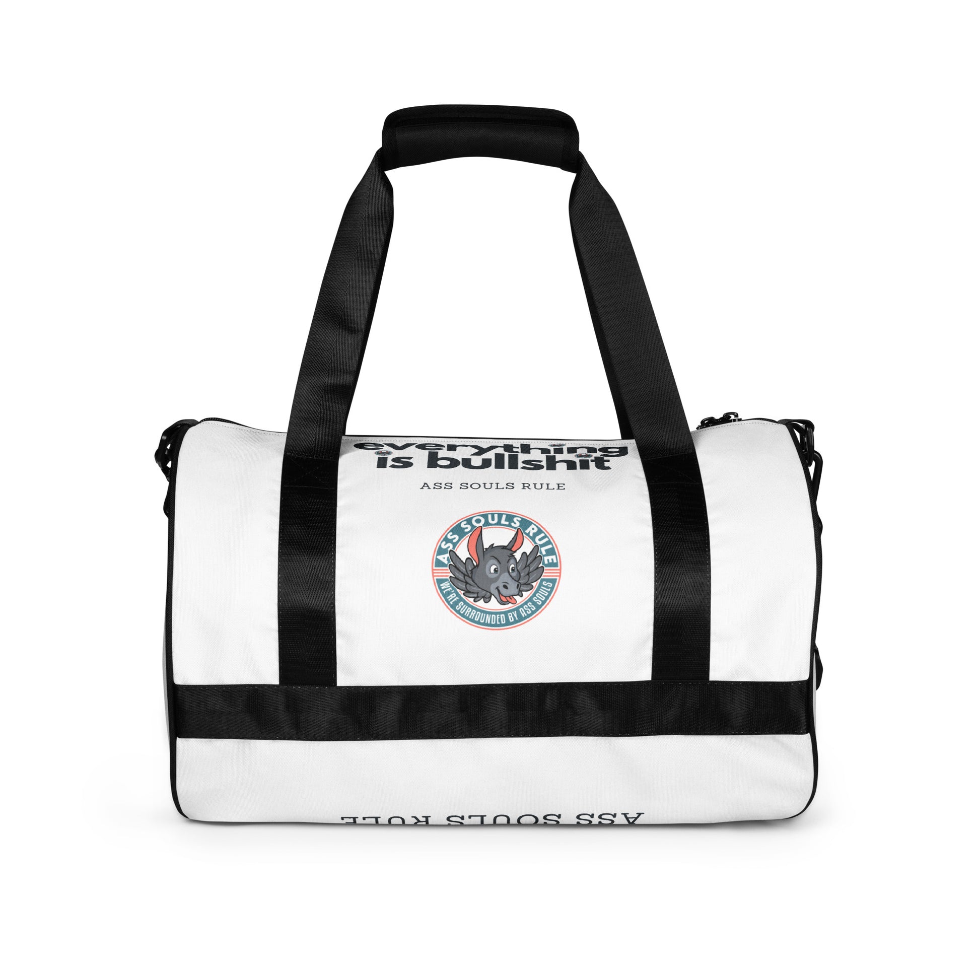 Ready to get your fitness on by moving your ass with some Ass Souls Rule style? Add some punch to pumping iron with this all-over print gym bag. Made from 100% polyester and sturdy, water-resistant fabric, this bag is fun meets function. And it’s got pockets!