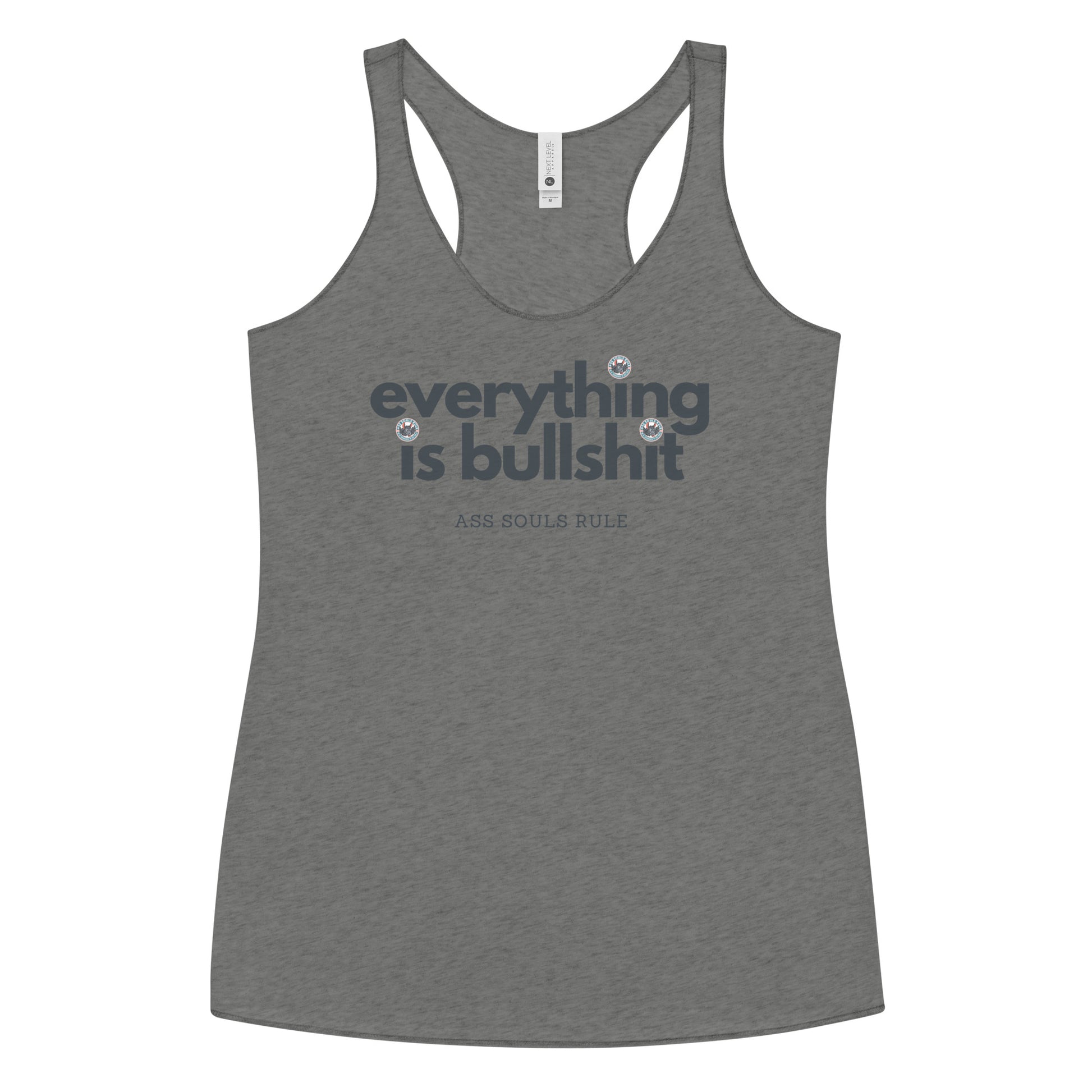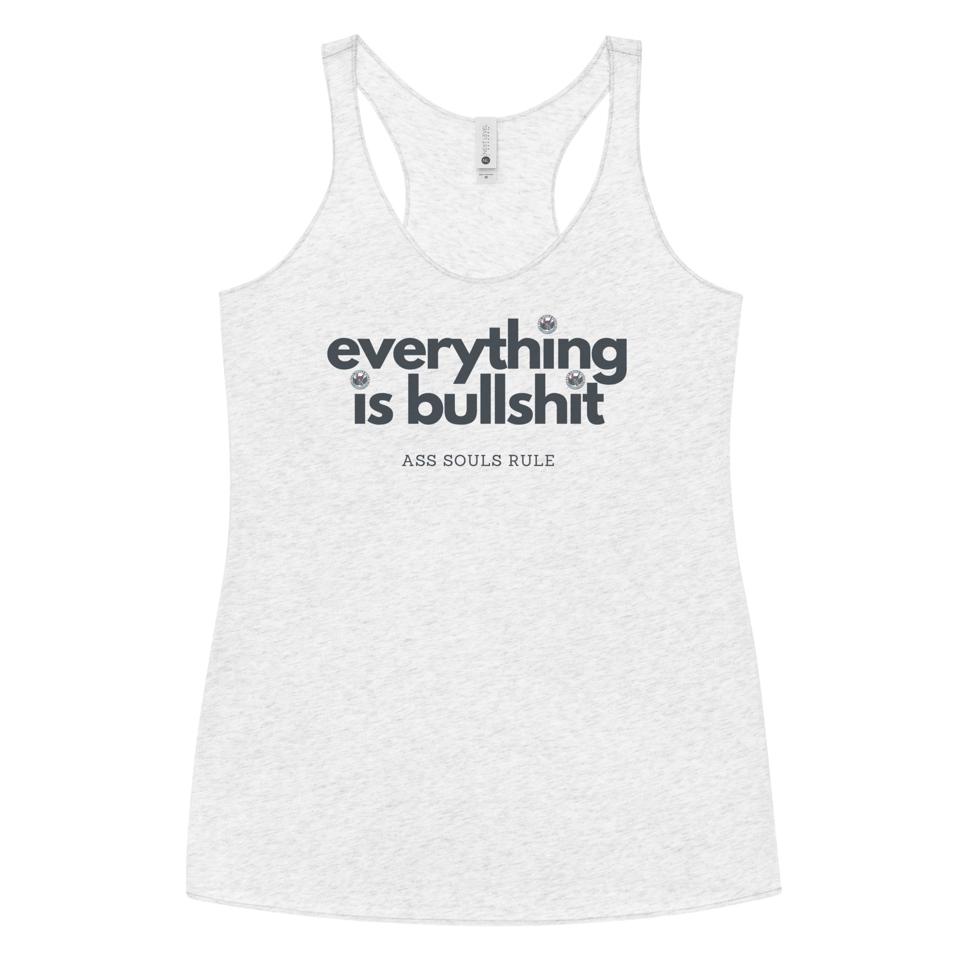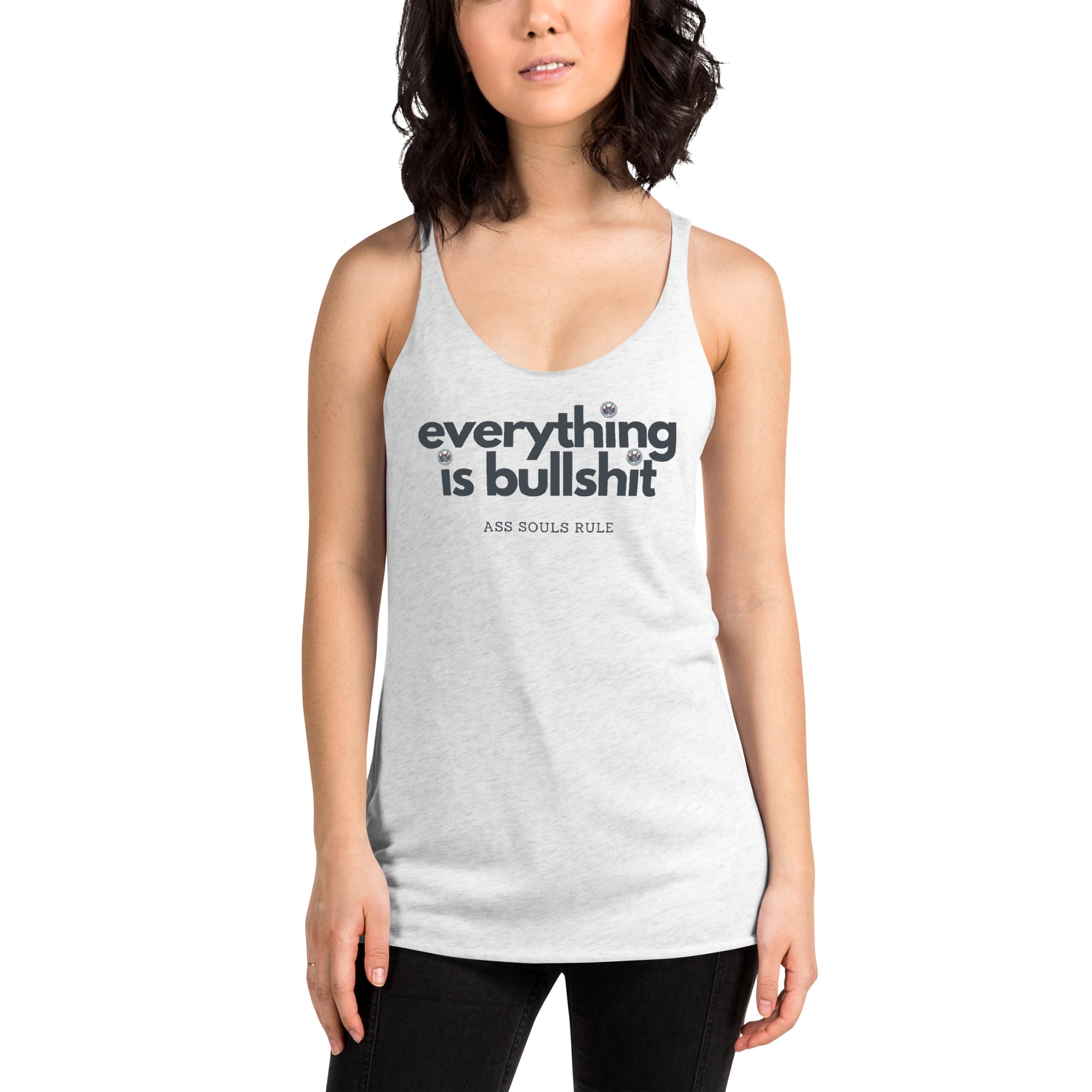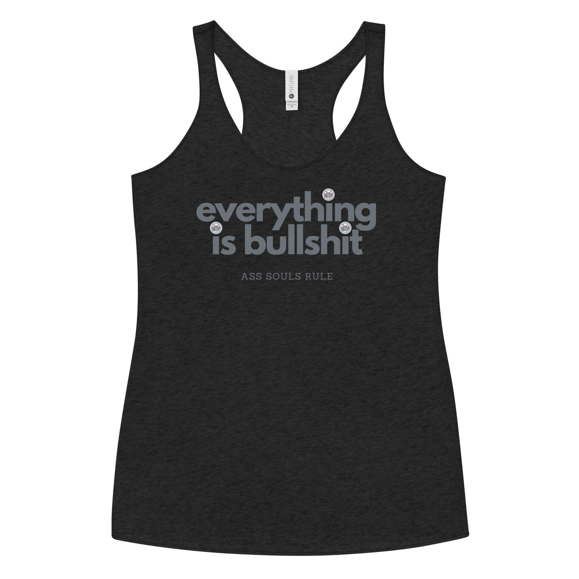 This Everything is Bullshit racerback tank is soft, lightweight, and form-fitting with a flattering cut and raw edge seams for an edgy Ass Souls Rule touch.