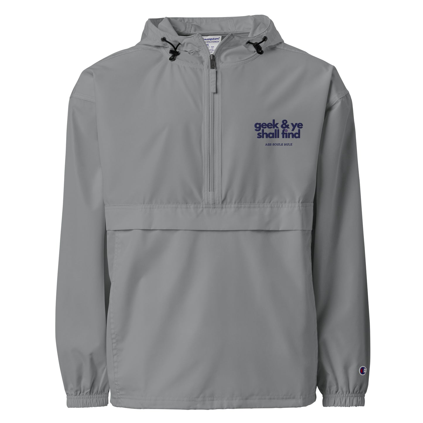 Protect yourself from the elements with this Champion packable Geek & Ye Shall Find jacket. This wind and rain resistant polyester jacket with a detailed embroidery design has a practical hood, front kangaroo pocket, and zipped pouch pocket which you can pull out and use to scrunch the jacket into for convenient storage. Perfect for Ass Souls Rules' School Field Trips.