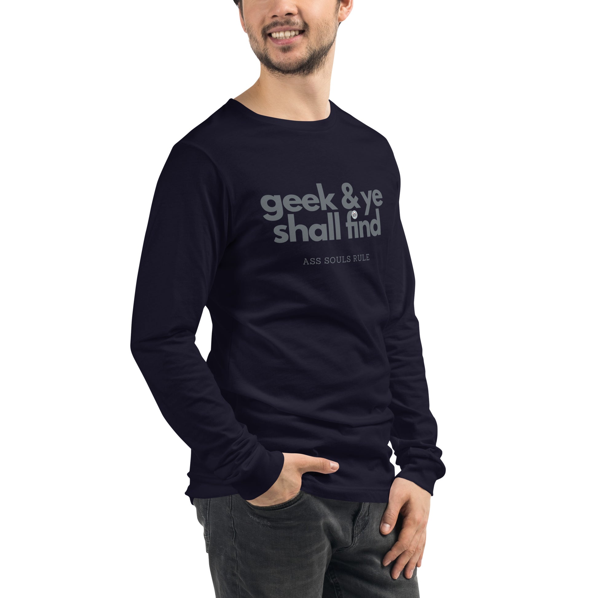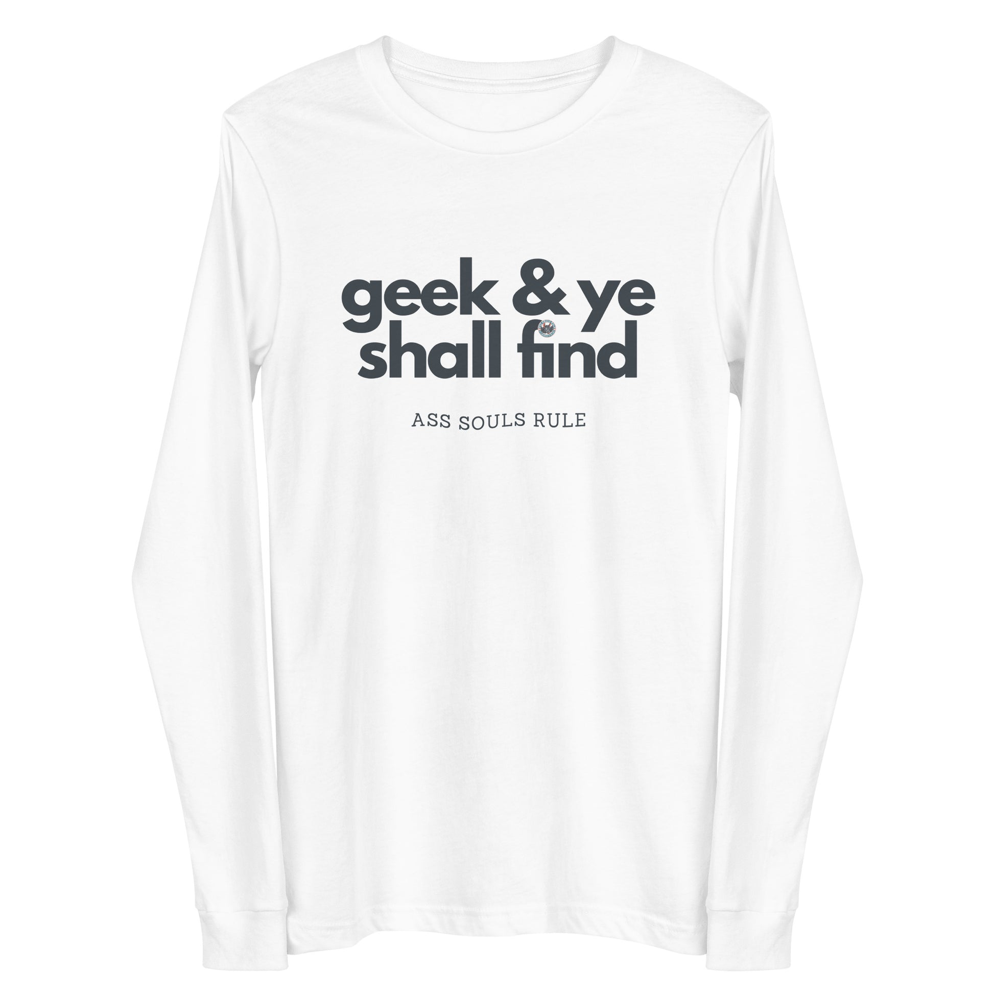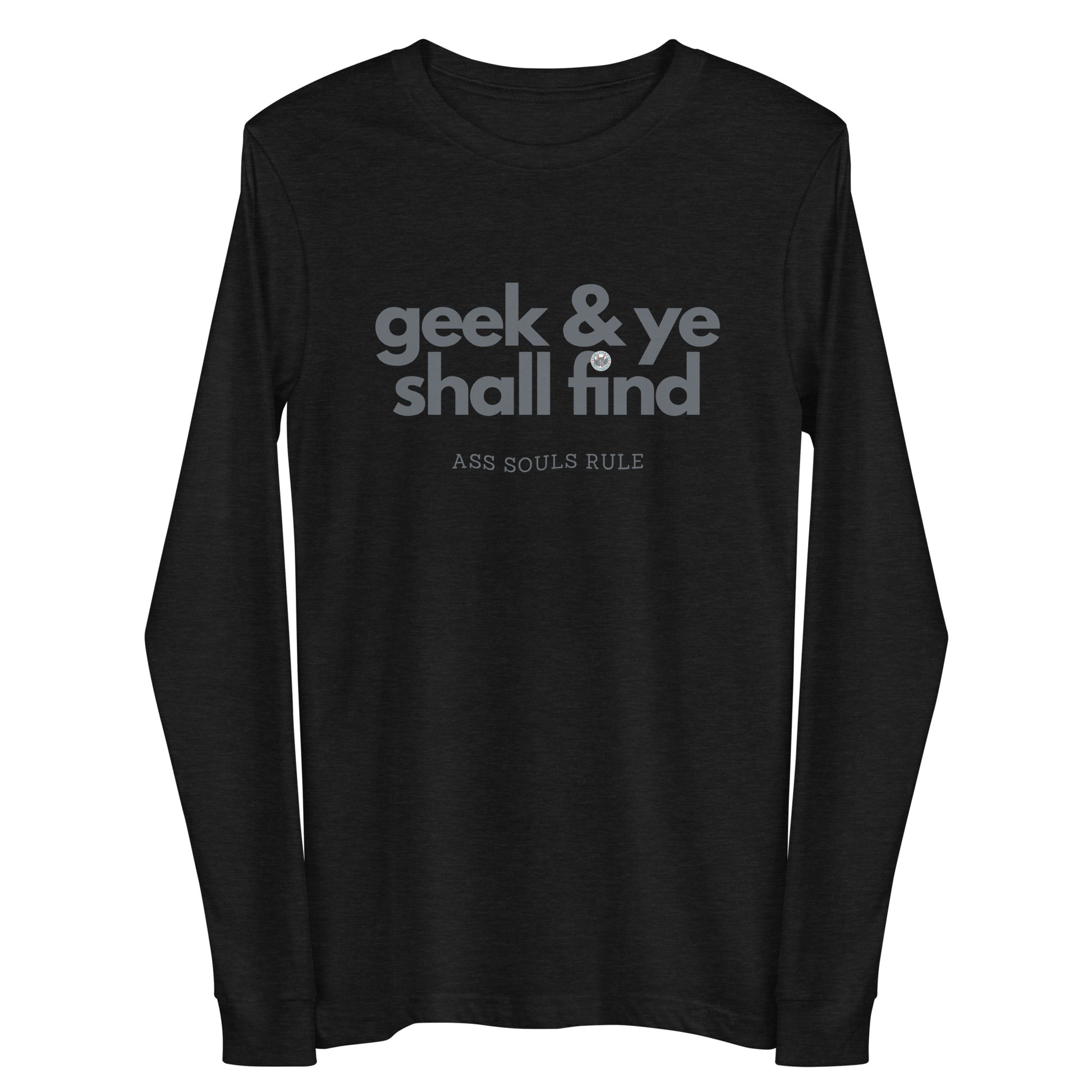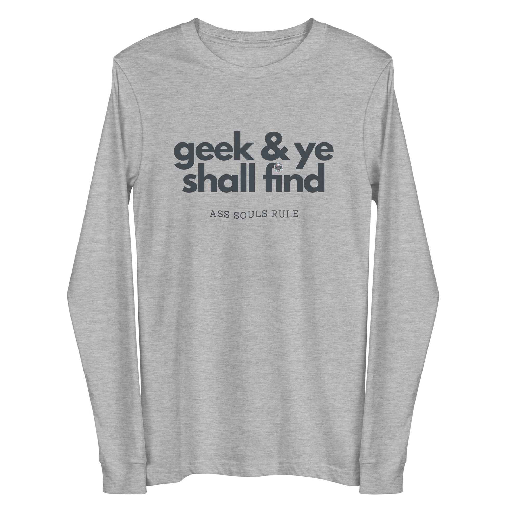 Enrich your Ass Souls Rule wardrobe with a versatile Geek & Ye Shall Find long sleeve tee. For a casual look, combine it with your favorite jeans, and layer it with a button-up shirt, a zip-up hoodie, or a snazzy jacket. Dress it up with formal trousers or chinos to achieve a more professional look. Geek is professional...
