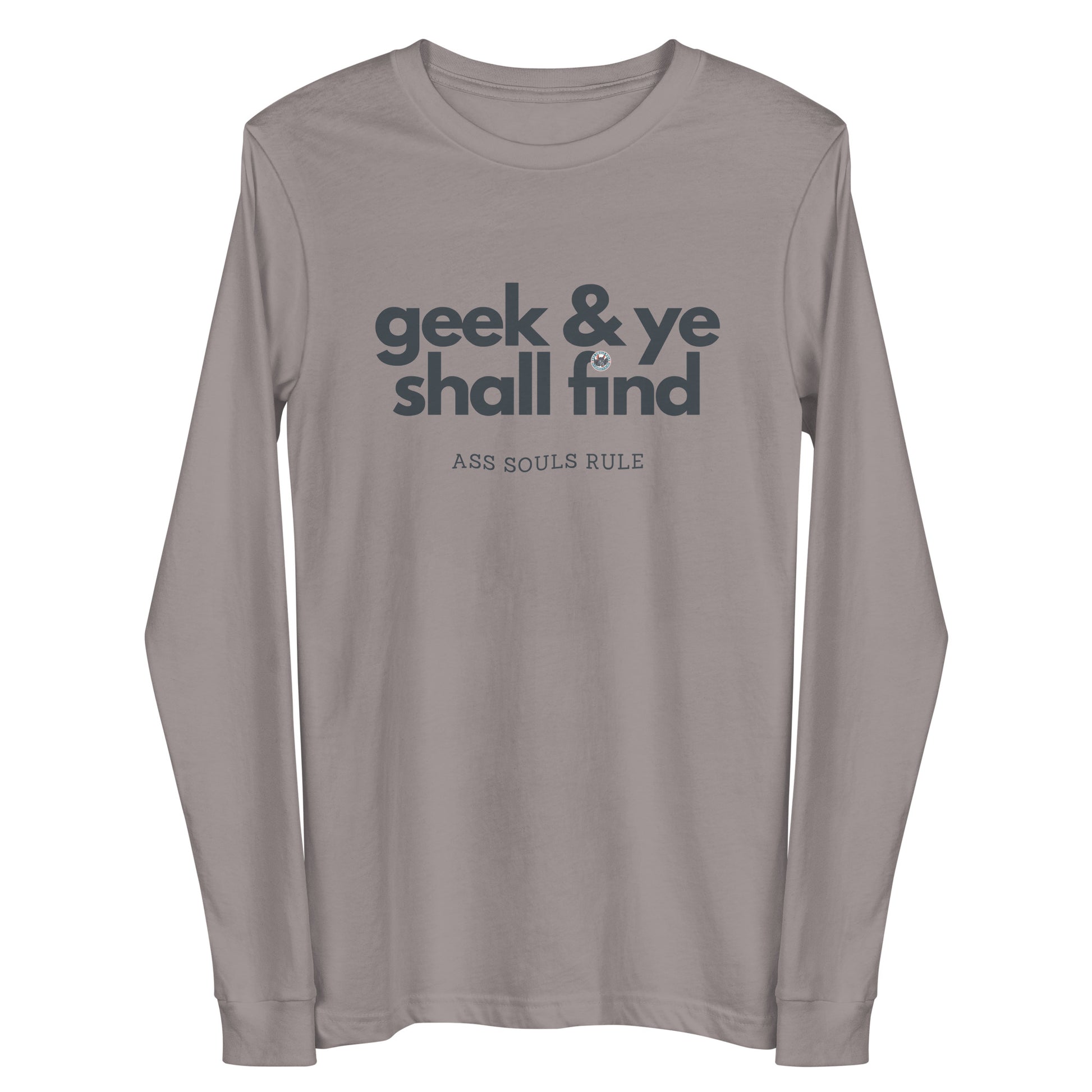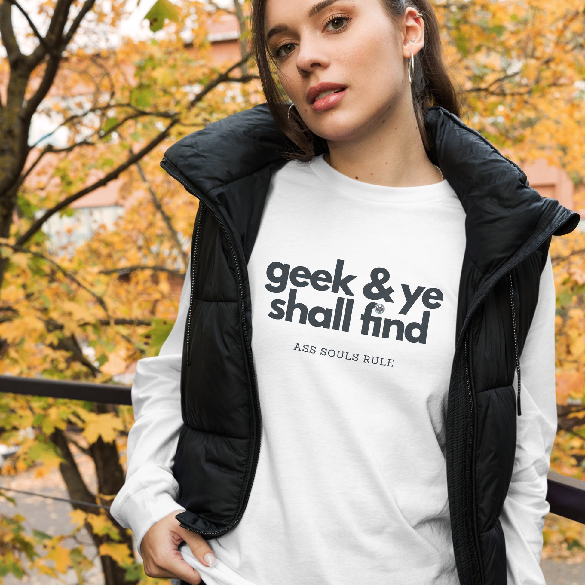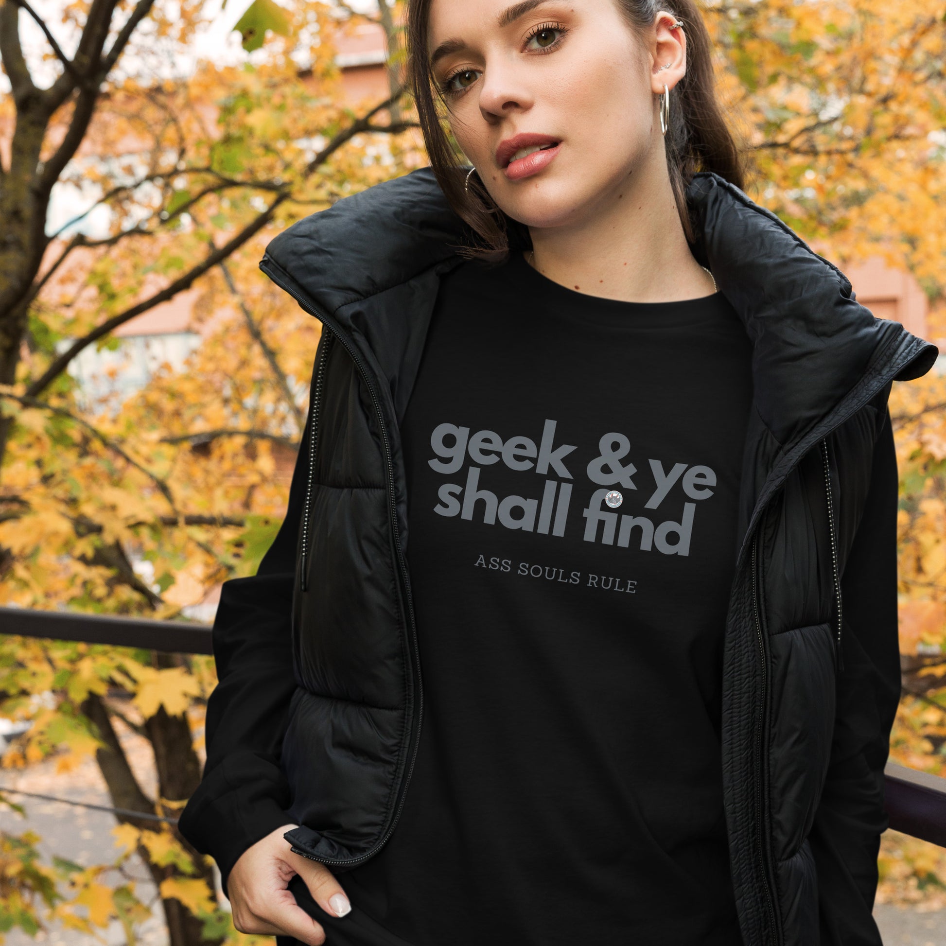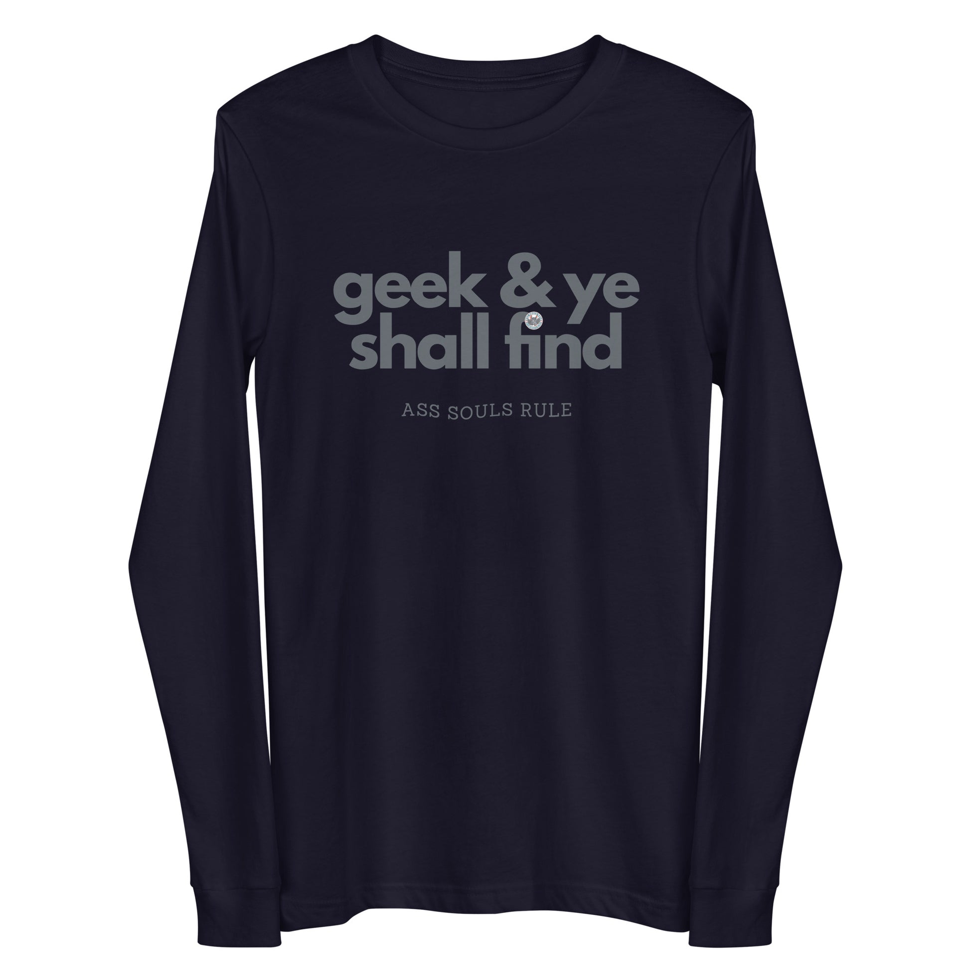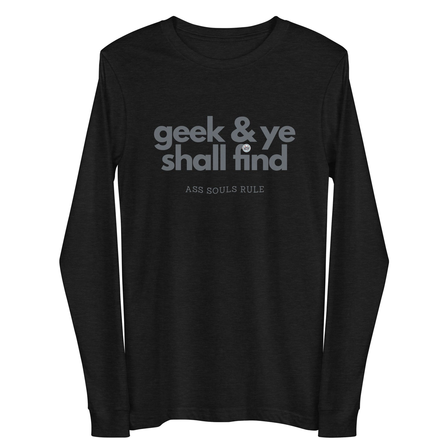 Enrich your Ass Souls Rule wardrobe with a versatile Geek & Ye Shall Find long sleeve tee. For a casual look, combine it with your favorite jeans, and layer it with a button-up shirt, a zip-up hoodie, or a snazzy jacket. Dress it up with formal trousers or chinos to achieve a more professional look. Geek is professional...