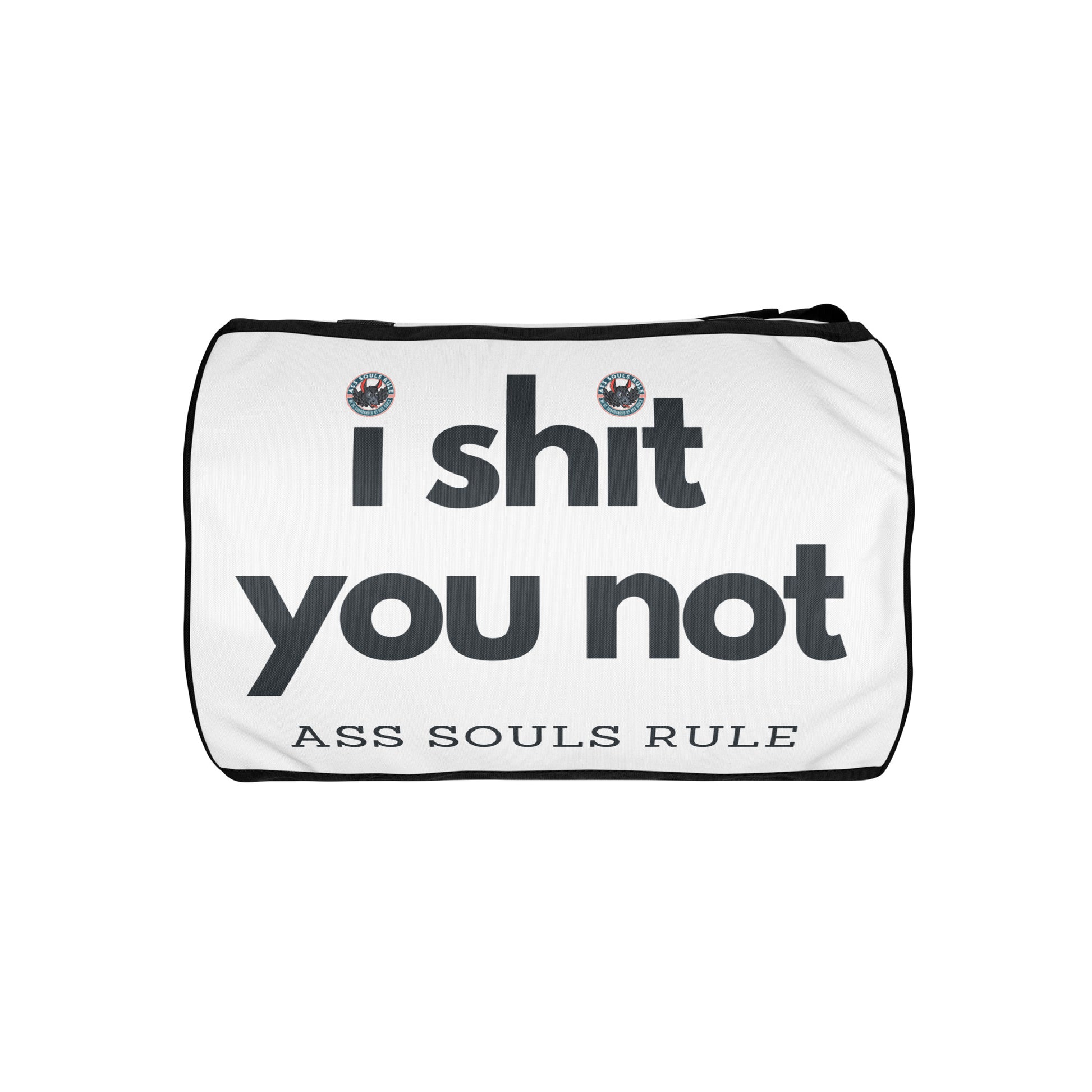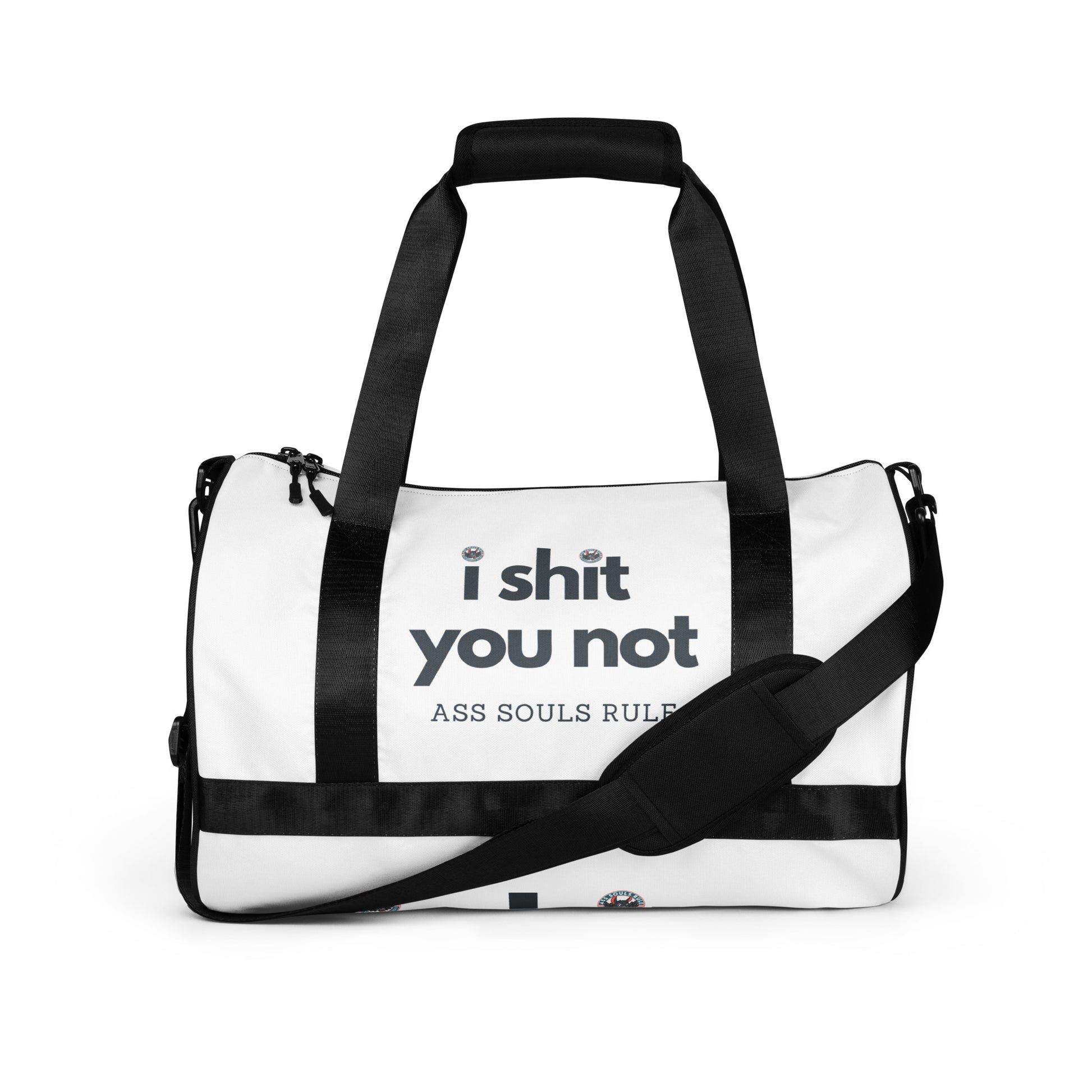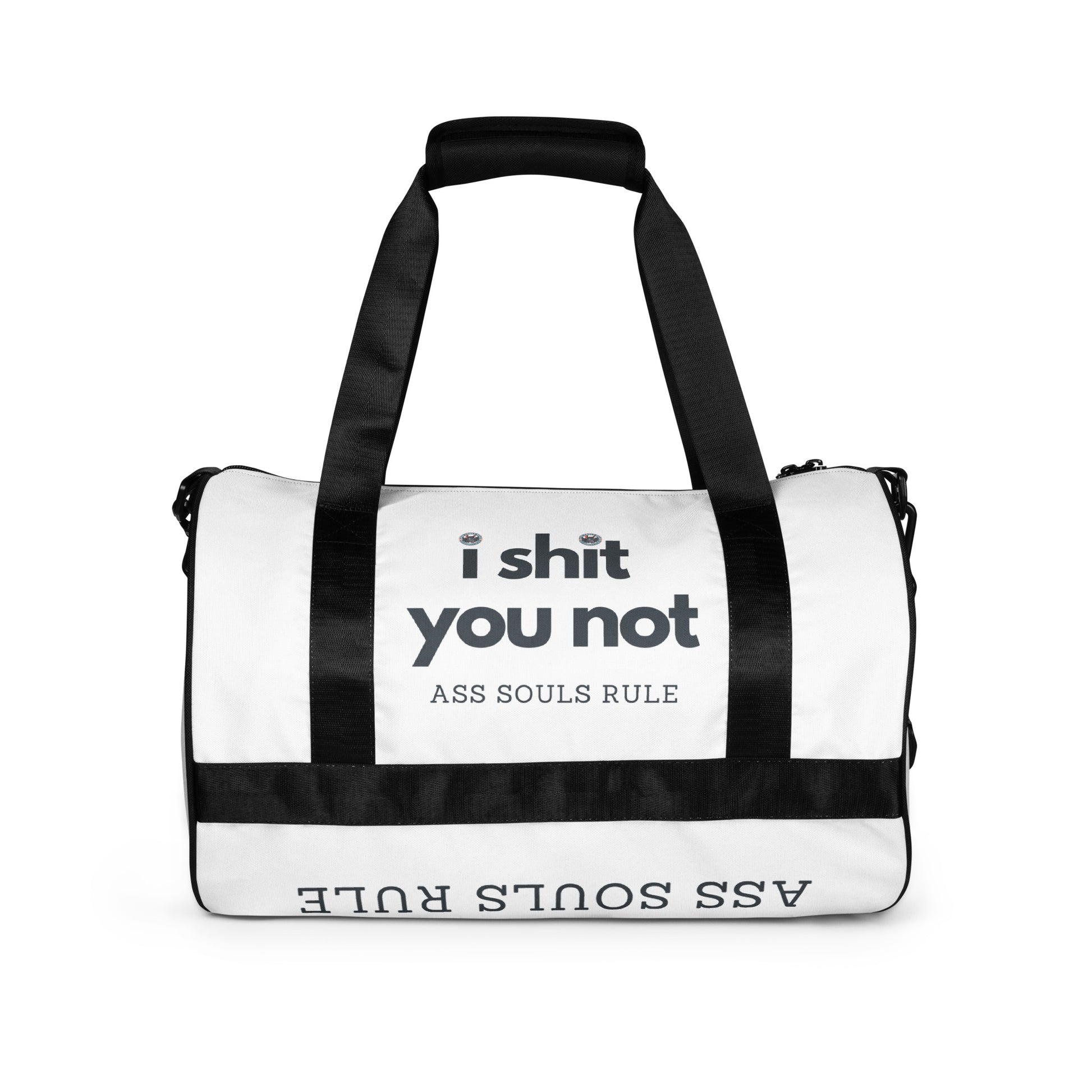 Ready to get your fitness game-on or work those Ass Souls out of your system? Add some punch to pumping iron with this I Shit You Not gym bag. Made from 100% polyester and sturdy, water-resistant fabric, this bag is fun meets function. And it’s got pockets!