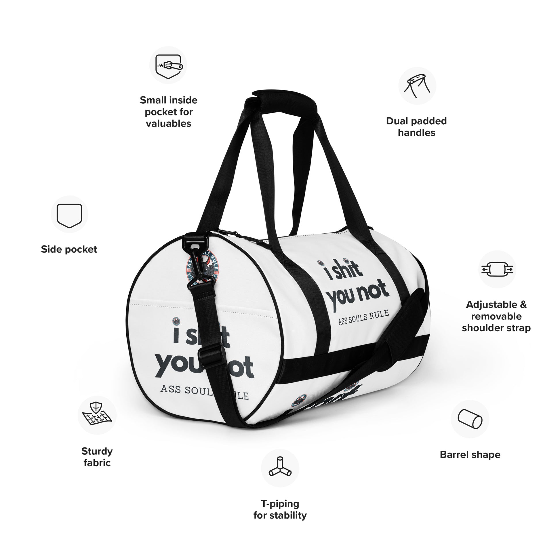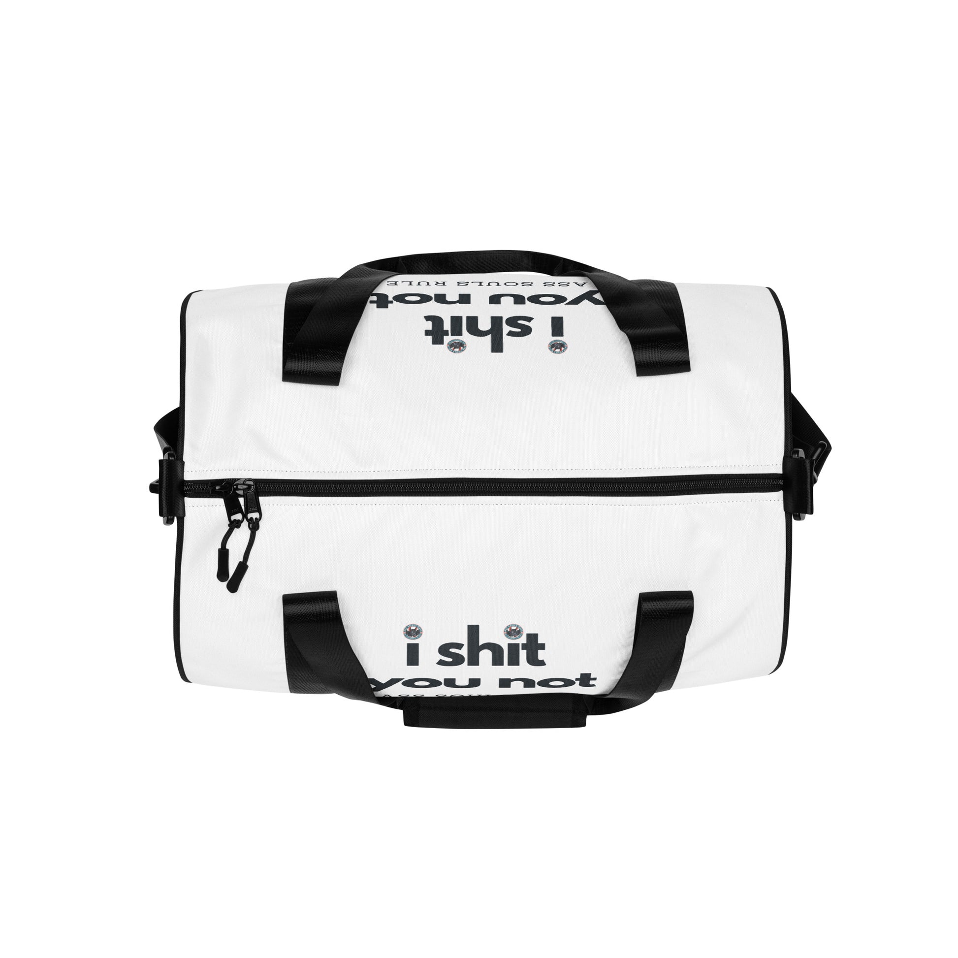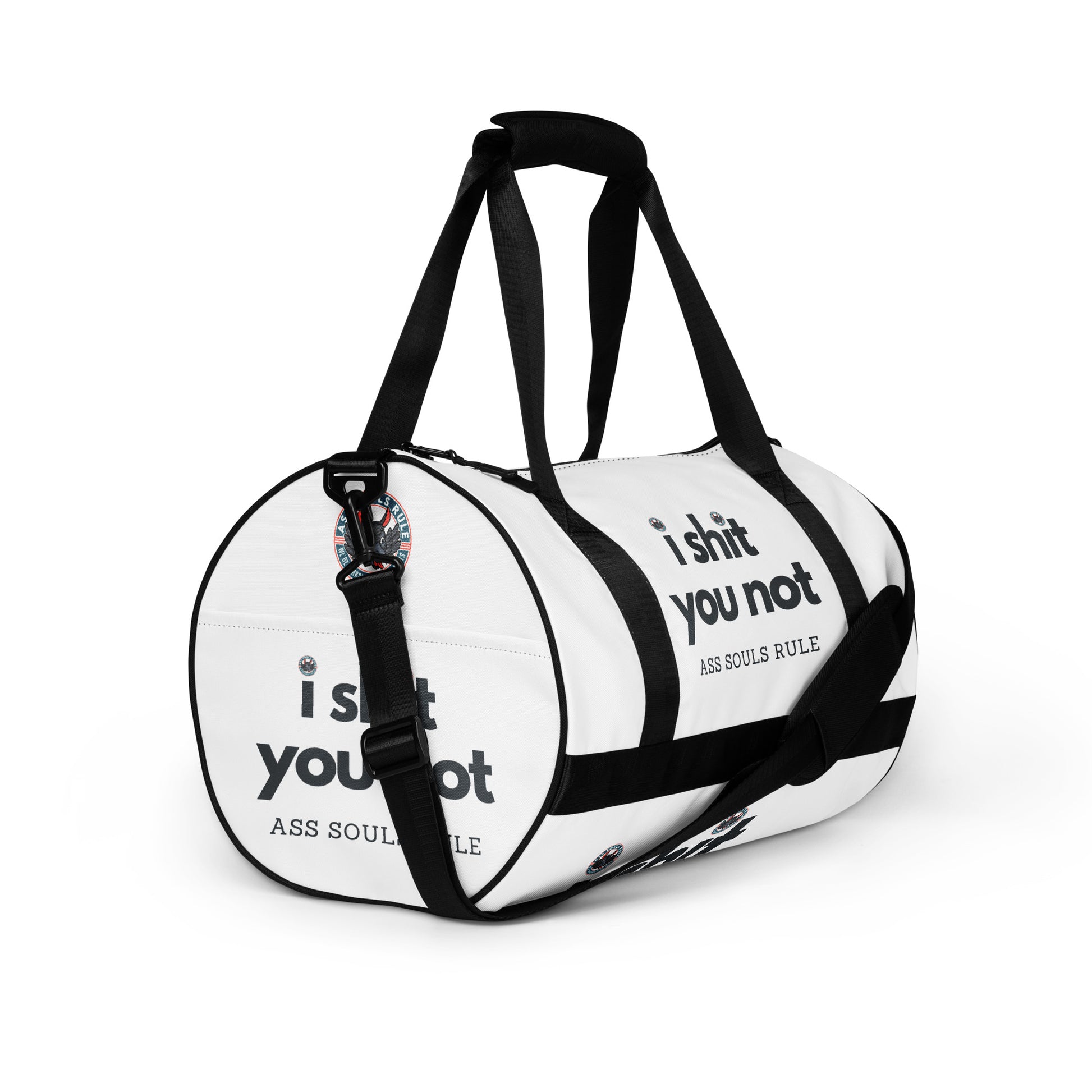 Ready to get your fitness game-on or work those Ass Souls out of your system? Add some punch to pumping iron with this I Shit You Not gym bag. Made from 100% polyester and sturdy, water-resistant fabric, this bag is fun meets function. And it’s got pockets!