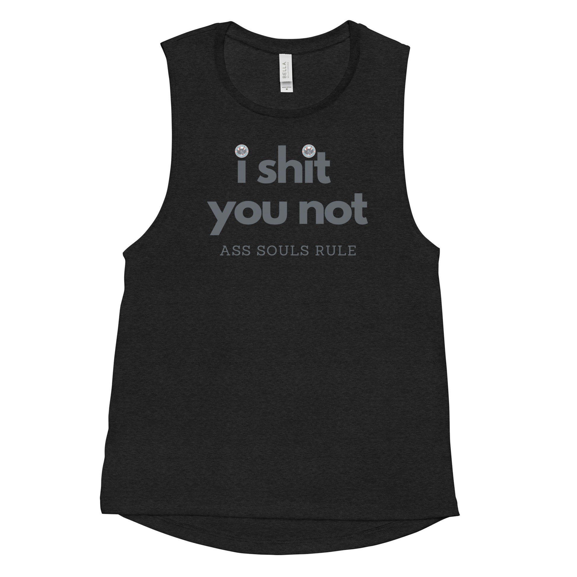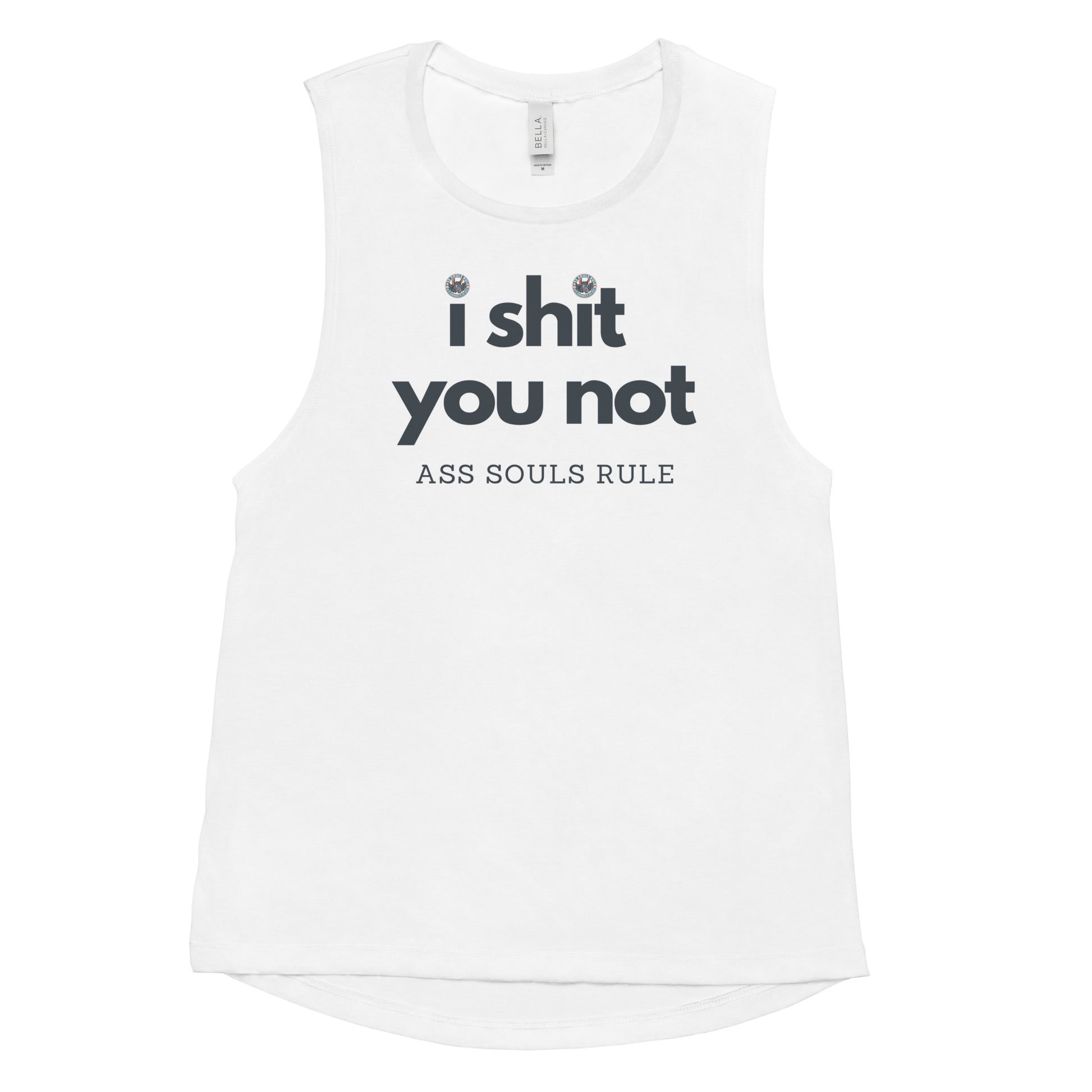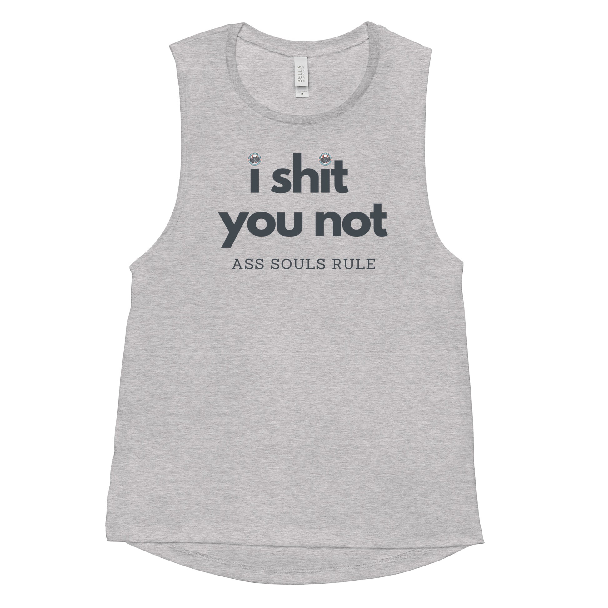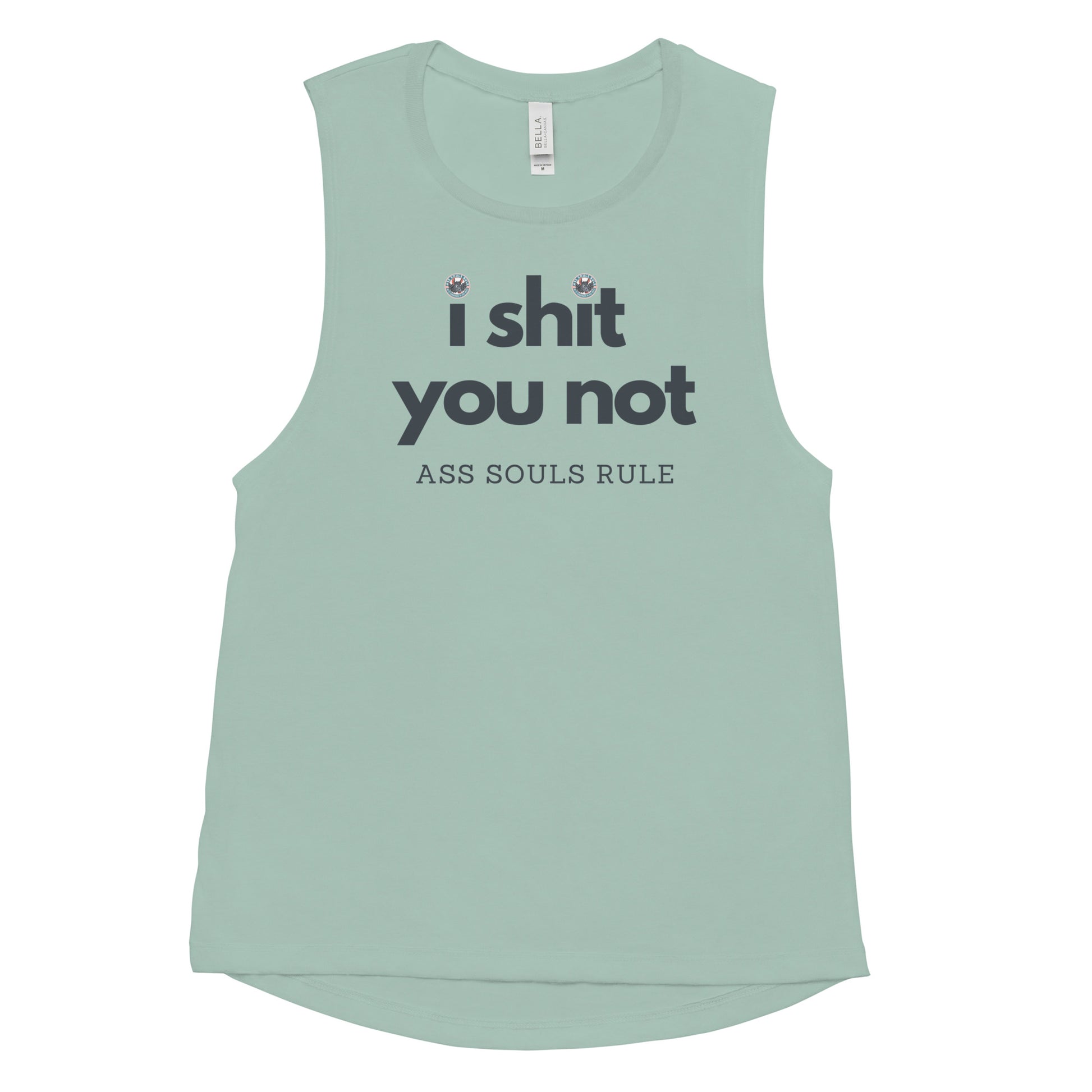 This comfortable muscle tank is soft and flowy with low cut armholes for a relaxed ASR look. I Shit You Not.