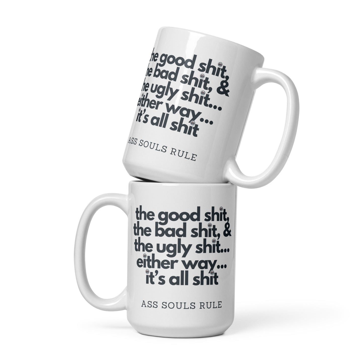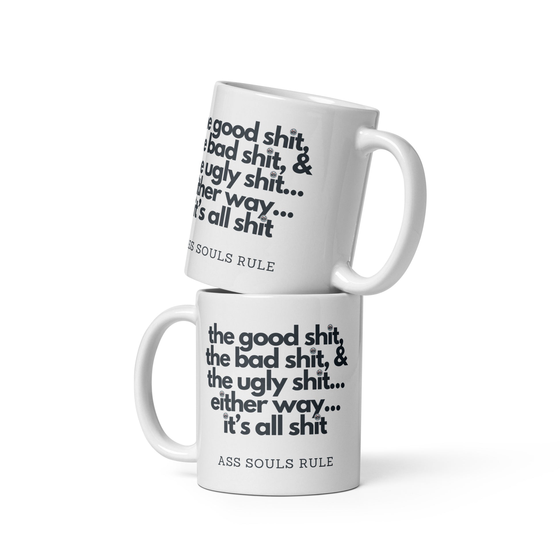 Whether you're drinking your morning coffee, evening tea, or something in between while mulling over whatever shit's happening whether good, bad or ugly —this mug's for you! It's sturdy and glossy with a vivid print that'll withstand the microwave and dishwasher.