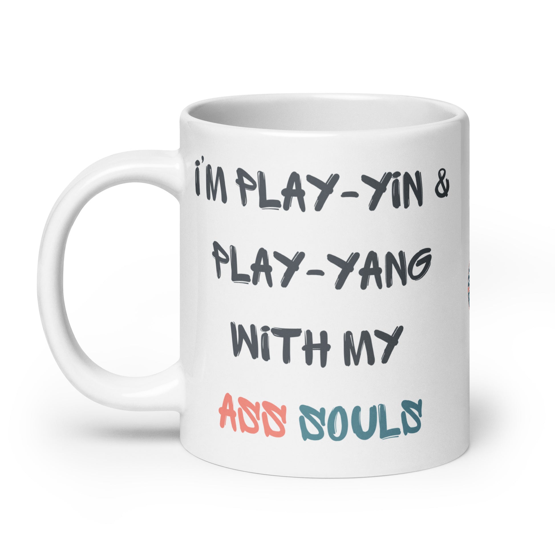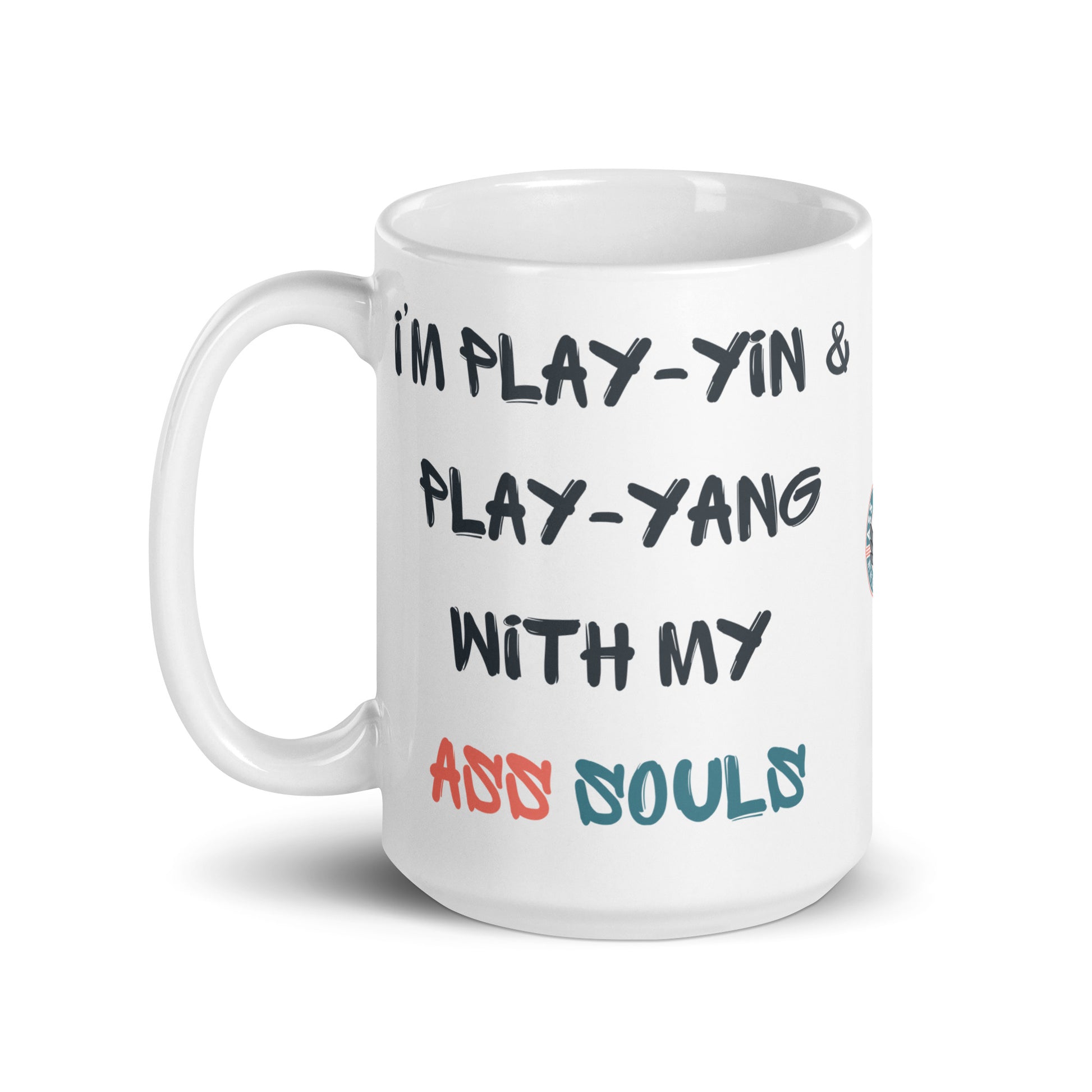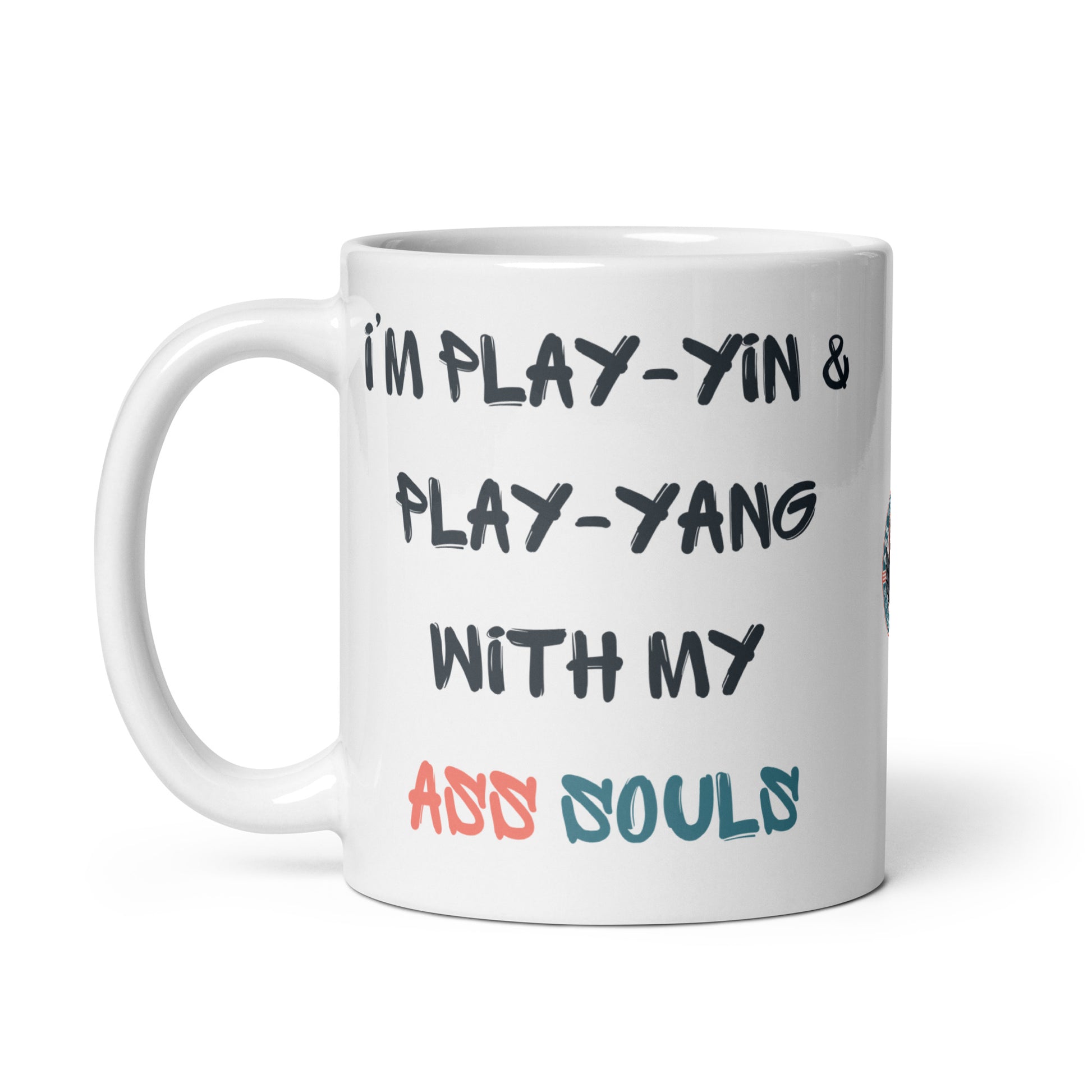 Whether you're drinking your morning coffee, evening tea, or something in between while introspecting how you want to go about play-yin and play-yang with your Ass Souls—this mug's for you! It's sturdy and glossy with a vivid print that'll withstand the microwave and dishwasher.