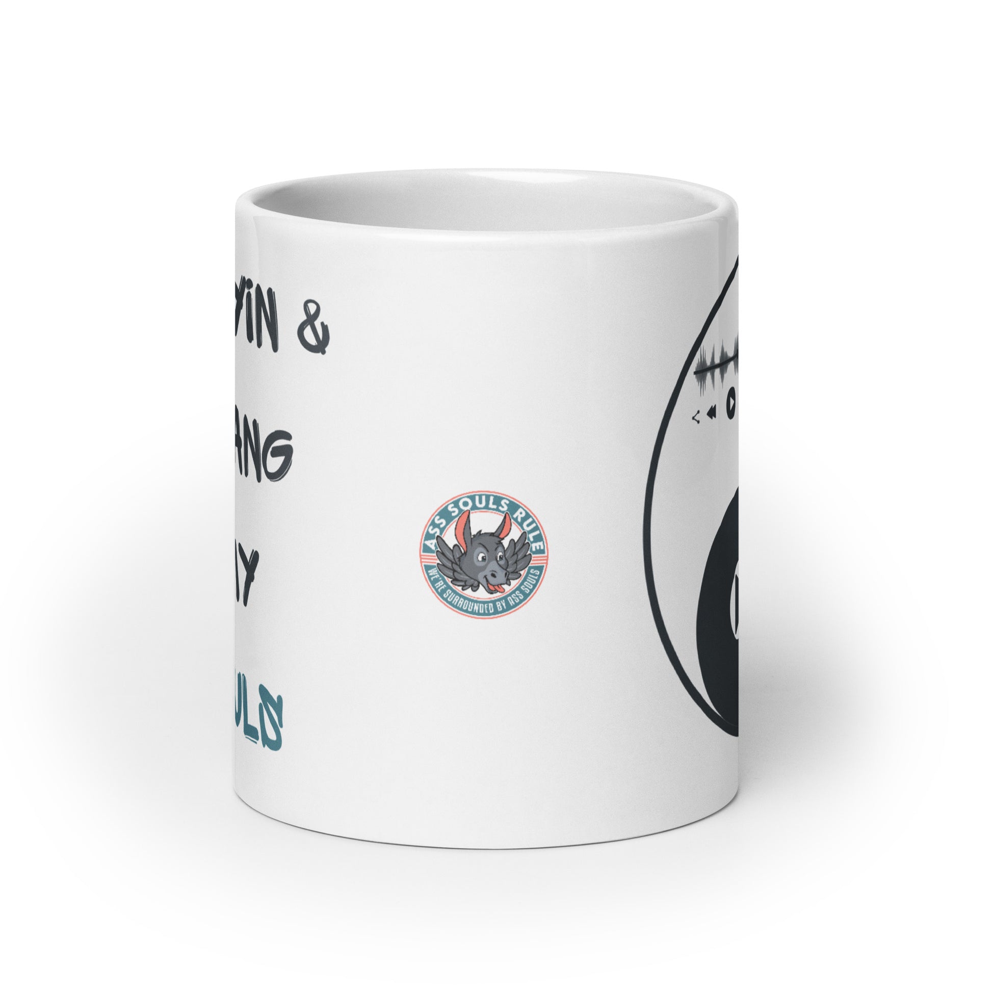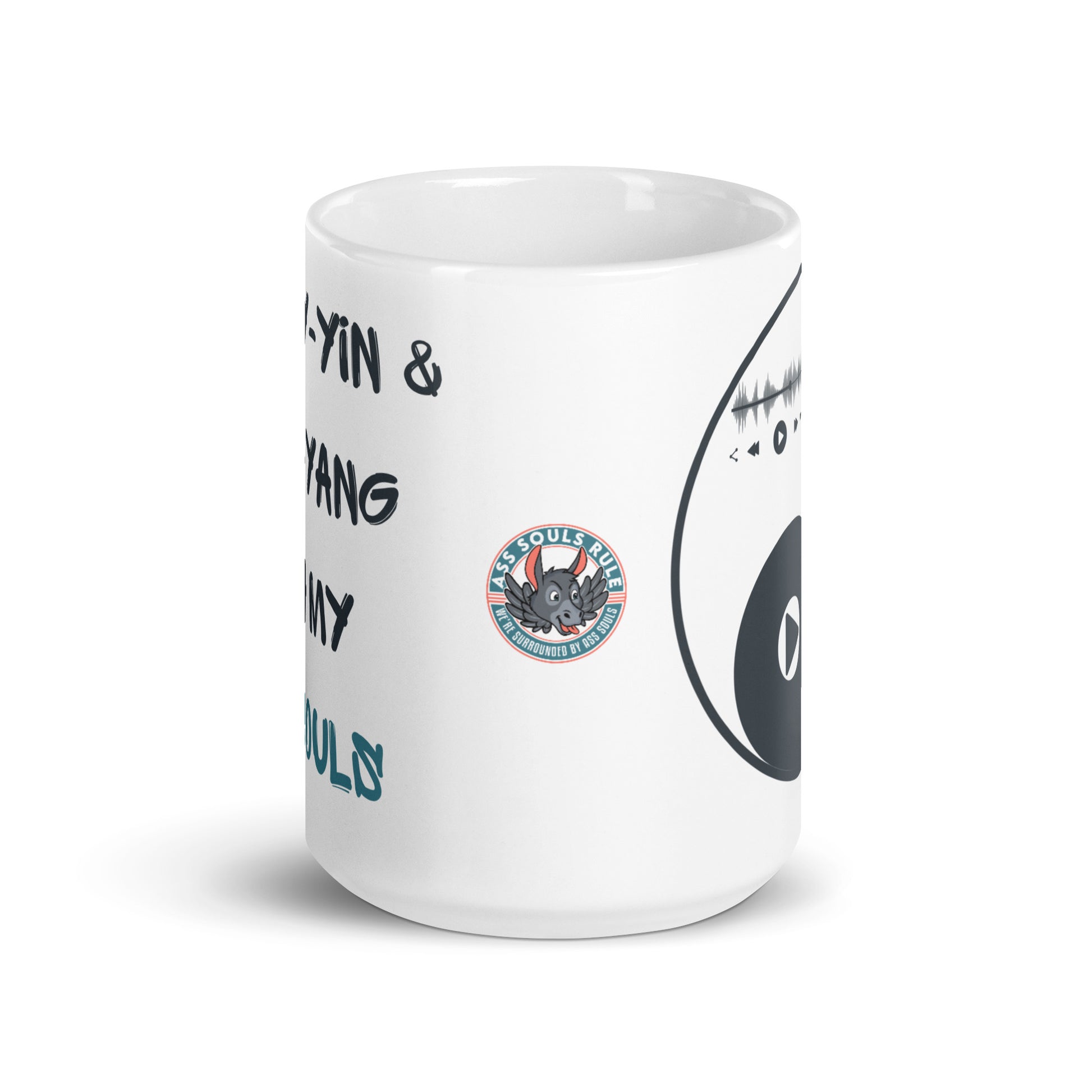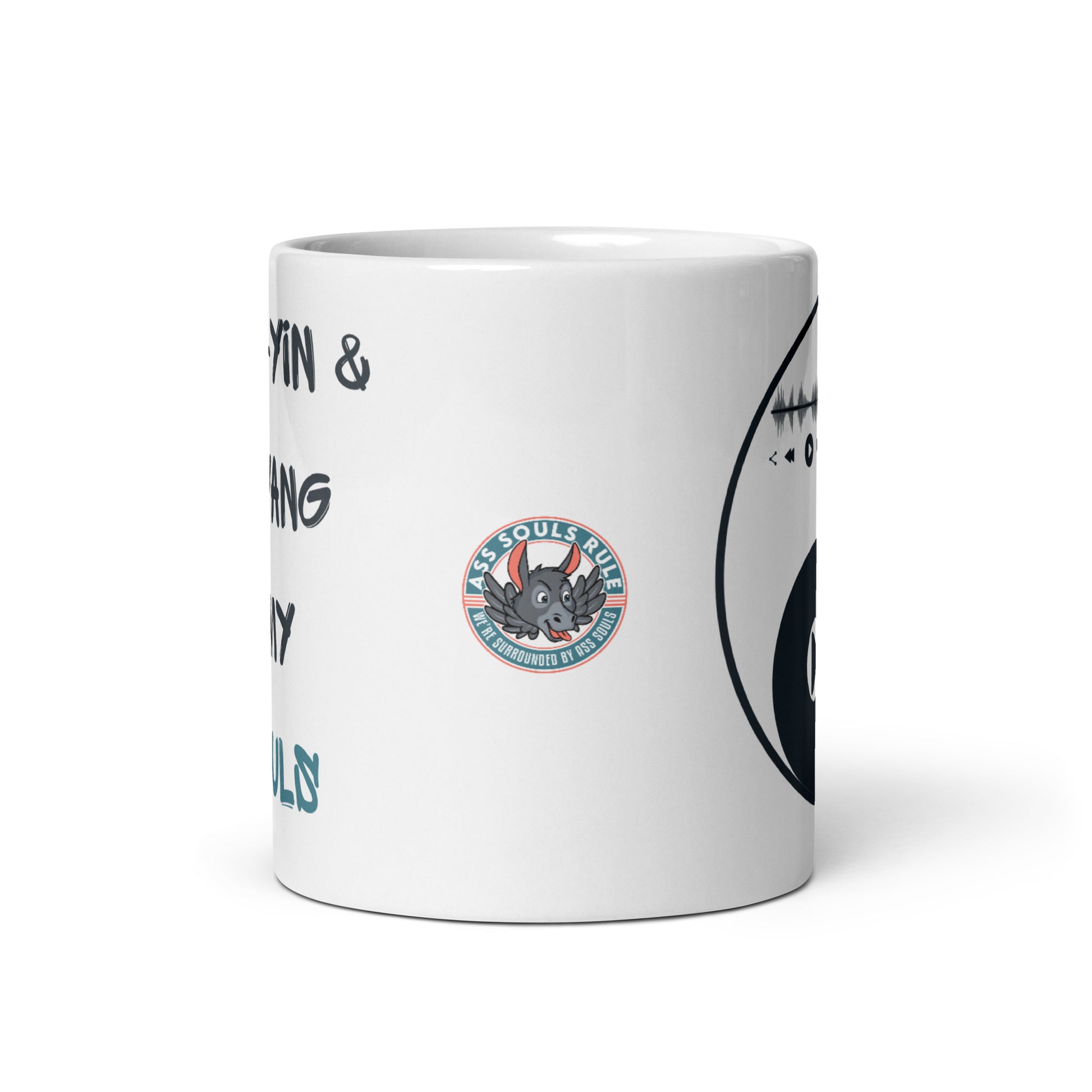 Whether you're drinking your morning coffee, evening tea, or something in between while introspecting how you want to go about play-yin and play-yang with your Ass Souls—this mug's for you! It's sturdy and glossy with a vivid print that'll withstand the microwave and dishwasher.