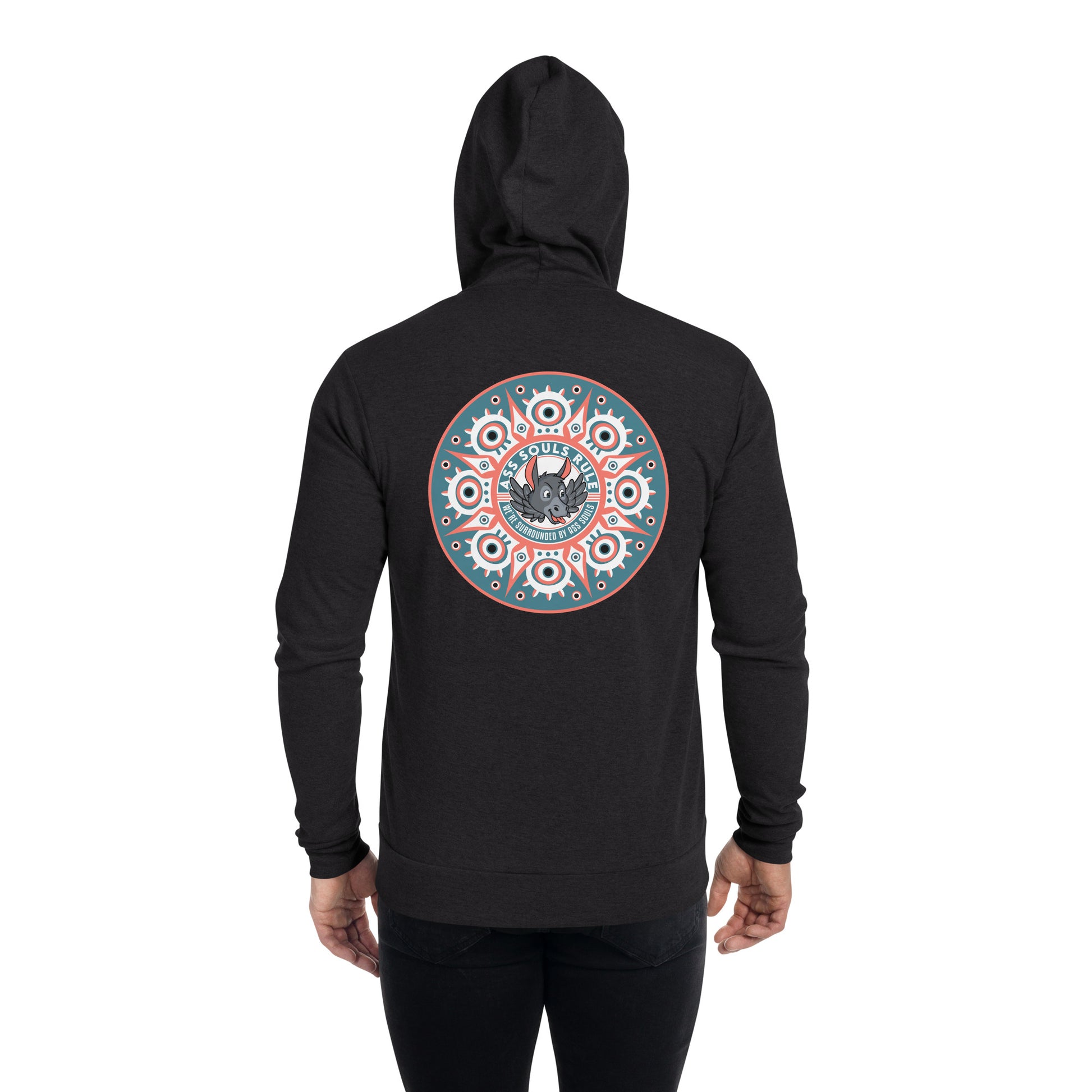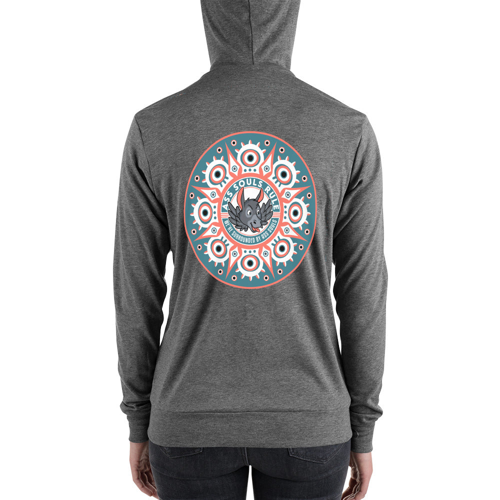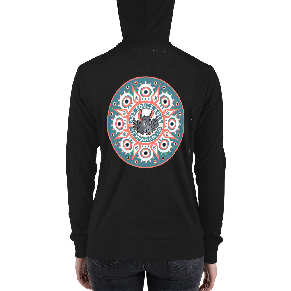 For when you get chilly on a summer evening by the lake if you're catching some not-so-nice vibes from Ass Souls, or simply need something comfy to throw on for some Ass Soul protection, this lightweight unisex Psyche Secure-I.T. zip hoodie with a modern fit, hood, front zip, and a kangaroo pocket is the way to go.