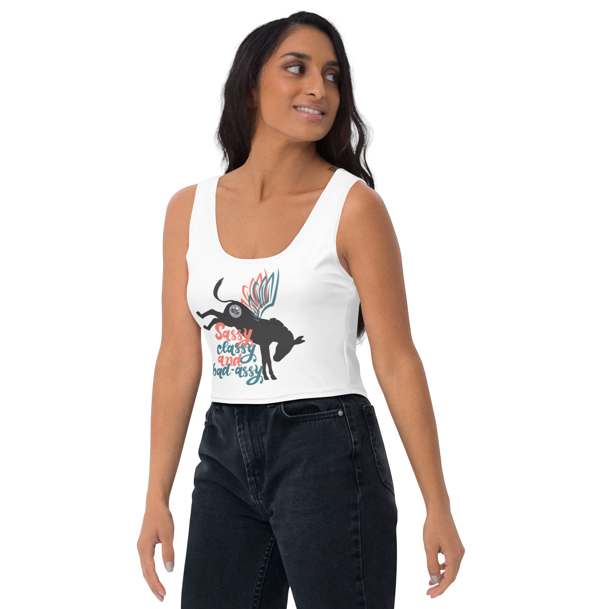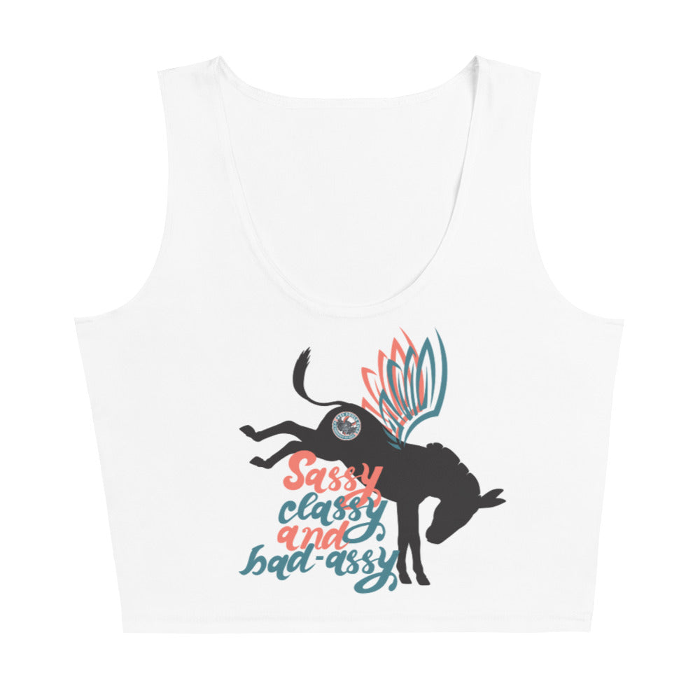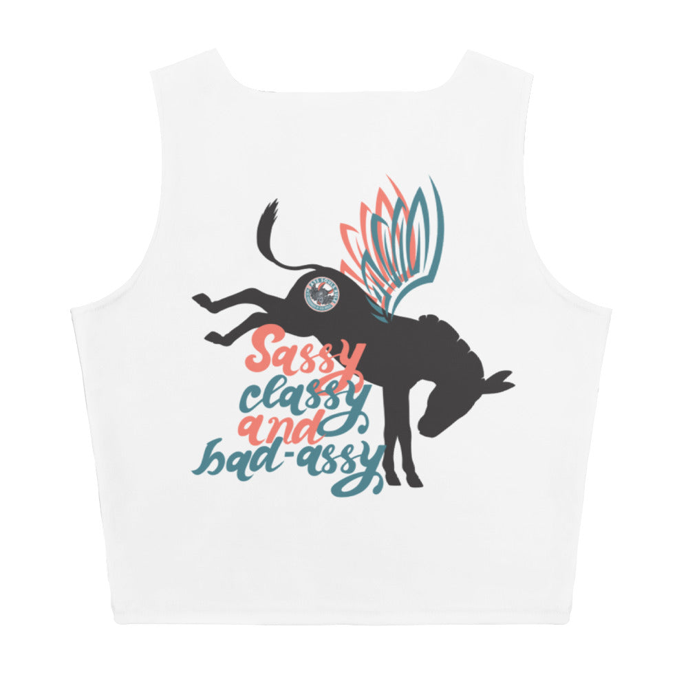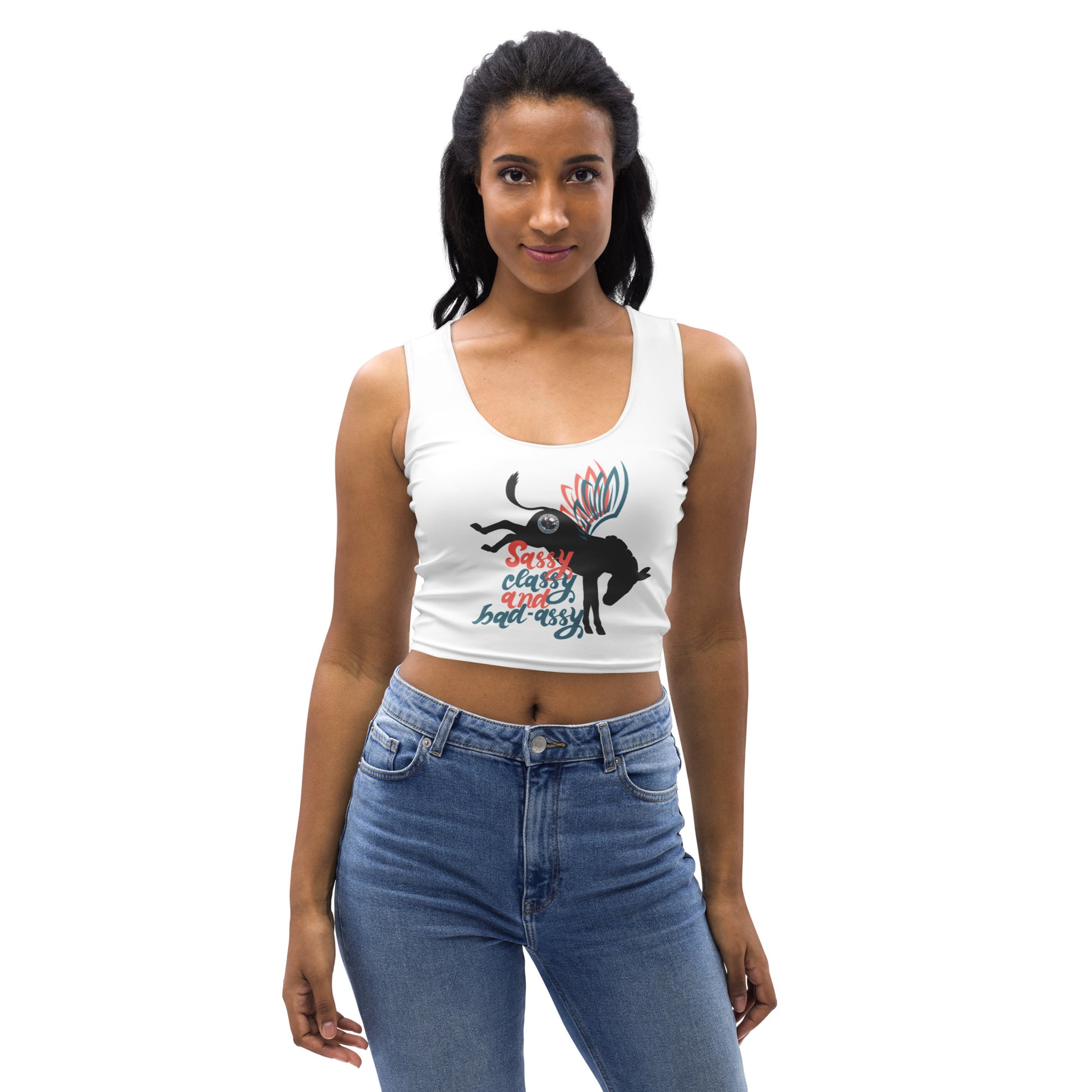 Look fabulous in an all-over Sassy, Classy, & Bad Assy printed, body-hugging crop top. Sassy, Classy, & Bad Assy & you know it. Let everyone else know it, too.