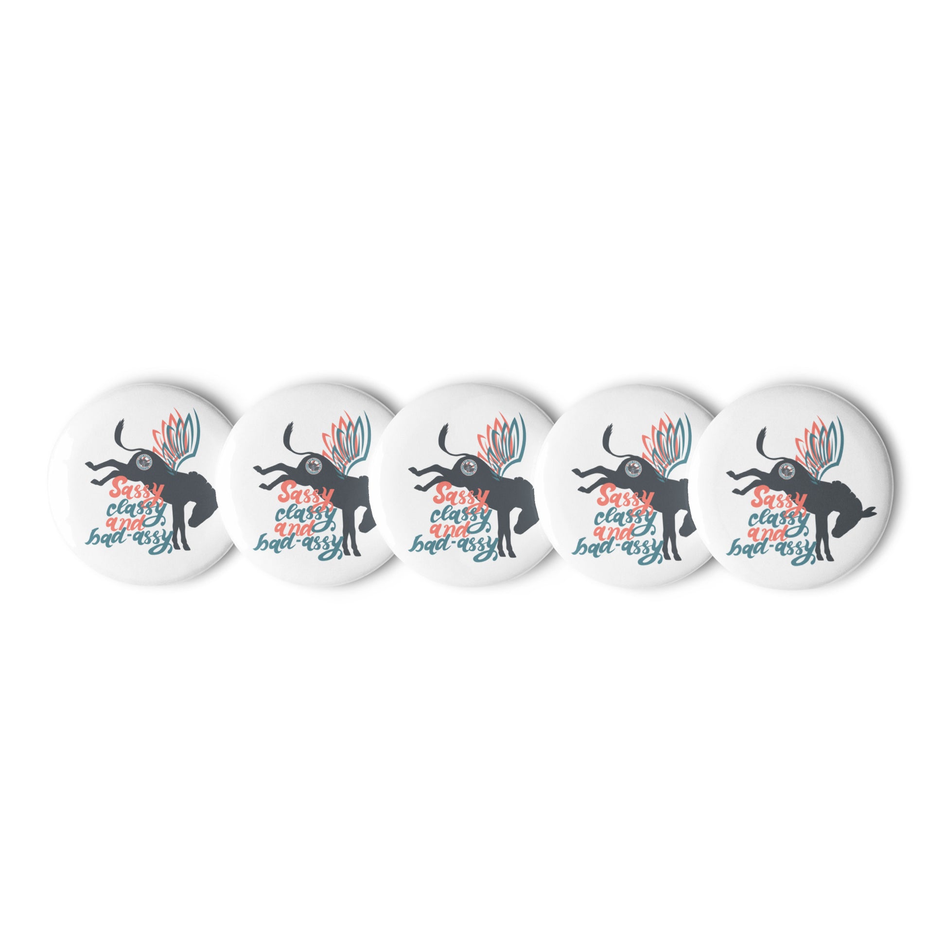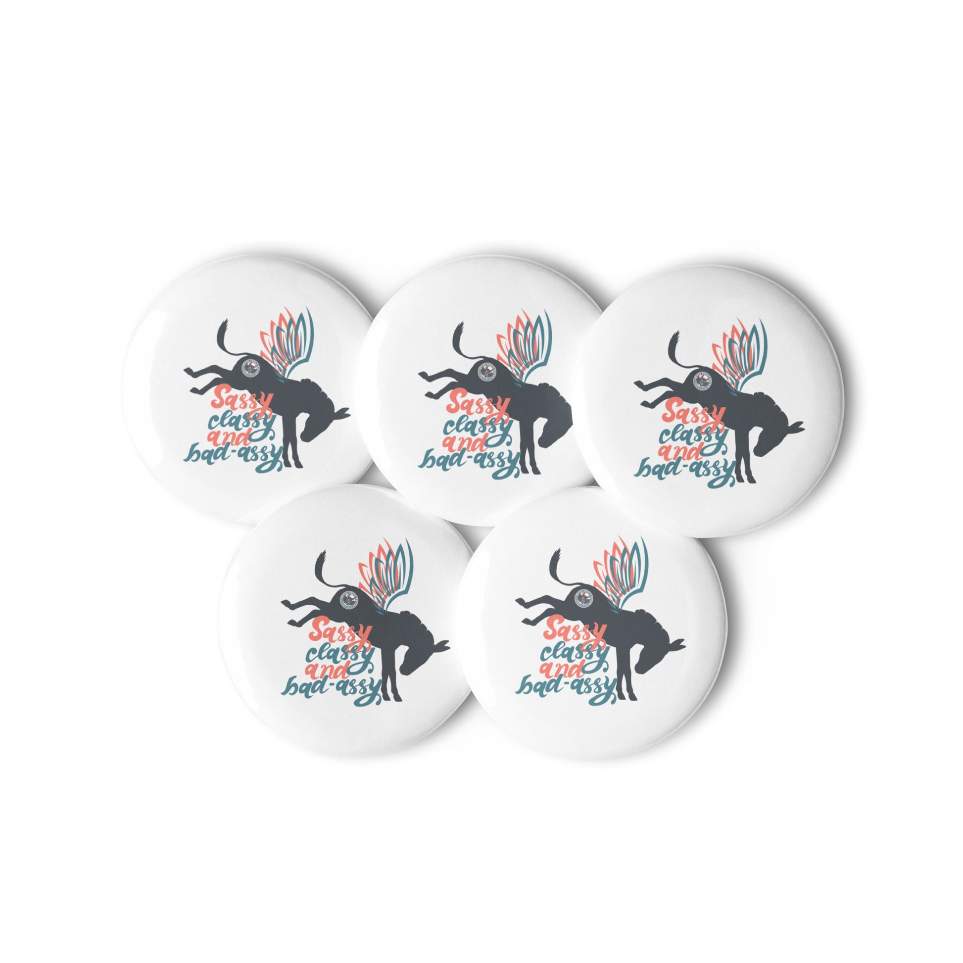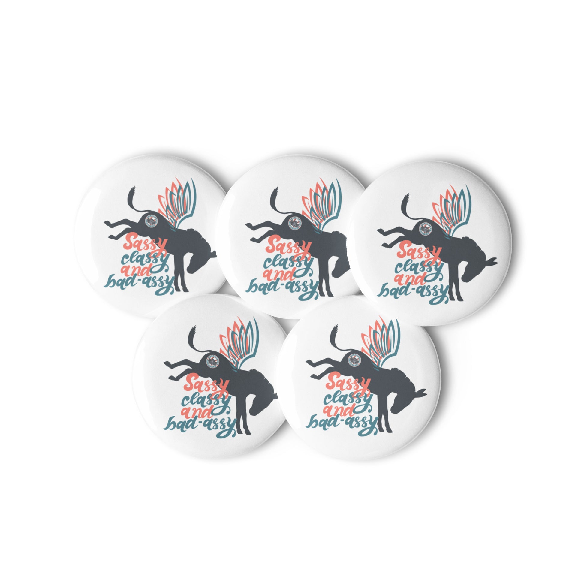 Express your Sassy, Classy, & Bad Assy self in a meaningful way with top-quality pin buttons. They’re lightweight, sturdy, and easy to put on. With a scratch and UV-resistant coating and a glossy finish, these pin buttons are made to last. Show off your Sassy, Classy, & Bad Assy self and add a pop of personality to your clothing or accessories with vibrant pin buttons.