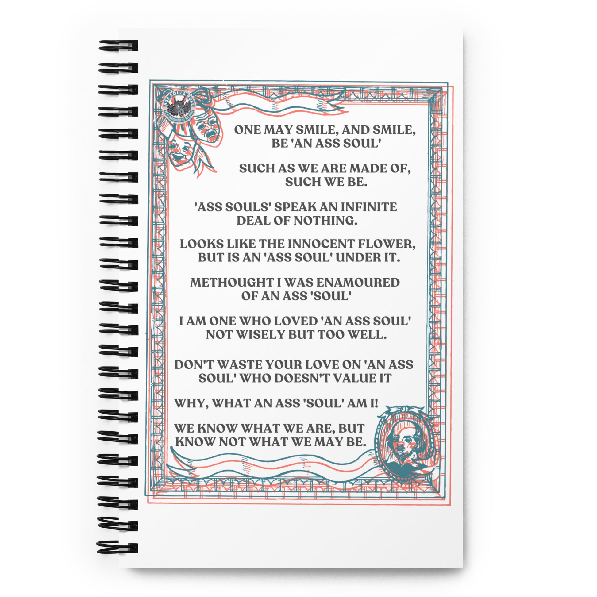Even Shakespeare knew he was surrounded by Ass Souls and suffered the slings and arrows of misfortune being around them. This custom wire-bound notebook will be a great daily companion whenever you need to put your thoughts down on paper or need to be inspired by some ASR related Shakespeare quotes! Oh, & for taking down notes or ideas or brainstorming, too!