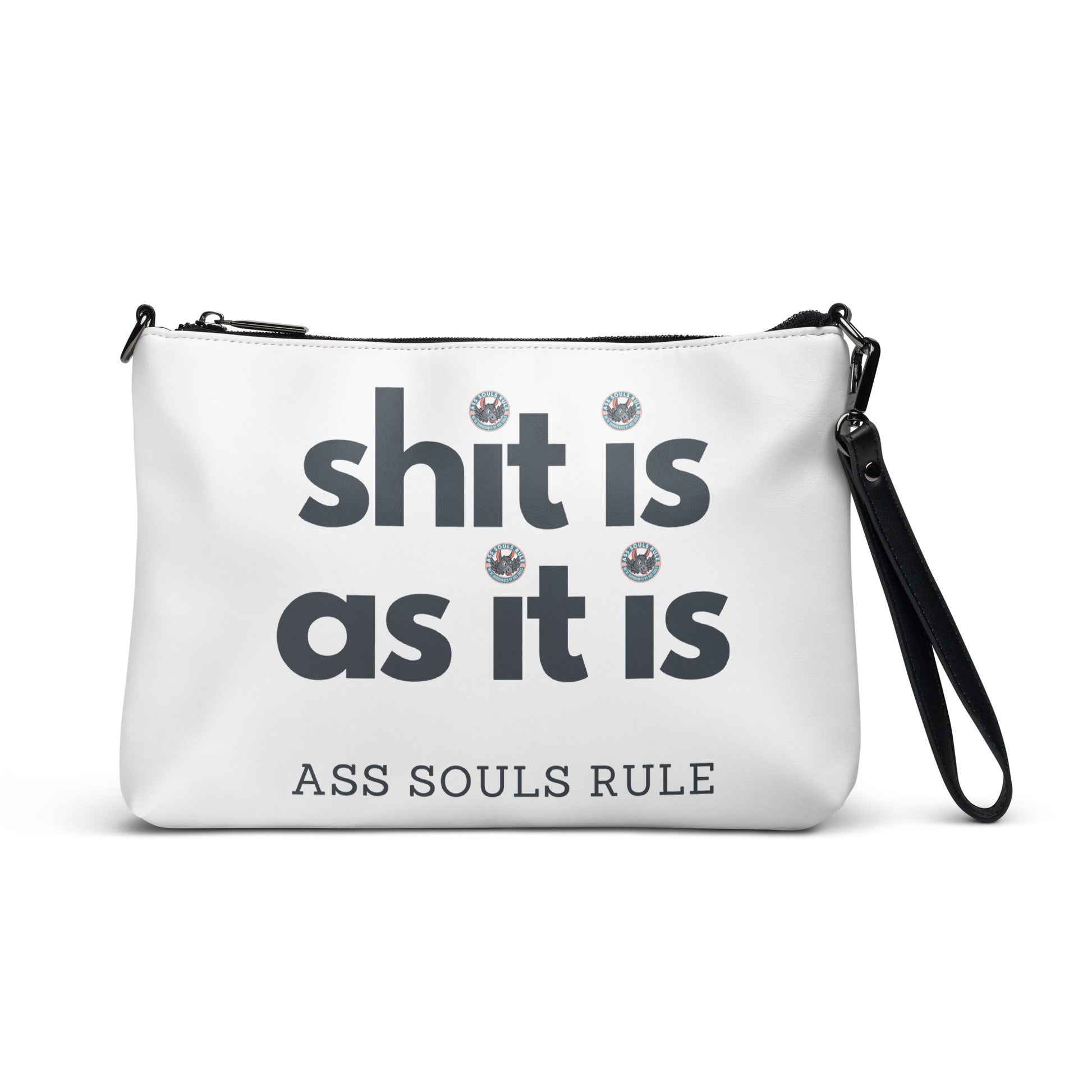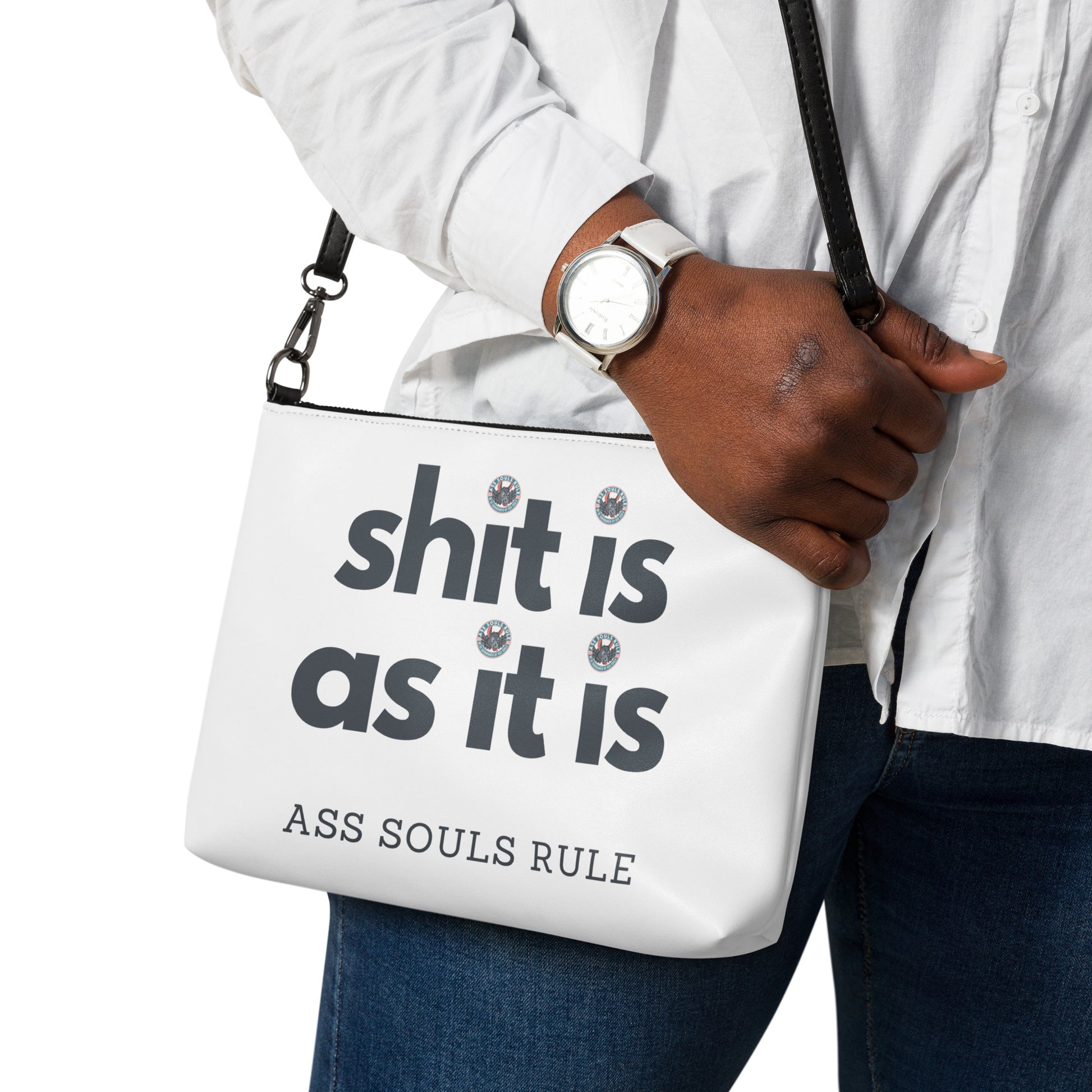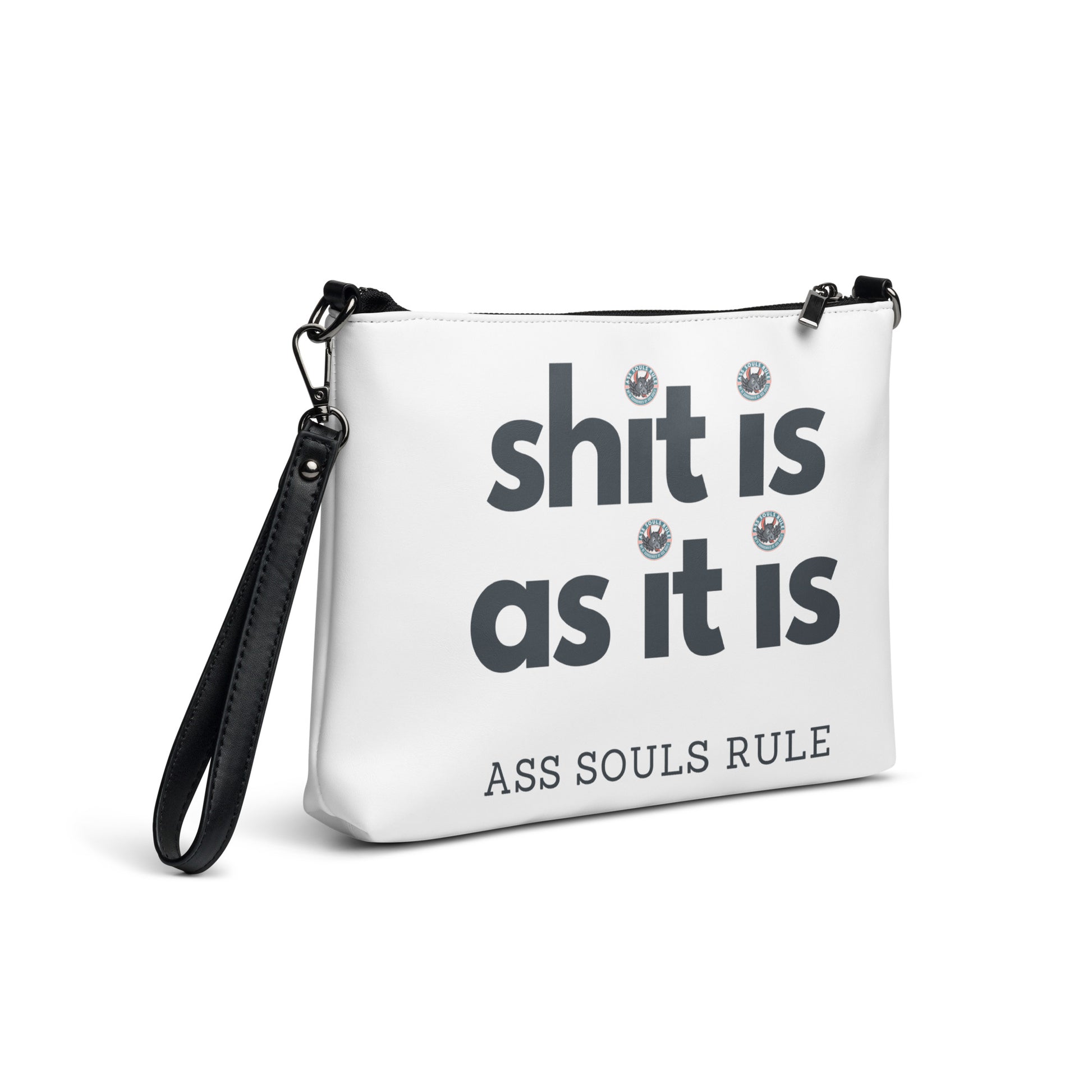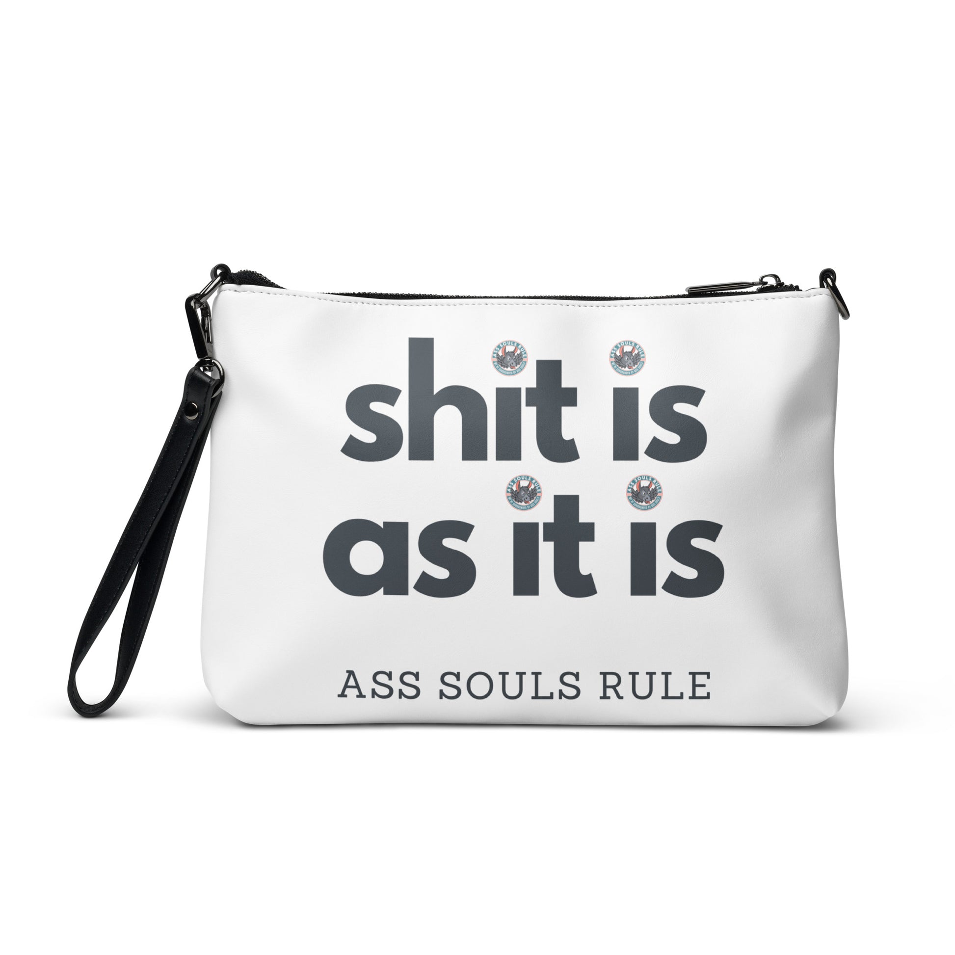 Keep your Game of Lifestyle on point and your hands free with our versatile Shit Is As It Is crossbody bag. It’s made of premium faux leather and features dark gray hardware. Thanks to the zip-top closure and multiple inside pockets, you can keep your essentials secure from Ass Souls and organized. Transform this crossbody bag with removable wrist and shoulder straps to style it for day-to-night looks.