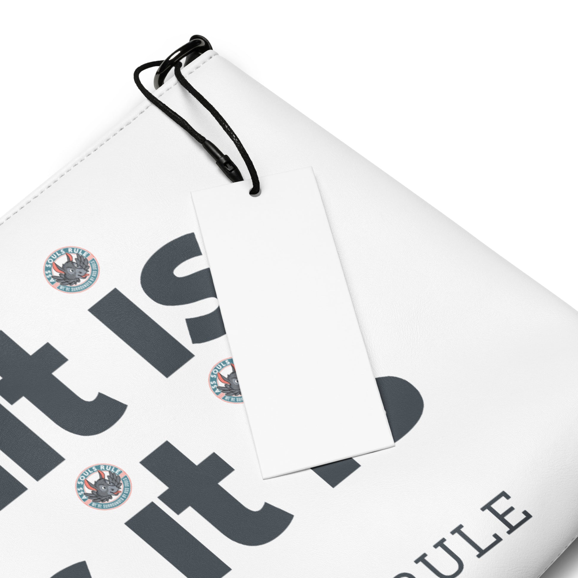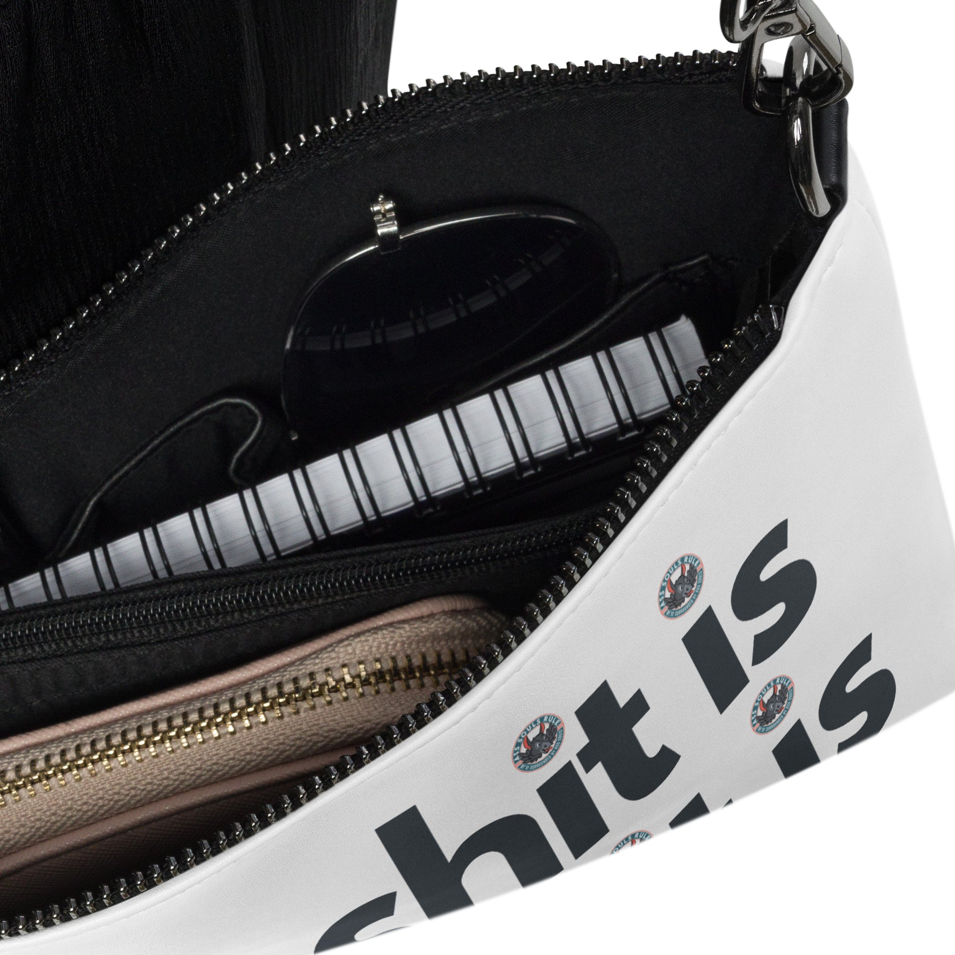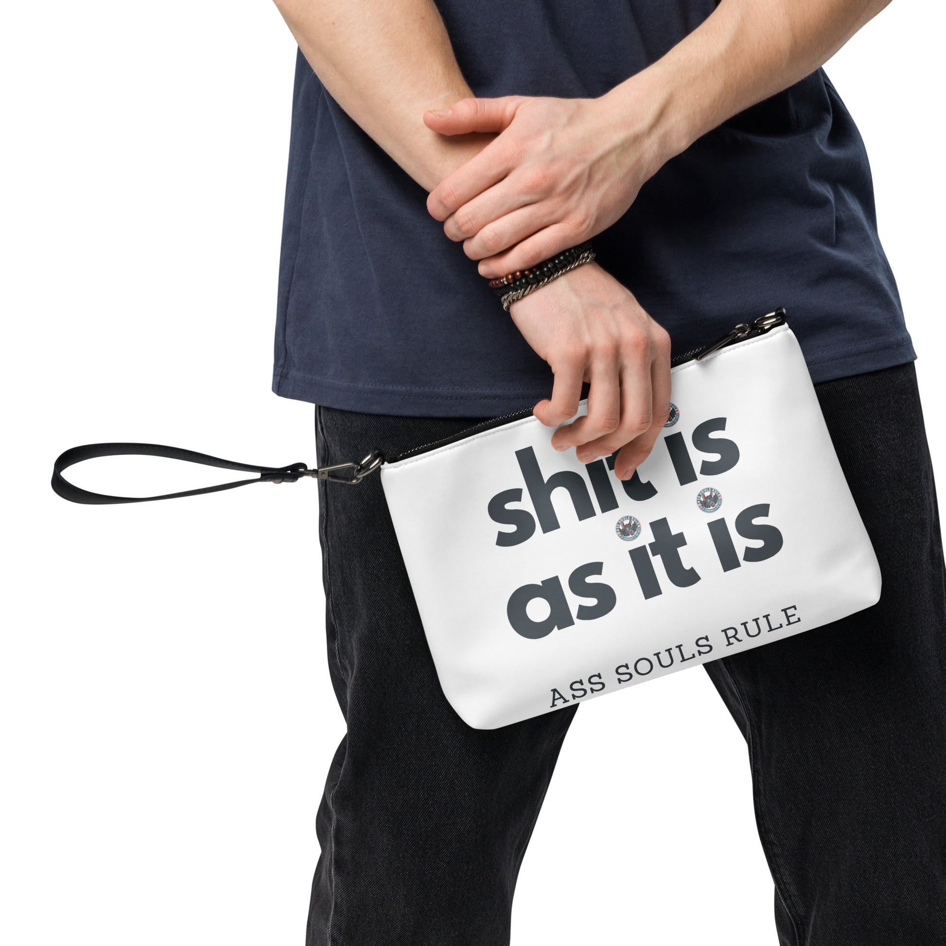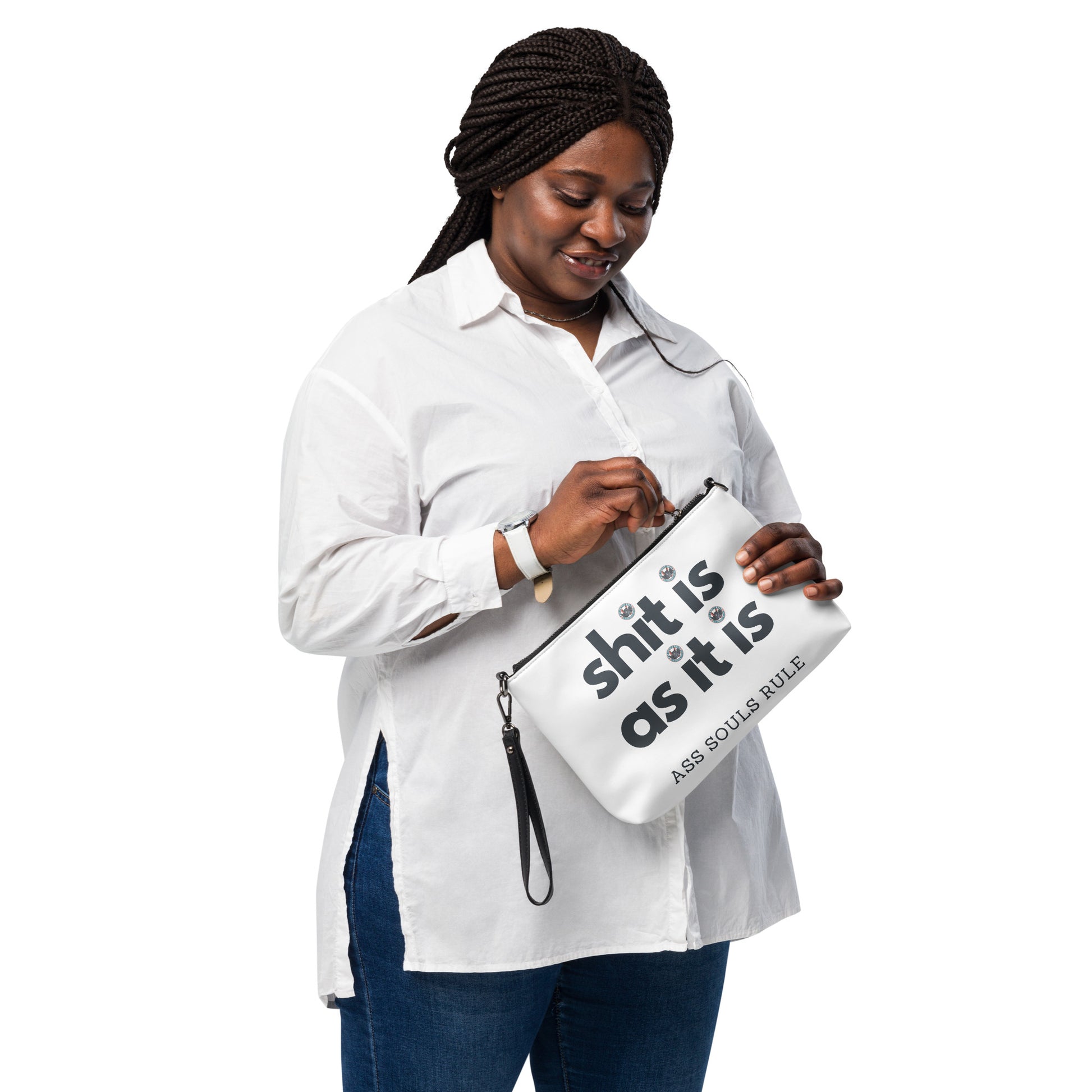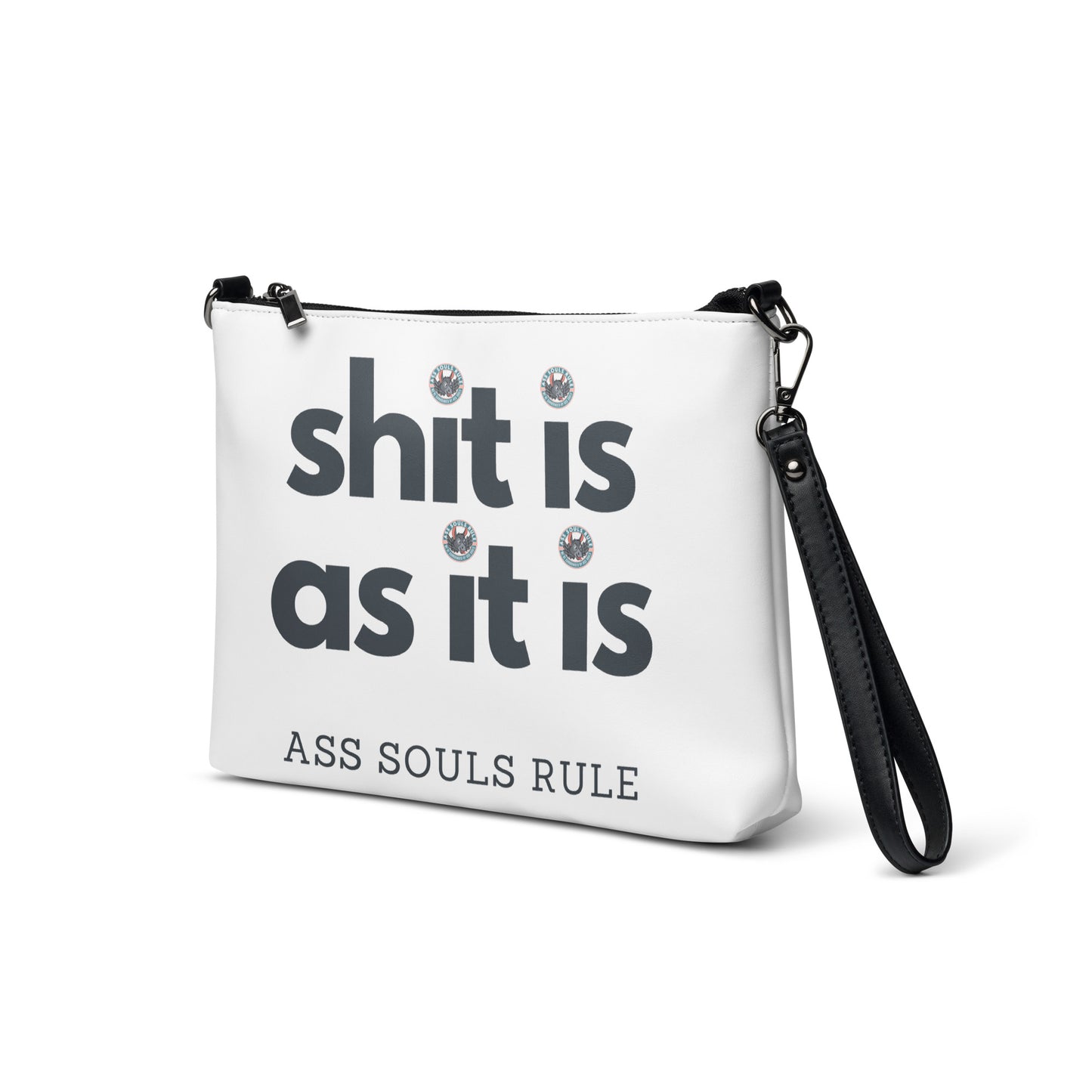 Keep your Game of Lifestyle on point and your hands free with our versatile Shit Is As It Is crossbody bag. It’s made of premium faux leather and features dark gray hardware. Thanks to the zip-top closure and multiple inside pockets, you can keep your essentials secure from Ass Souls and organized. Transform this crossbody bag with removable wrist and shoulder straps to style it for day-to-night looks.