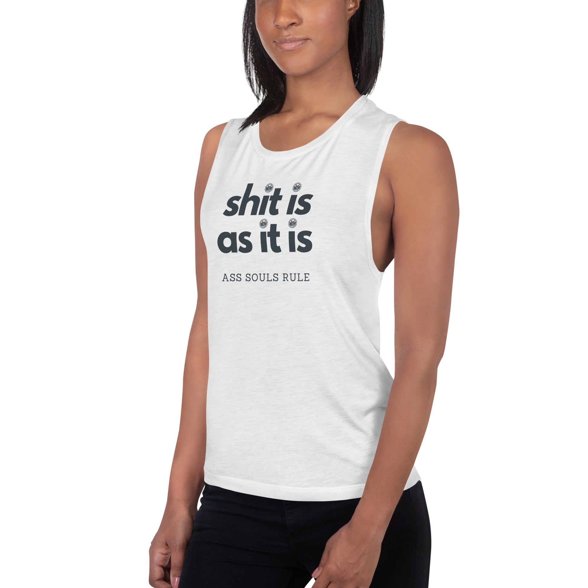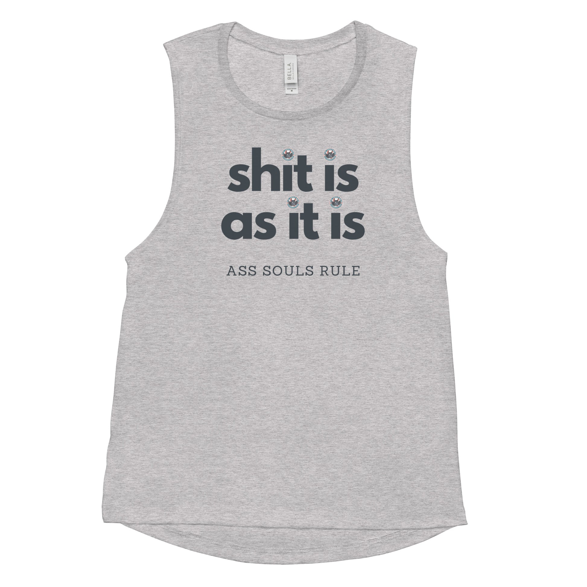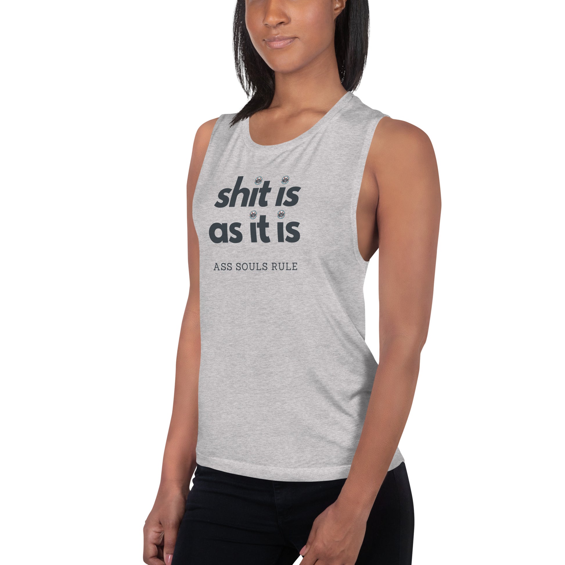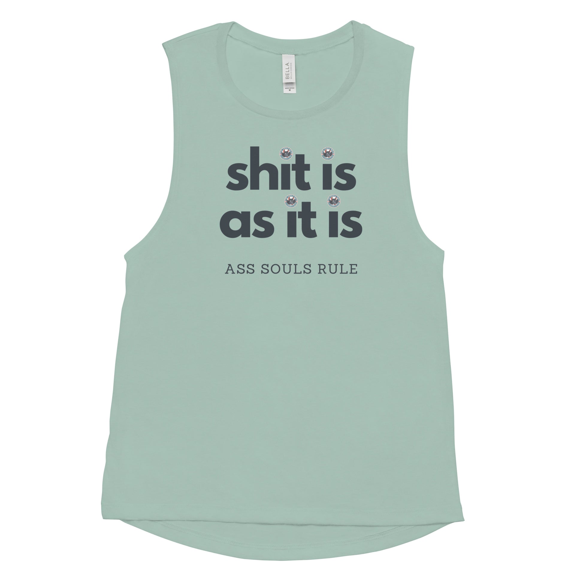 This comfortable Shit Is As It Is muscle tank is soft and flowy with low cut armholes for a relaxed look.