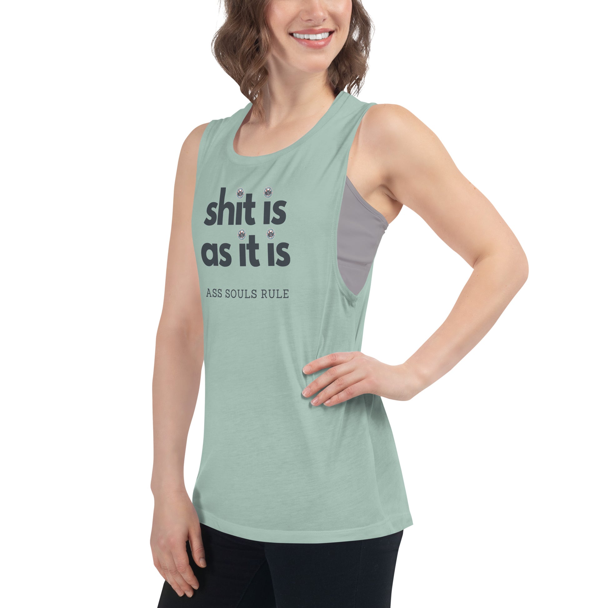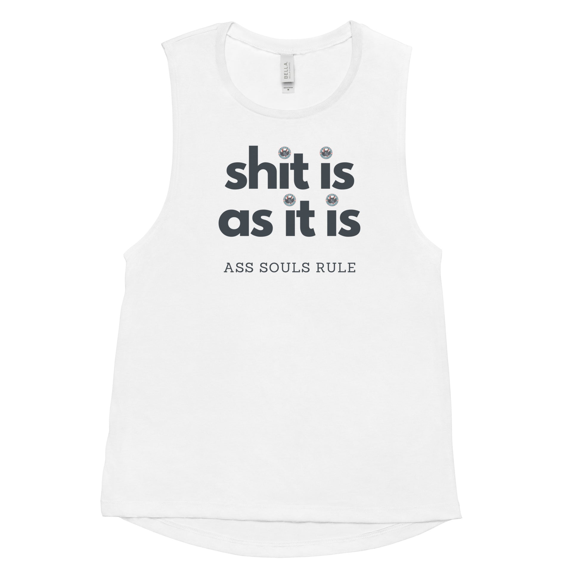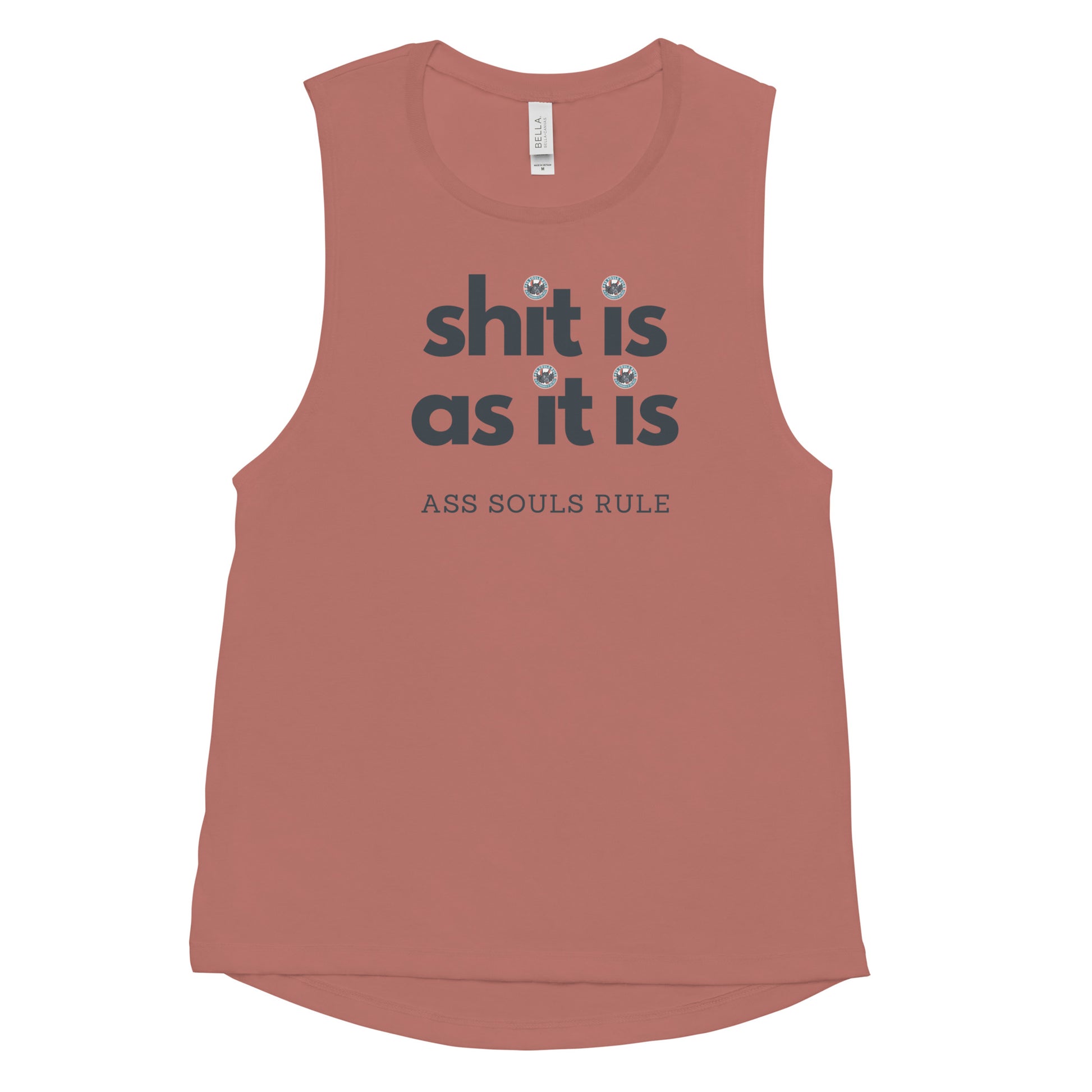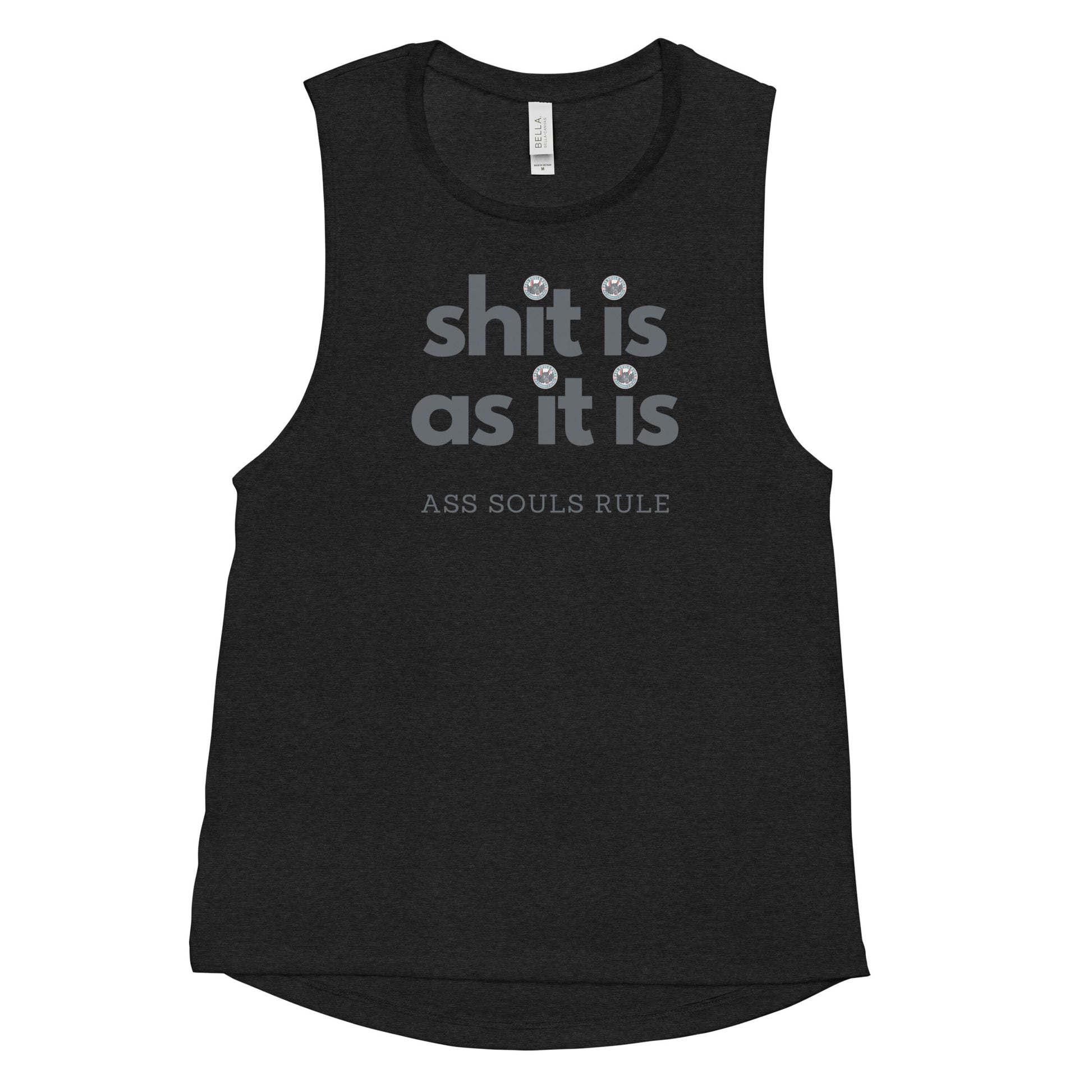 This comfortable Shit Is As It Is muscle tank is soft and flowy with low cut armholes for a relaxed look.