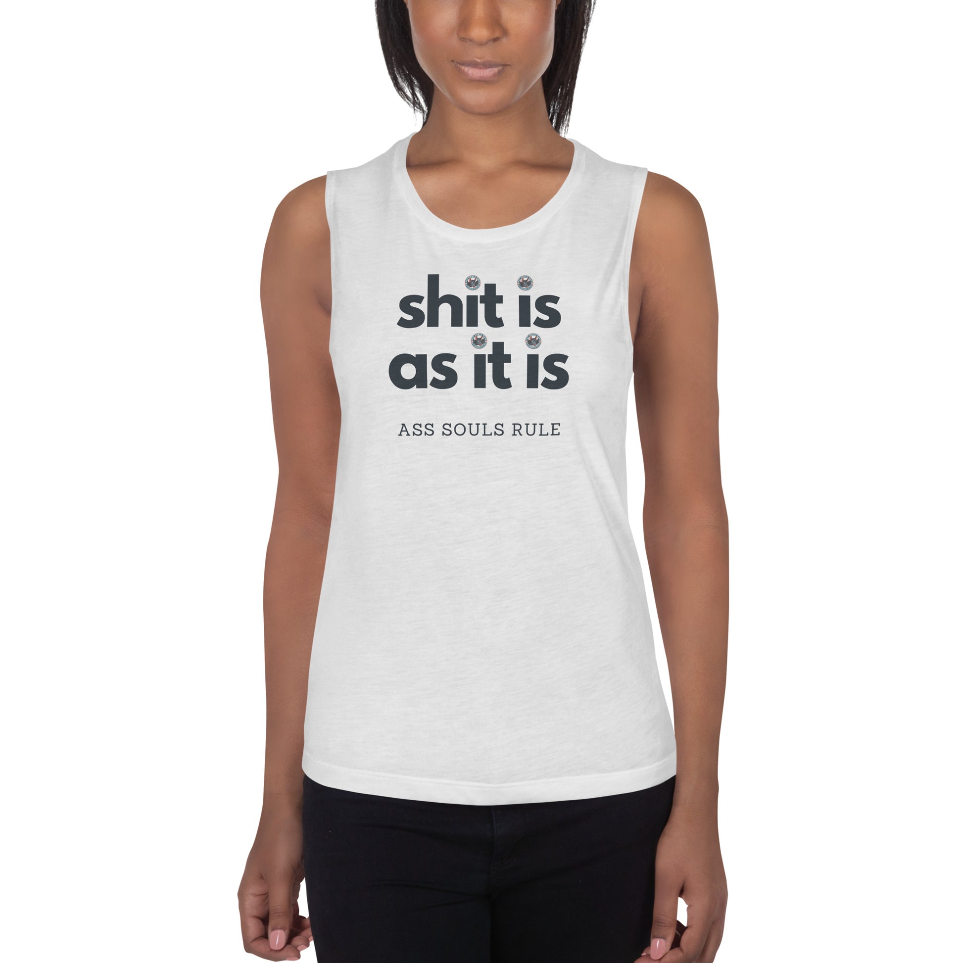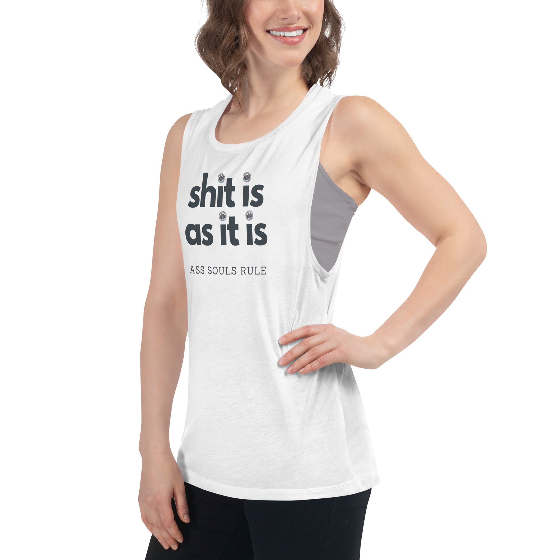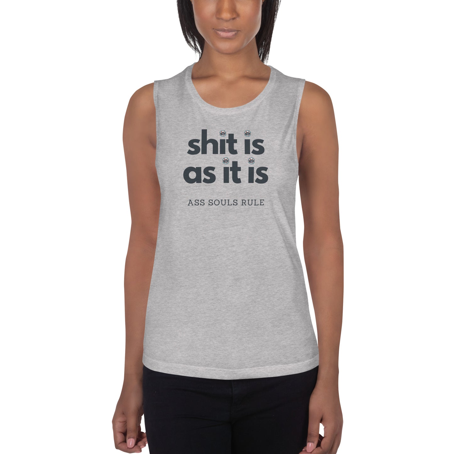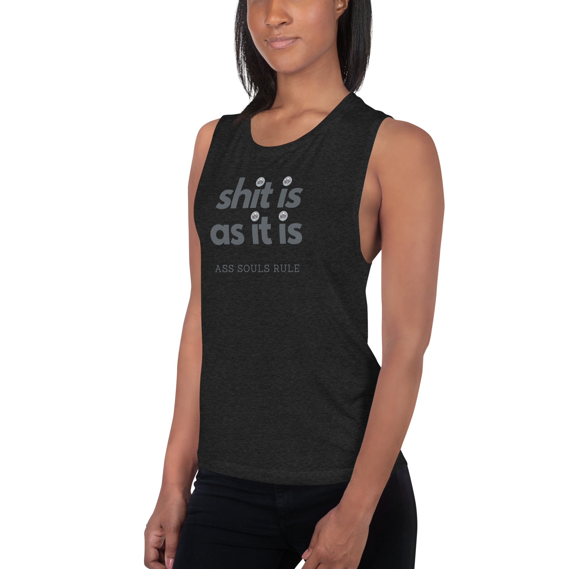 This comfortable Shit Is As It Is muscle tank is soft and flowy with low cut armholes for a relaxed look.