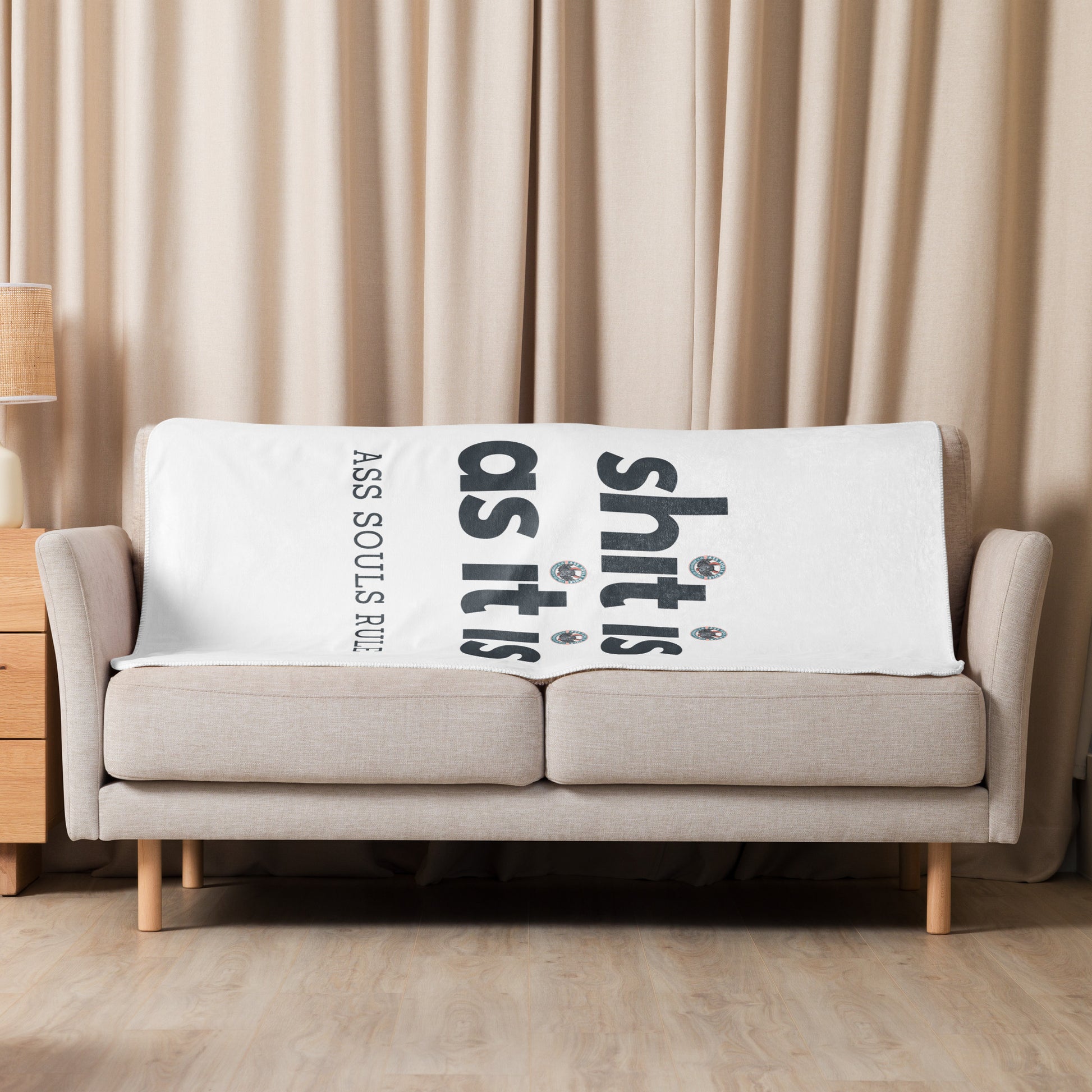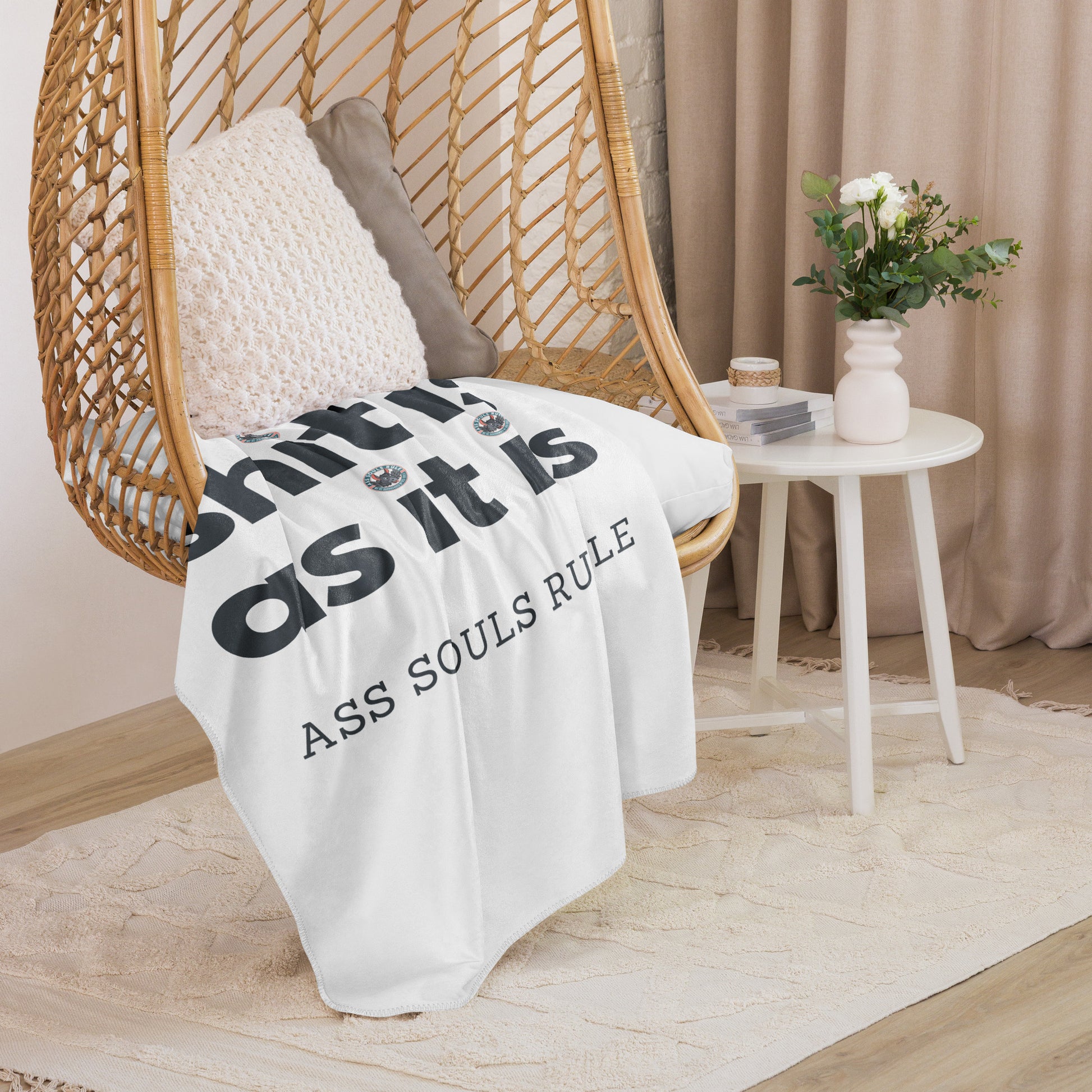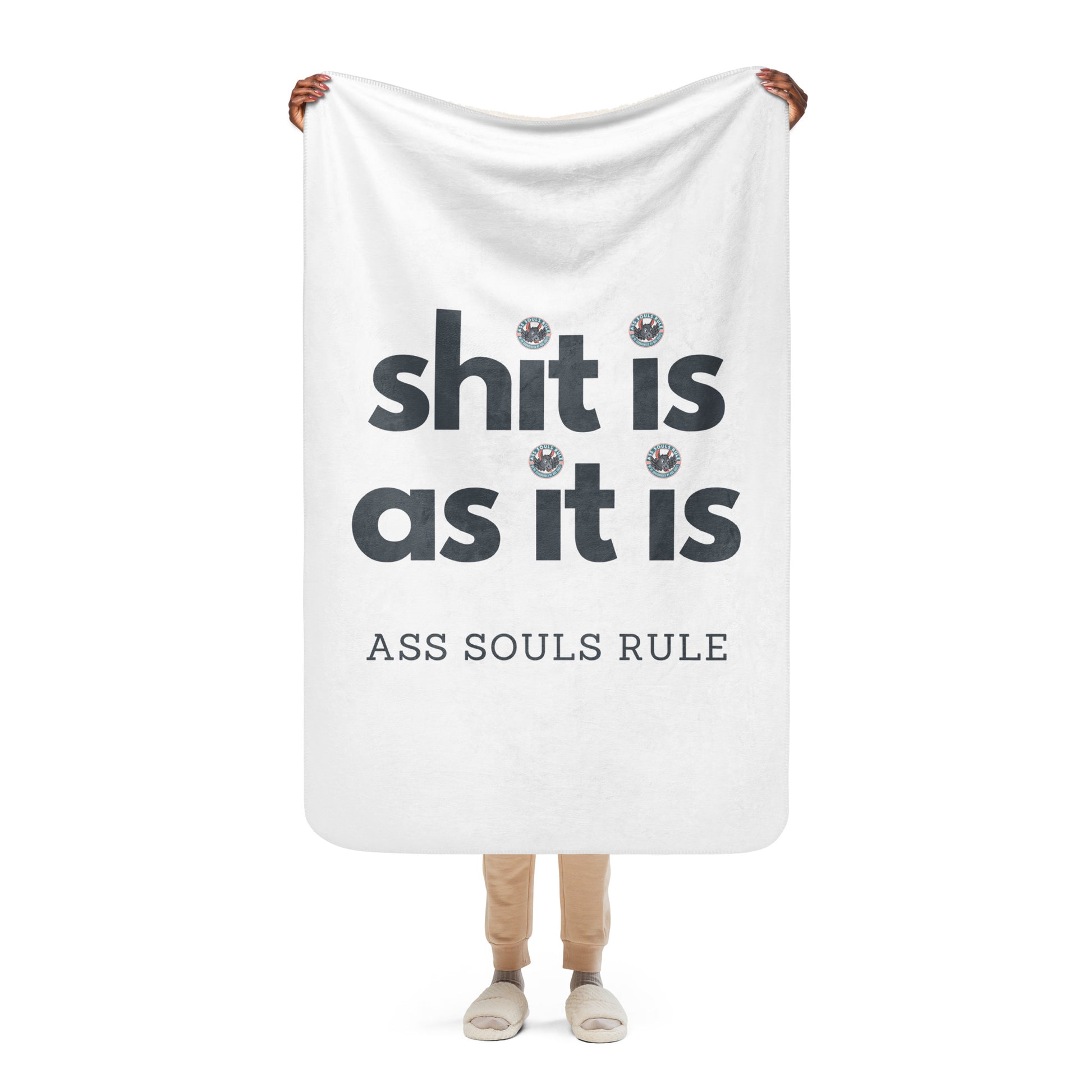 This exquisite Shit Is As It Is sherpa blanket combines a plushie feel with exceptional softness, making it the ultimate comfort companion after a day around Ass Souls. Perfect for daily use while lounging on the couch, snuggling up on chilly evenings, or styling your room—this blanket offers unmatched coziness and warmth.