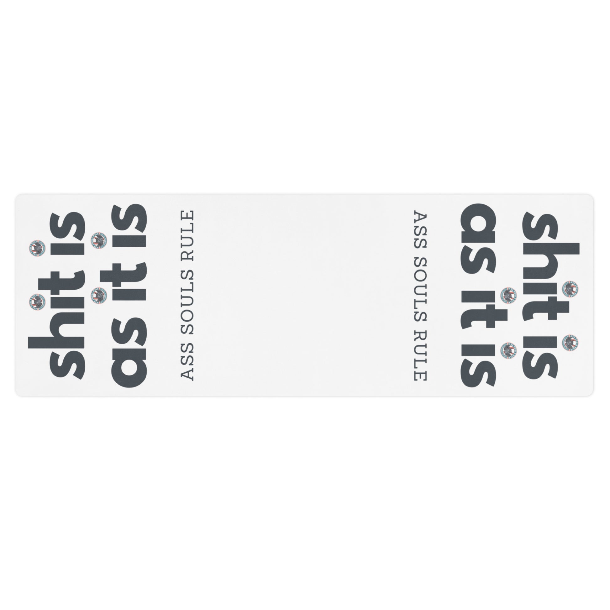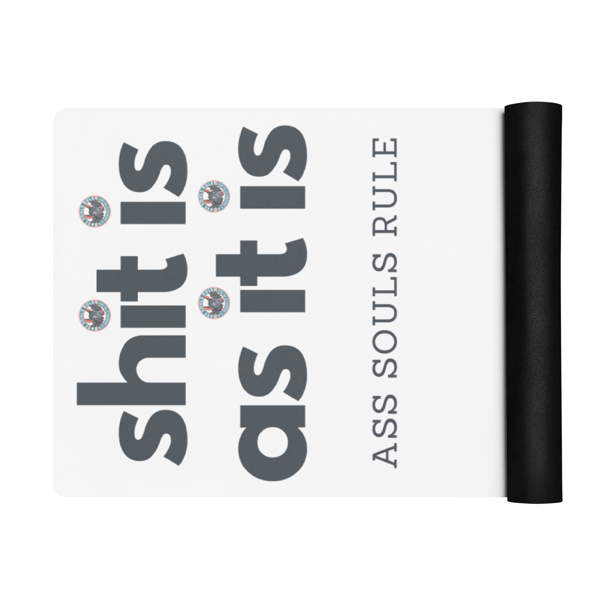 Whether you’re exercising your shit out, stretching to get a better look at shit, or meditating becoming one with your shit, it’s worth having a Shit Is As It Is yoga mat that brings a smile to your face and matches your style. It’s easy to carry and provides both stability and comfort with anti-slip rubber on the bottom and soft microsuede on top.