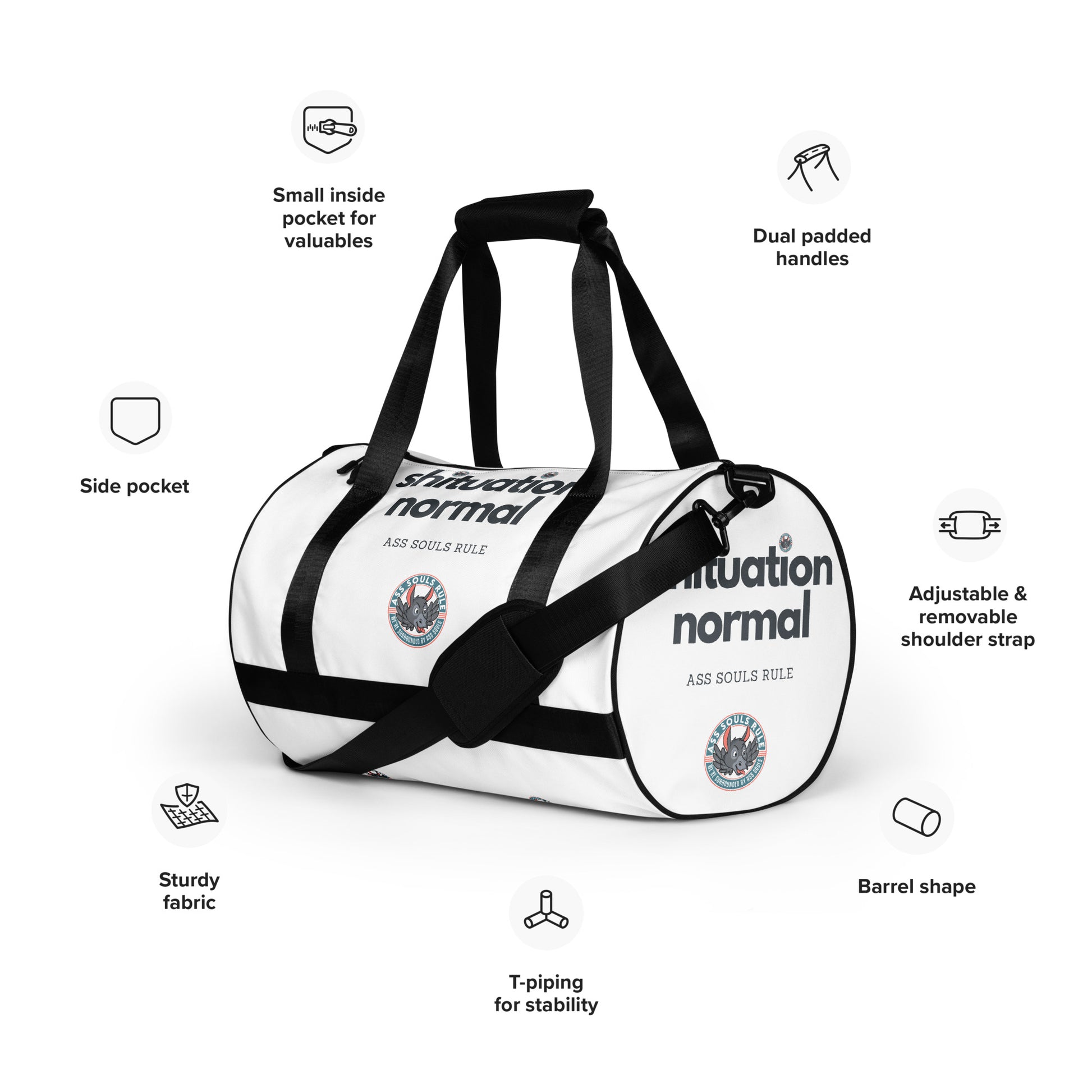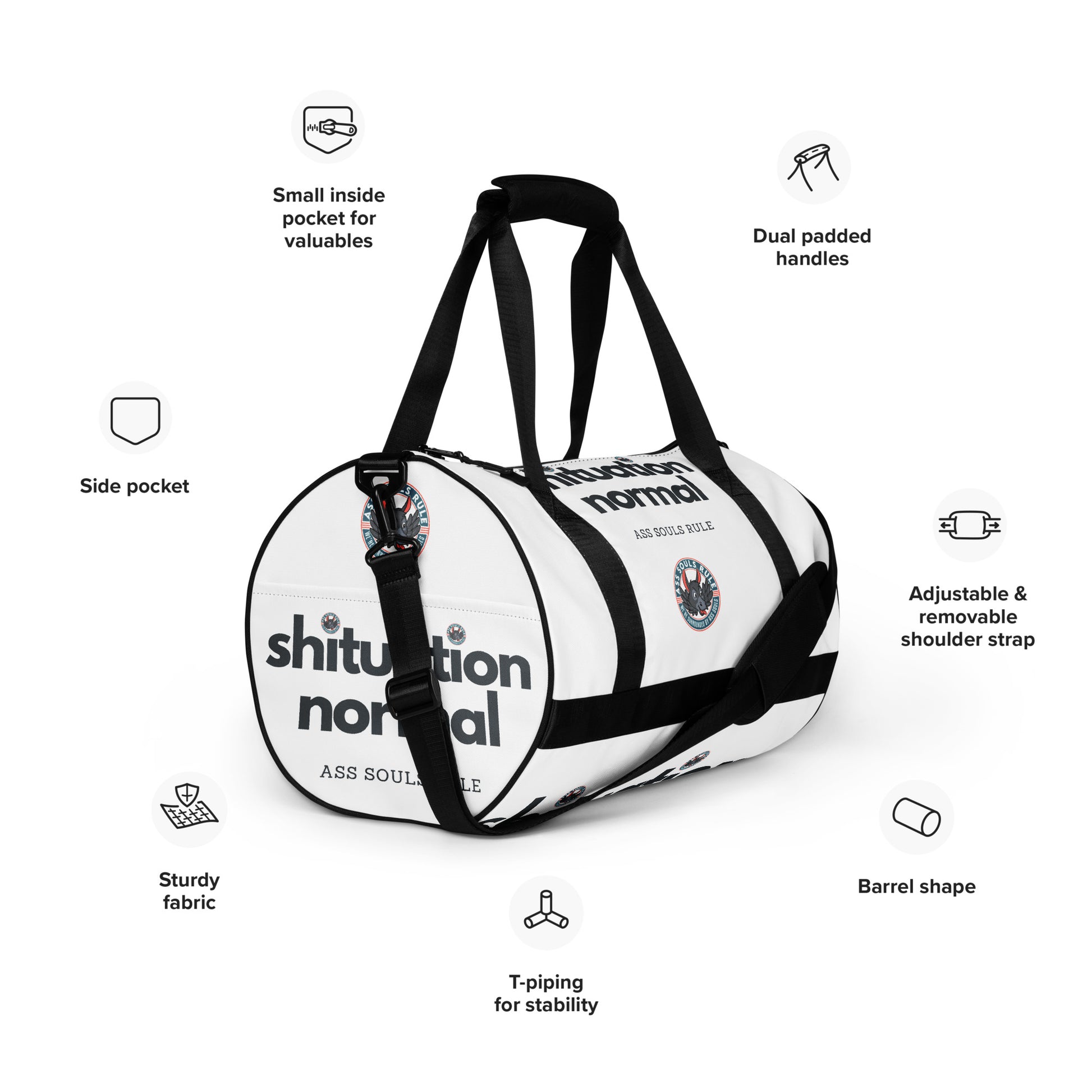 Ready to get your Game of Life fitness on while playing with your Ass Souls? Add some punch to pumping iron with this Shituation Normal all-over print gym bag. Made from 100% polyester and sturdy, water-resistant fabric, this bag is fun meets function. And it’s got pockets!