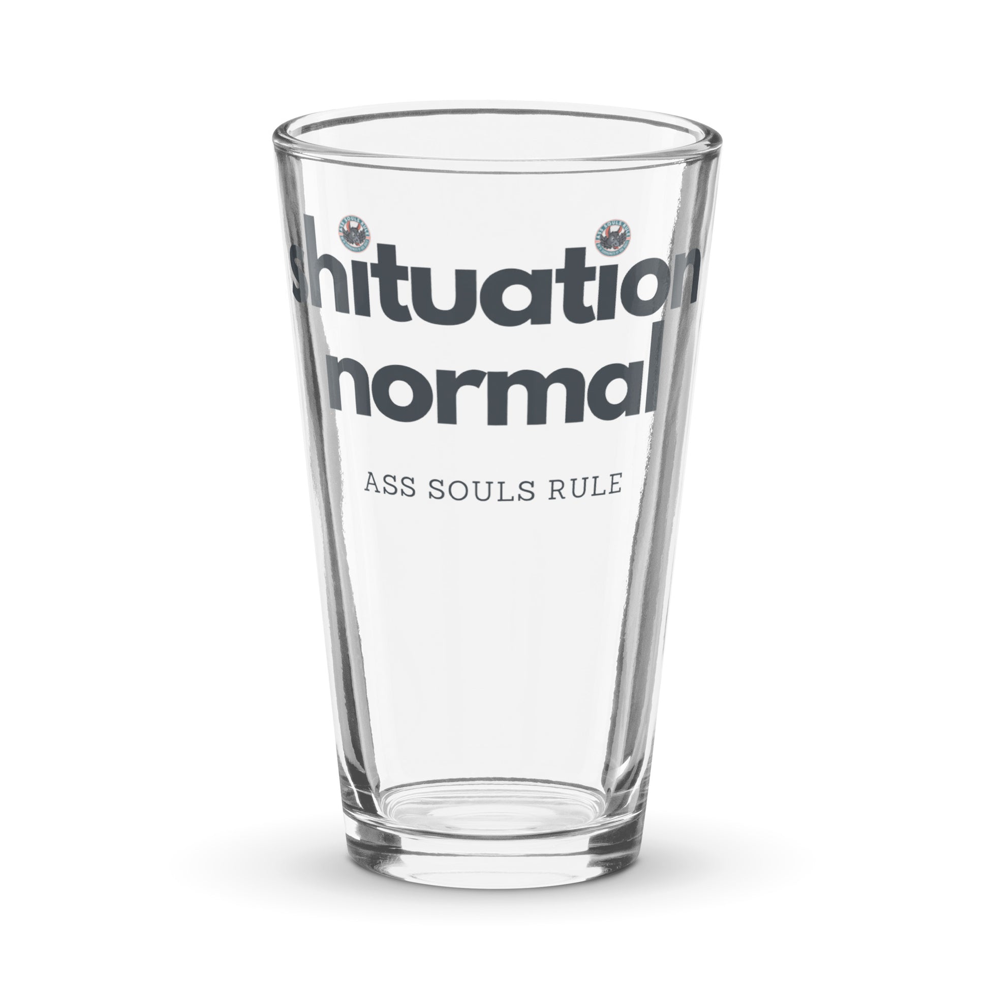 Enjoy your refreshing drinks in this Shituation Normal shaker pint glass! It can hold up to 16 oz and will be a durable, high-quality addition to your ASR glassware collection. What’s more, you can even use it as a mixing glass for cocktail evenings or for some rootbeer floats for those little Ass Souls.