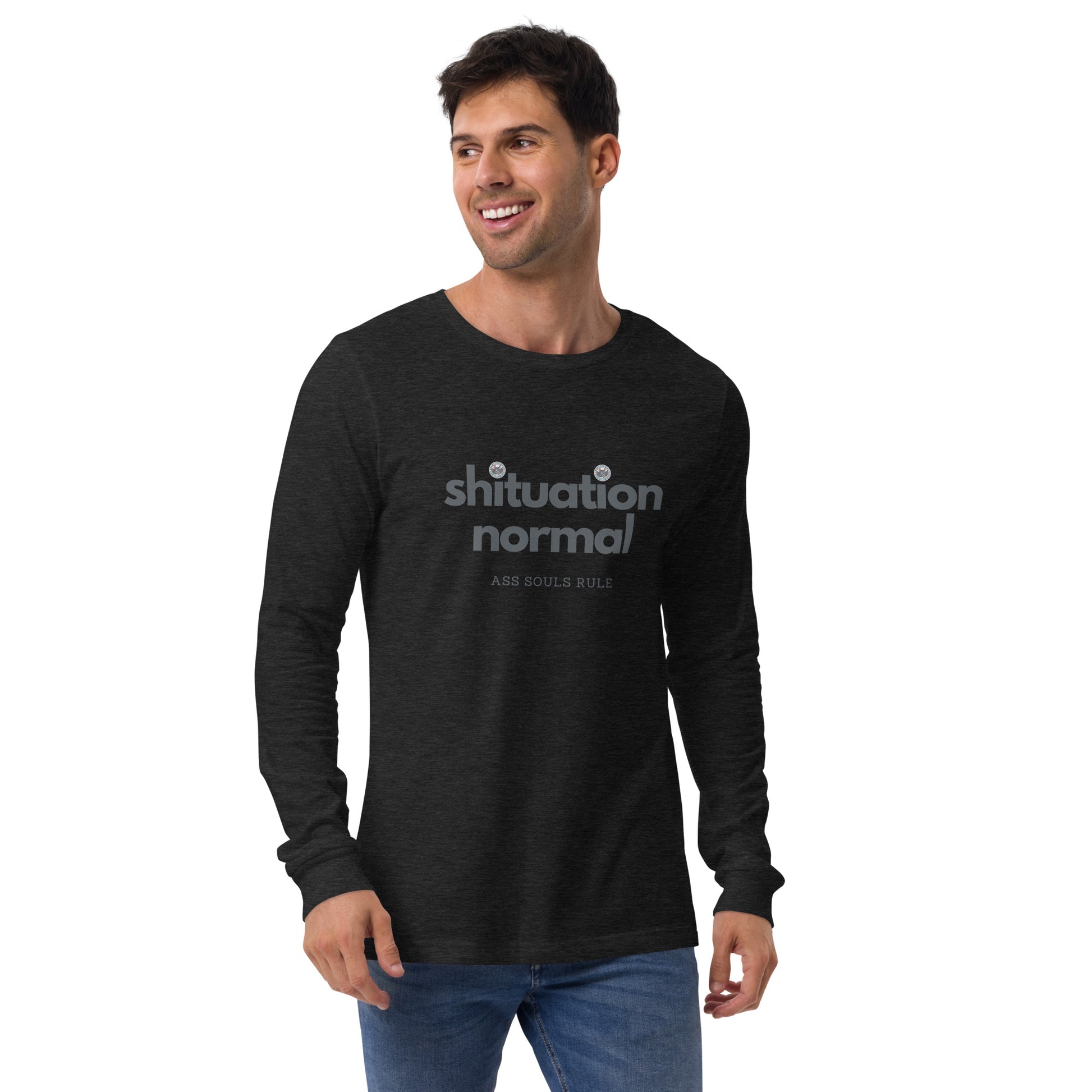 Enrich your ASR wardrobe with a versatile Shituation Normal long sleeve tee. For a casual look, combine it with your favorite jeans, and layer it with a button-up shirt, a zip-up hoodie, or a snazzy jacket. Dress it up with formal trousers or chinos to achieve a more professional look. Shituation Normal everywhere.