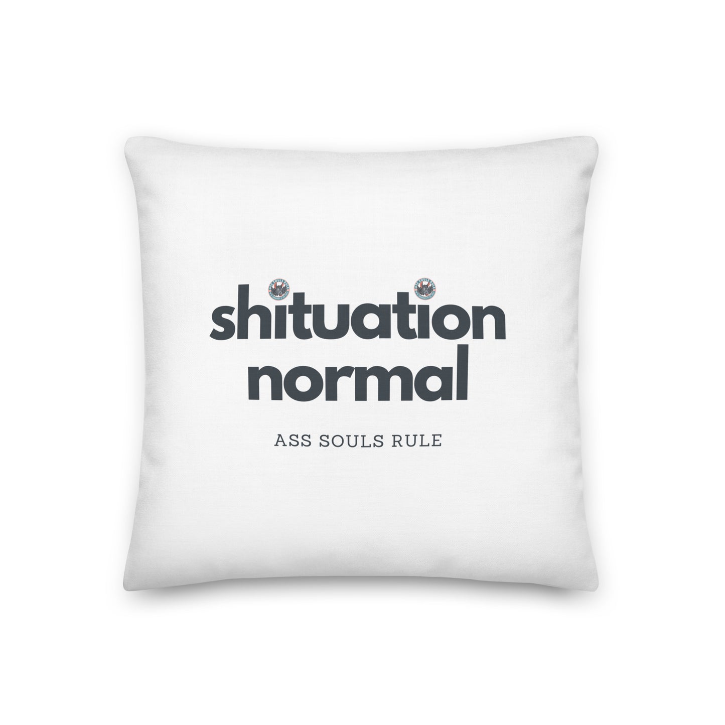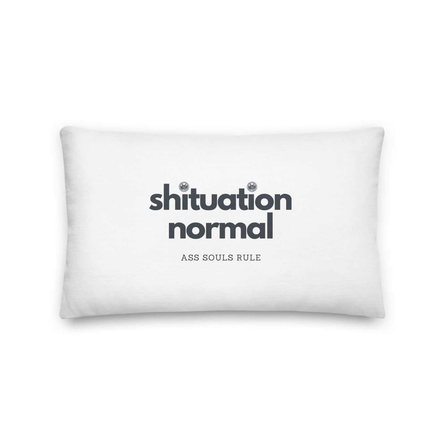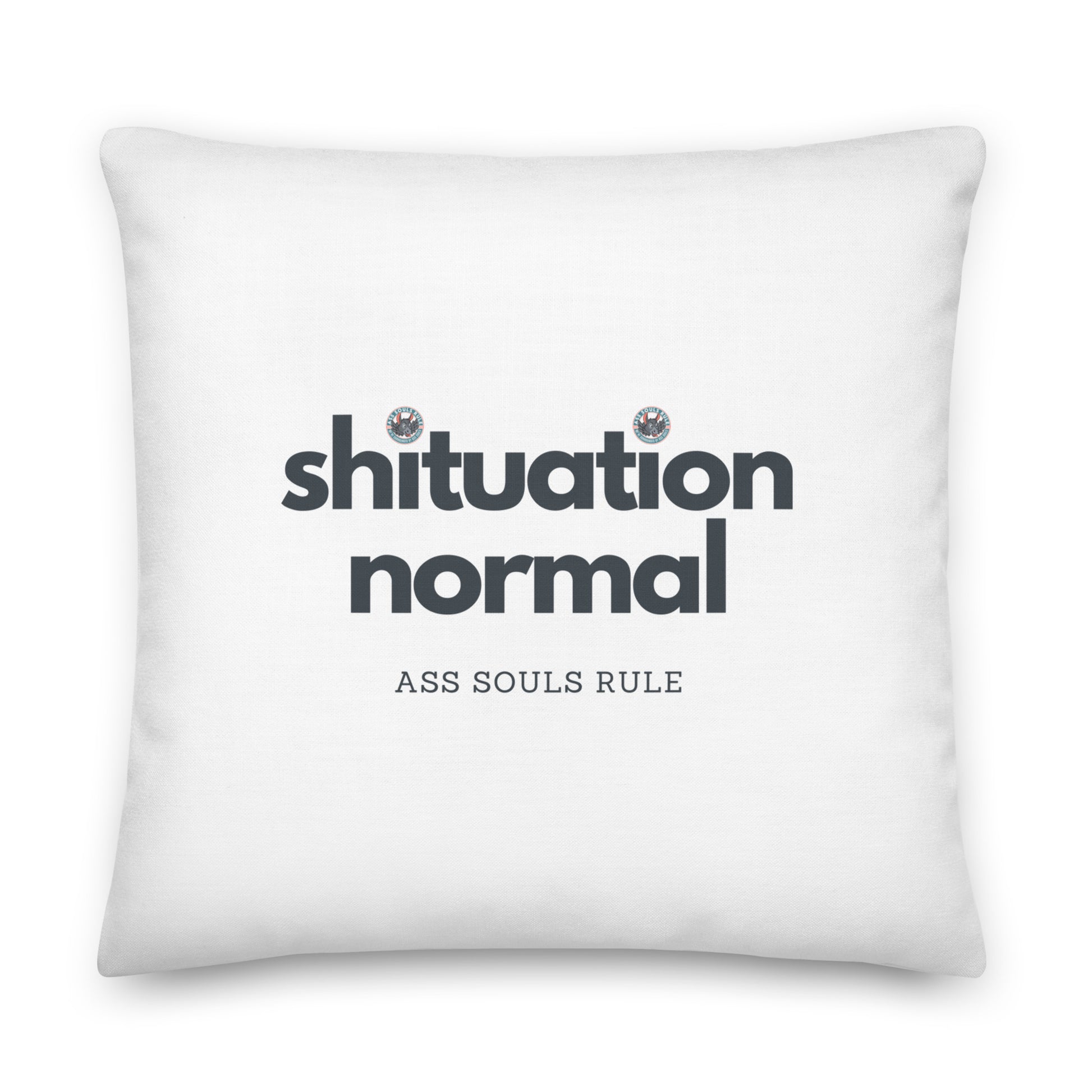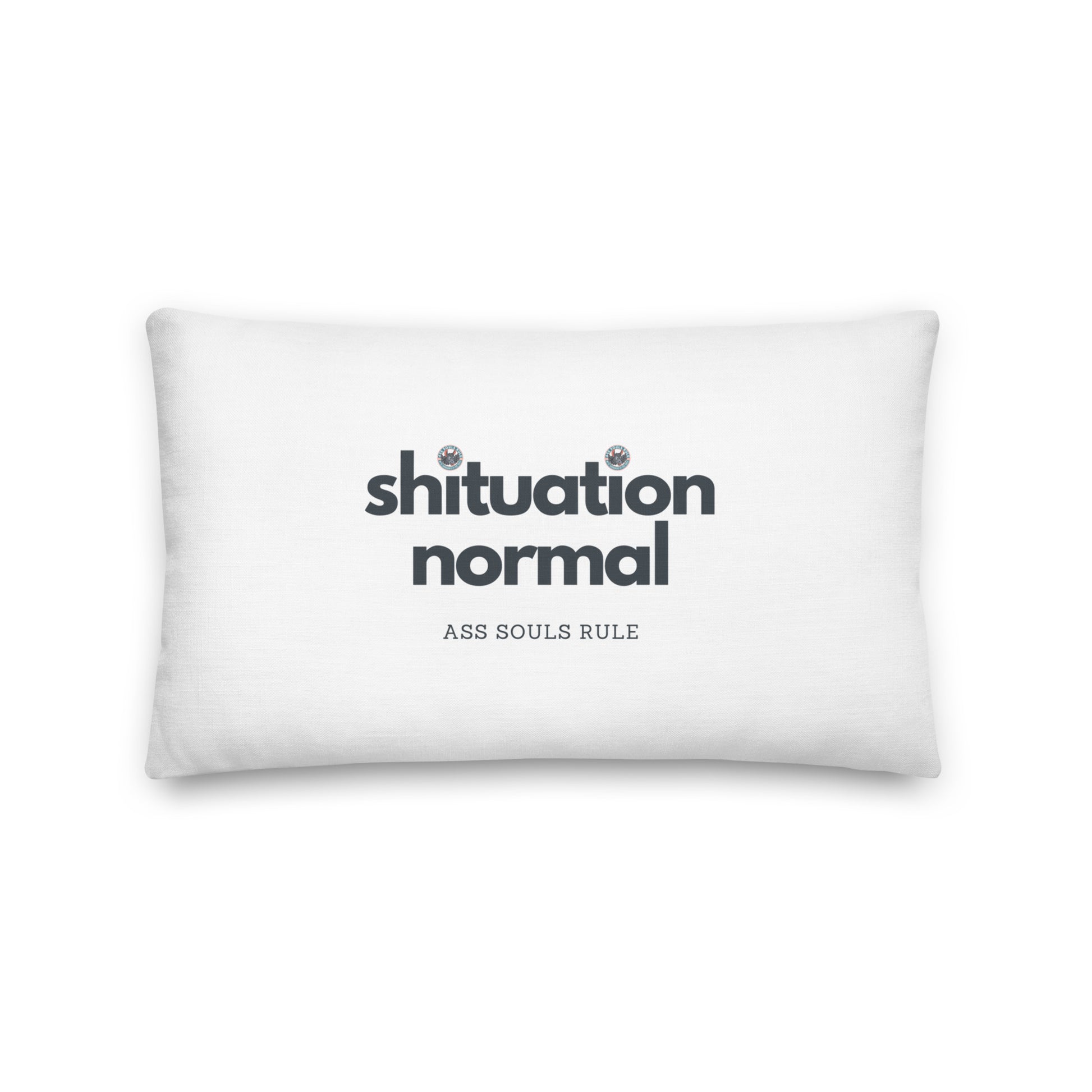 Want to add a splash of Ass Souls Rule to your home or need a house warming gift? This Shituational Normal premium feel pillow with a shape-retaining insert is just what you're looking for! It'll make any room luxurious, gift a good laugh, and/or provide the perfect excuse for a quick power nap knowing that it is Shituational Normal.