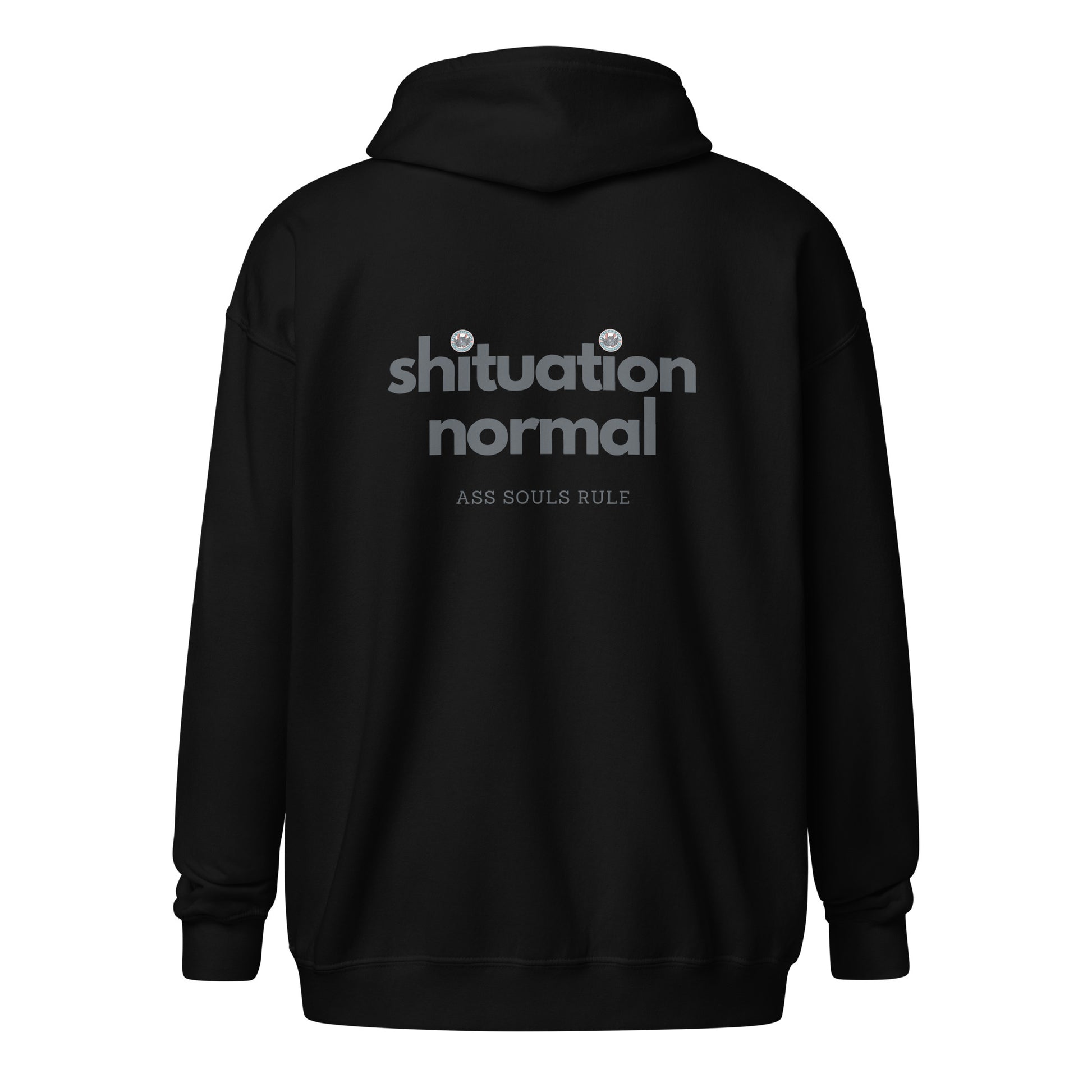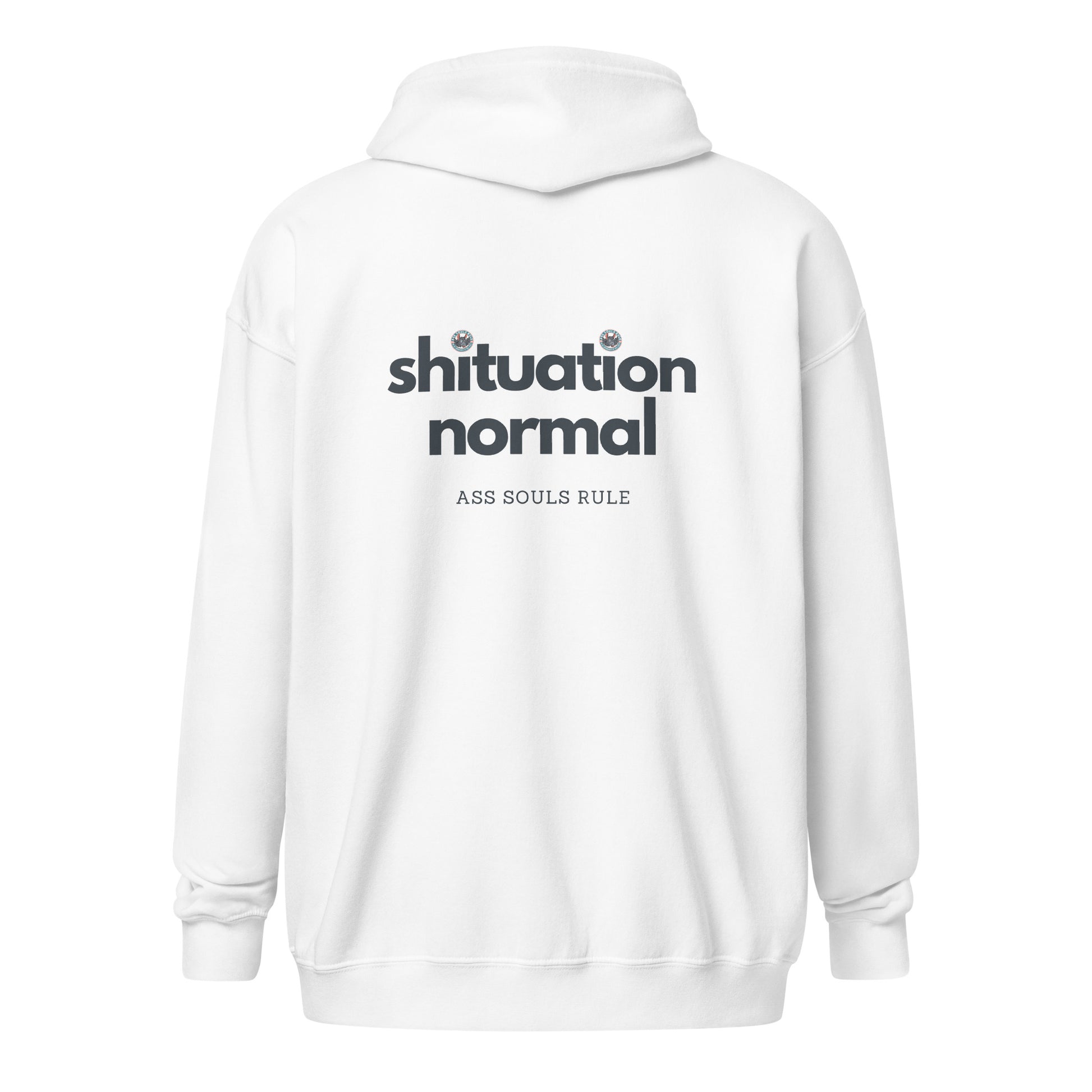 Designed with ASR style and comfort in mind, this Shituational Normal hoodie will quickly become your new ASR favorite. It’s made from soft fleece inside and outside, with a sturdy metal zipper, convenient front pockets, and a hood with color-matched drawstrings.
