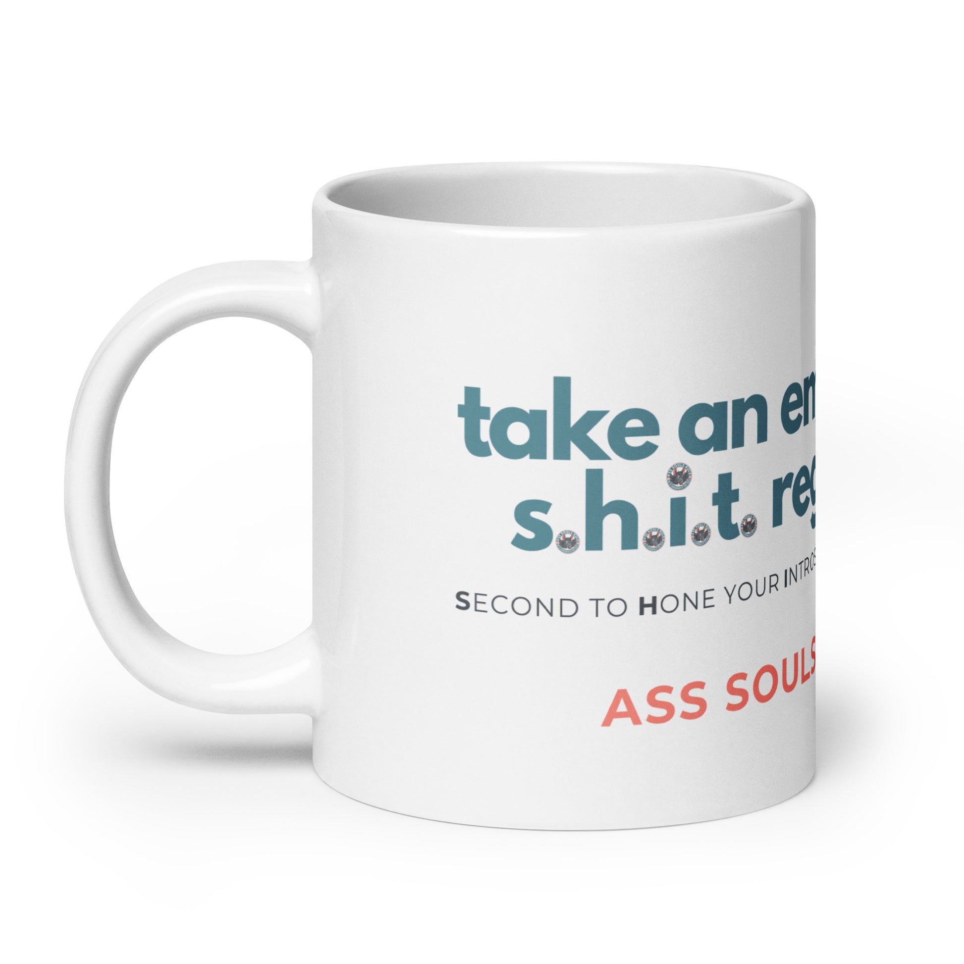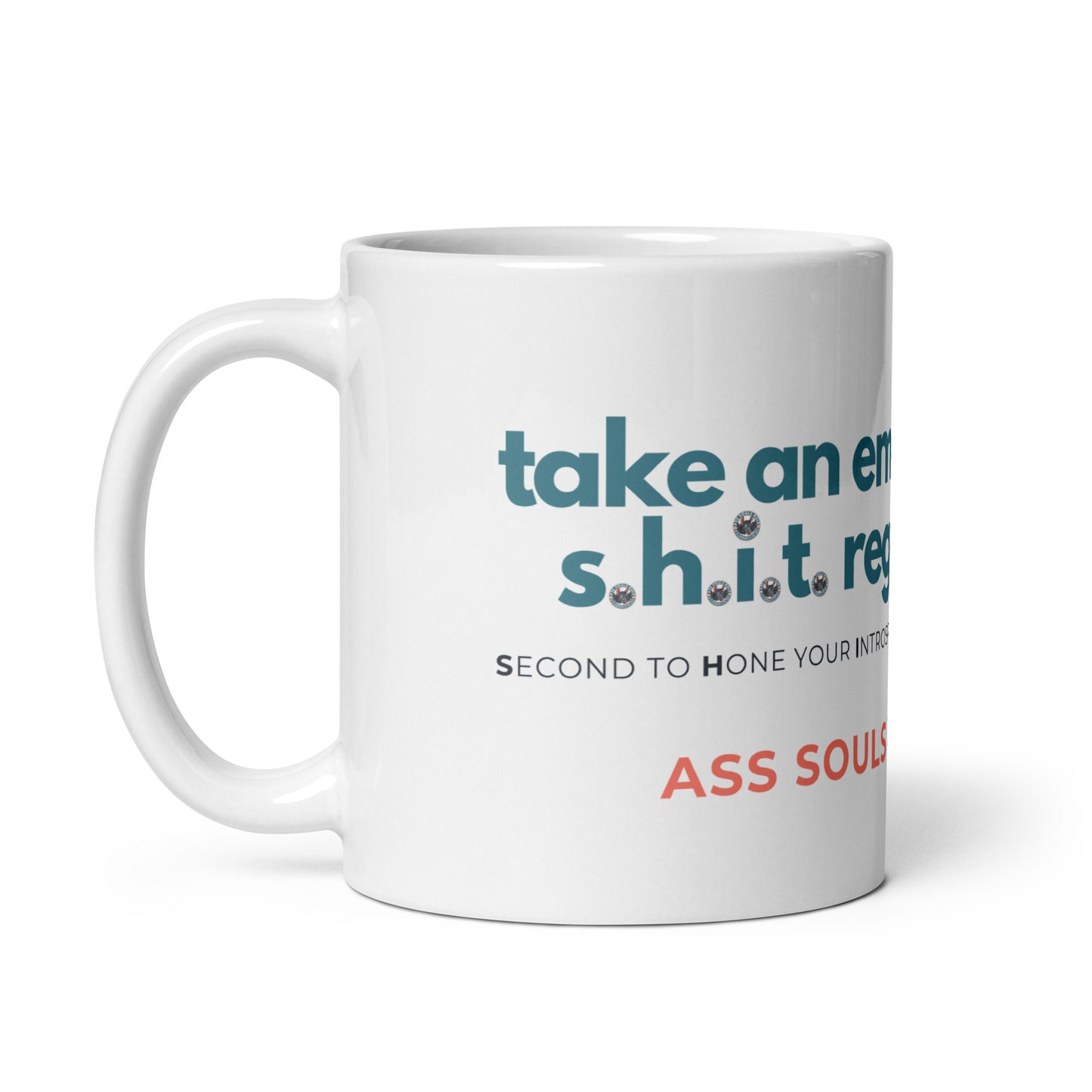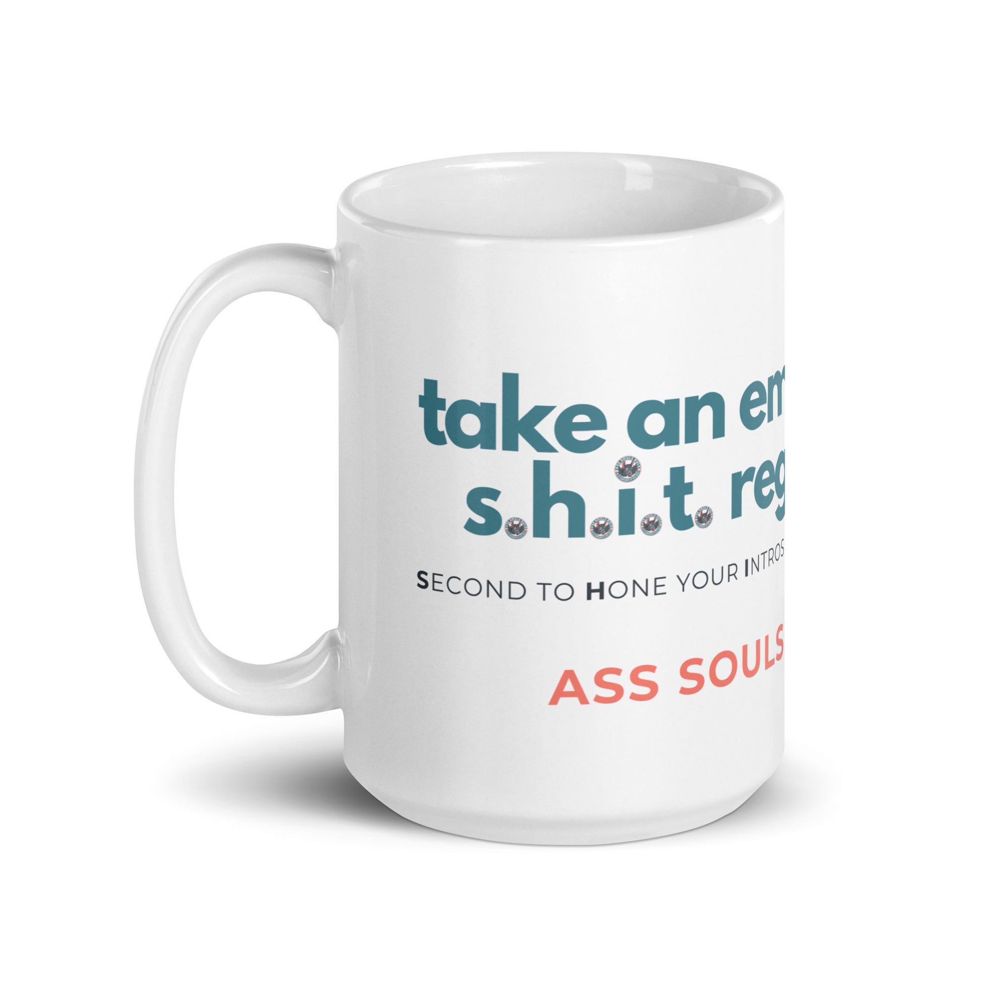 Whether you're drinking your morning coffee, evening tea, or something in between—this mug's a reminder for you to take an emotional s.h.i.t. regularly! It's sturdy and glossy with a vivid print that'll withstand the microwave and dishwasher. It may or may not withstand Ass Souls.