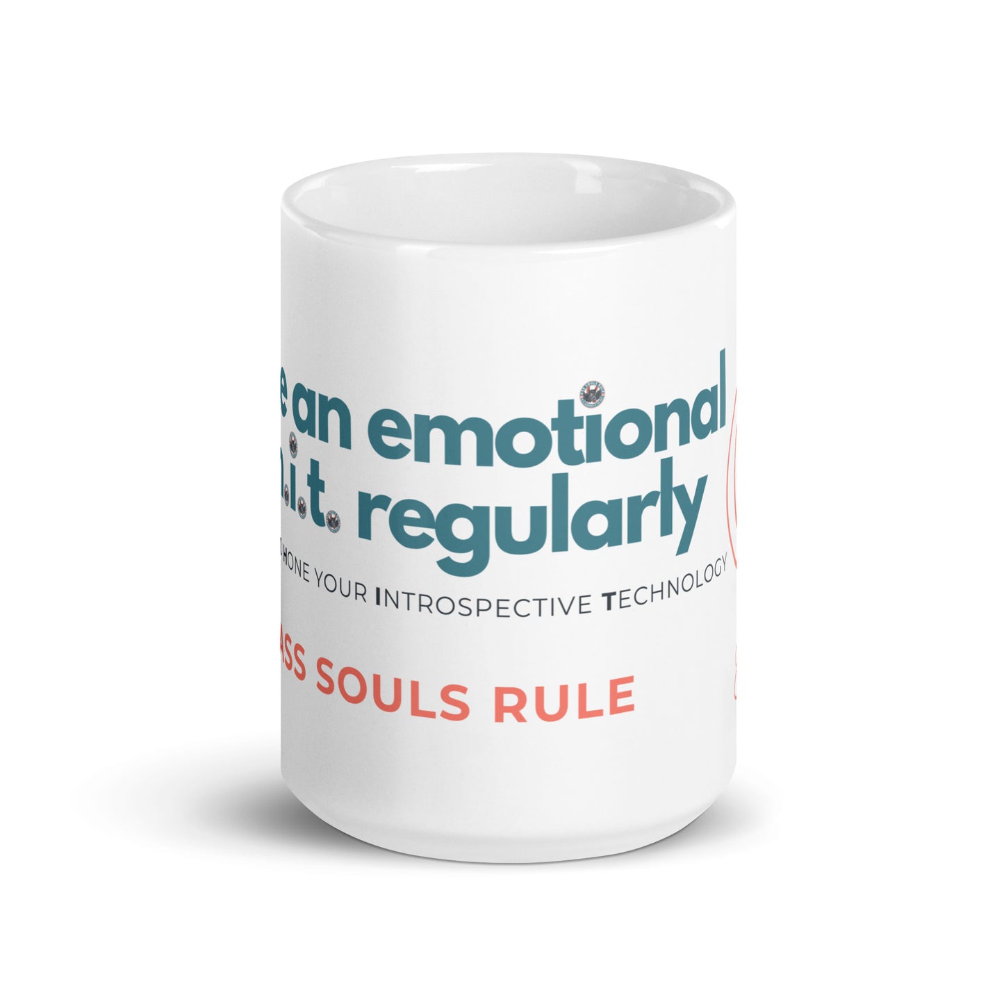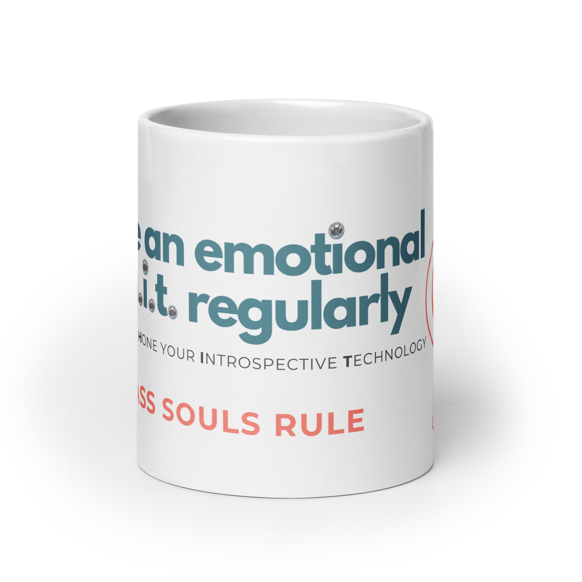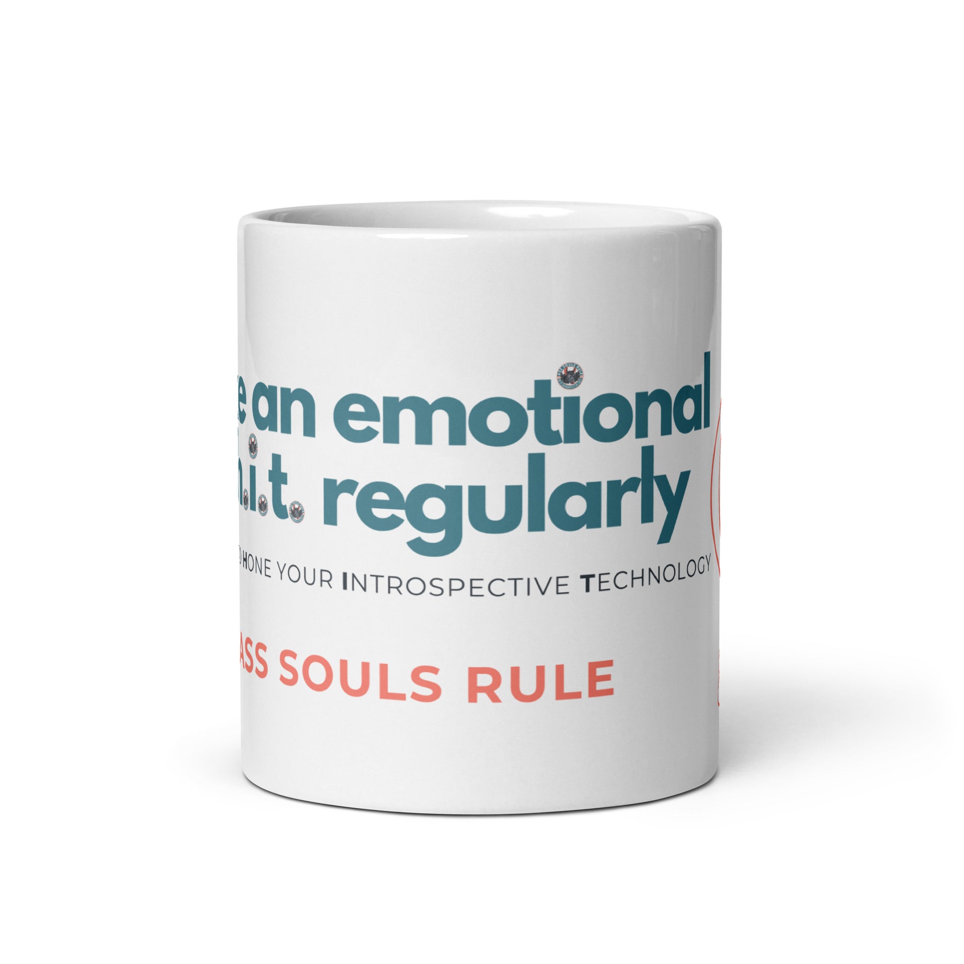 Whether you're drinking your morning coffee, evening tea, or something in between—this mug's a reminder for you to take an emotional s.h.i.t. regularly! It's sturdy and glossy with a vivid print that'll withstand the microwave and dishwasher. It may or may not withstand Ass Souls.